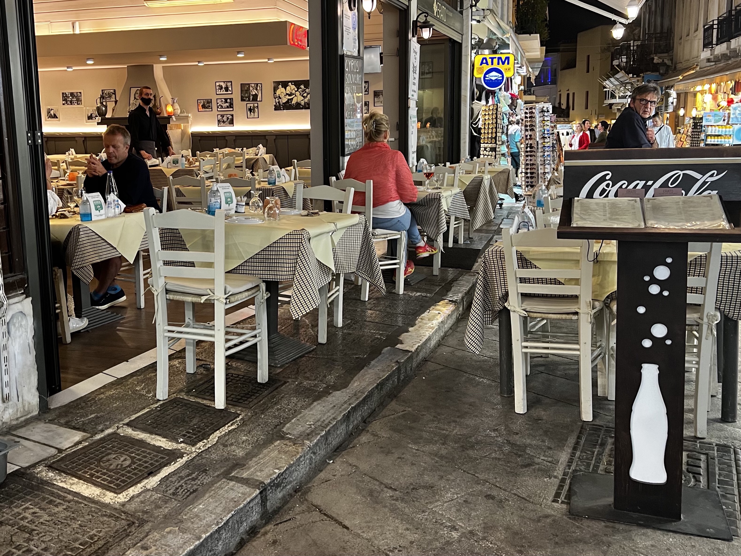 pedestrians into the street. The three dinners I have had have been delicious and it is fun sitting on the sidewalk at 9 when the evening gets started in Athens and watching the people, mostly tourists I’m guessing, walk by. Tonight I sat in the Epato Cafe on brightly lit street catering to