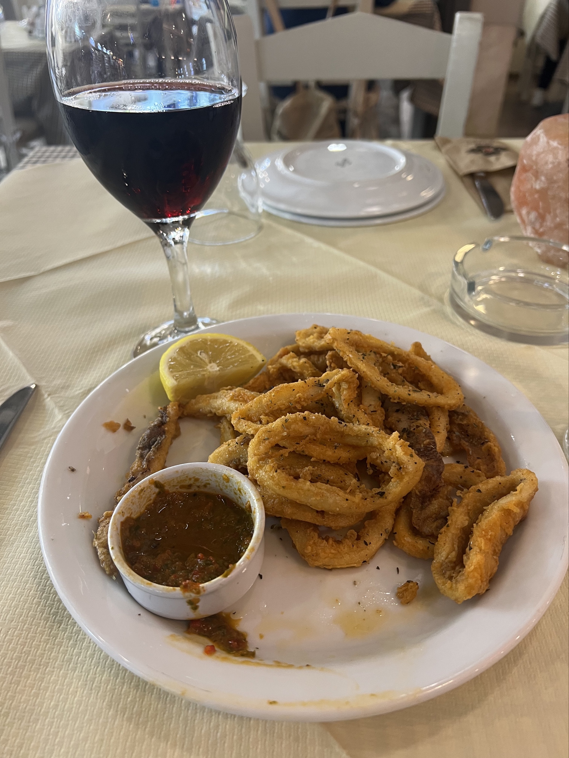 tourists. I had delicious fried squid, calamari, about $10, which I messed up a bit before remembering to take a photograph and a large glass of red wine.