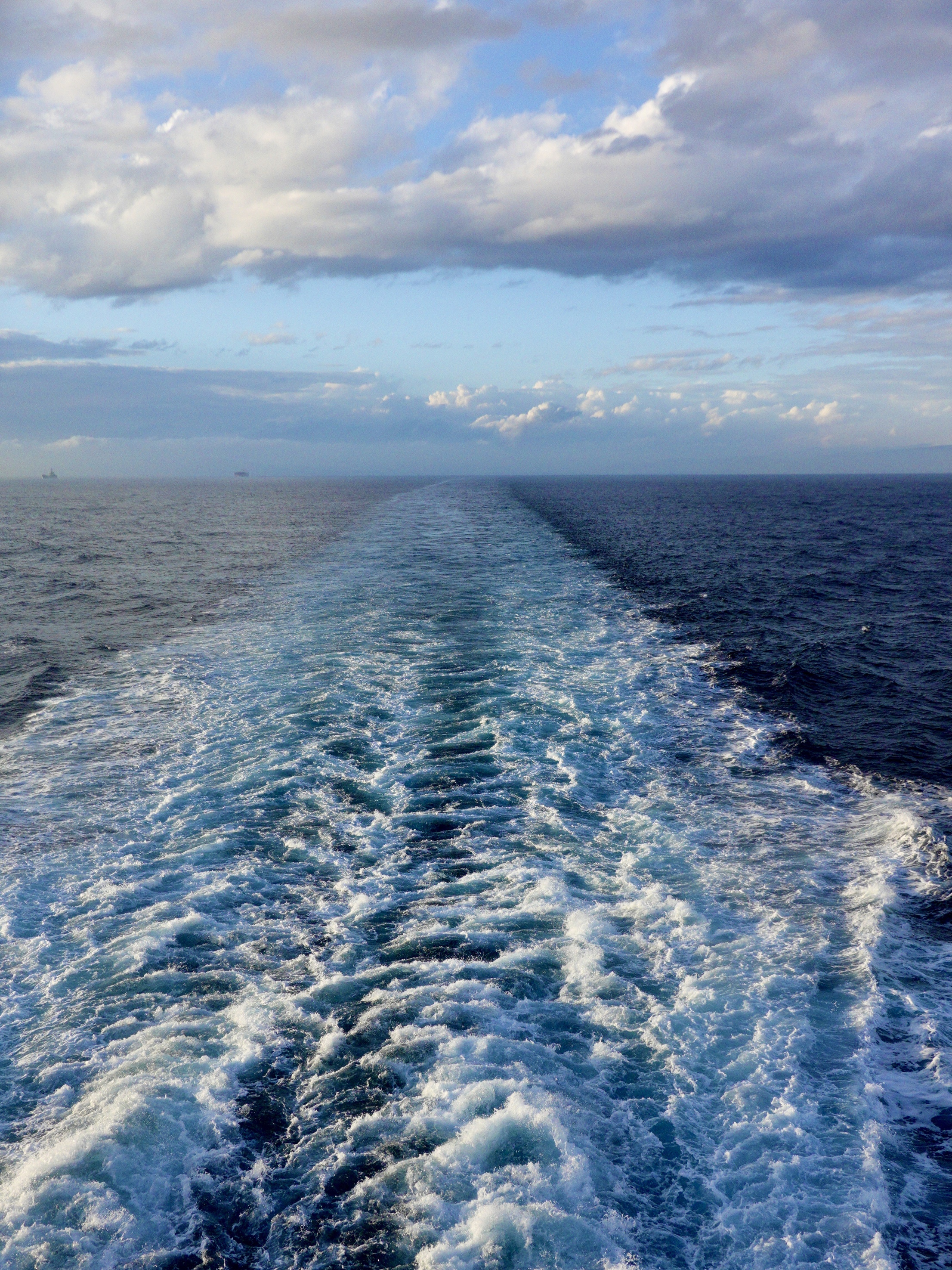 deck covered by a roof and were able to watched Piräus and Athens fade into the distance. We passed island after island that were bathed in the misty glow of the sunset. The huge roiling white wake stretched behind us into the distance. Just to be crossing the Mediterranean was