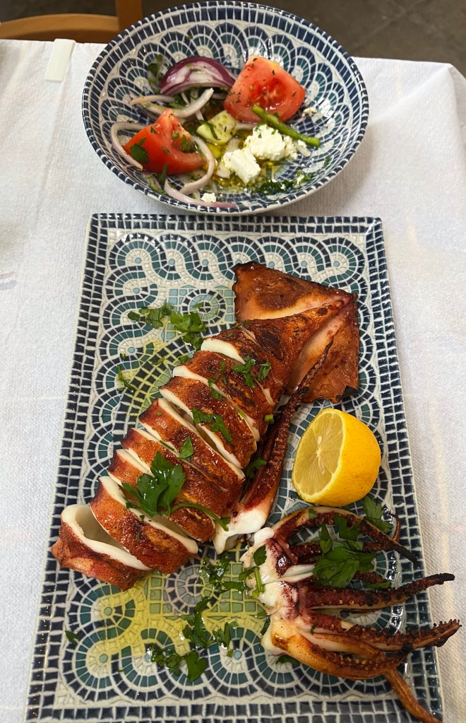 Susie arrived three hours late caused partly by an overbooking on her American Airlines flight from New York to Athens. To pass the time I ordered calamari, squid, and this time it was laid out whole with a flat