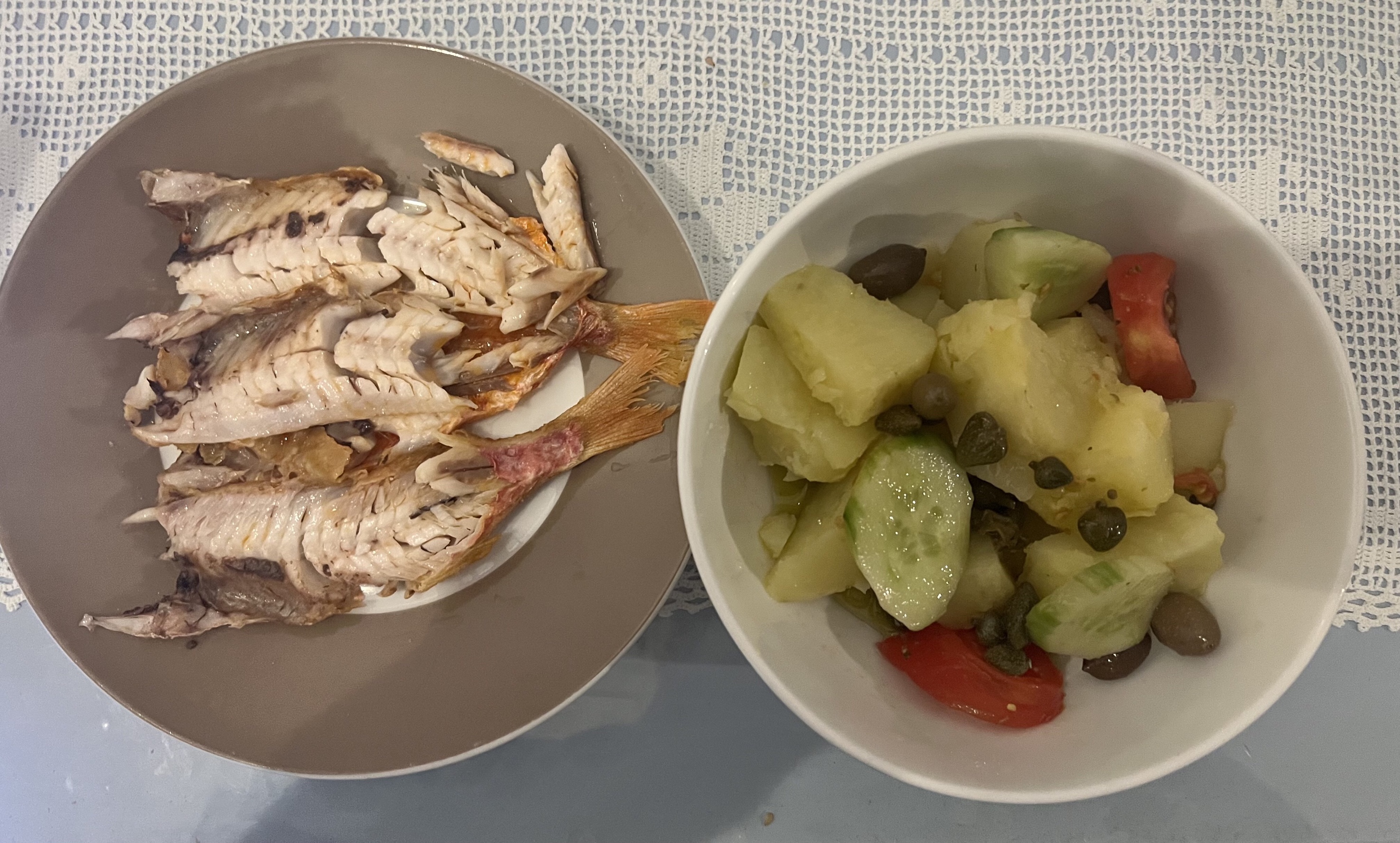 Last night I cooked my first meal, spaghetti with ready made sauce from a bottle, a huge bowl which I really enjoyed at 6, the American dinner hour. And then at 9, Greek dinner time, Efi climbed the steps with two (quite bony) fish, but delicious, and a bowl of vegetable salad with boiled potatoes and cucumber and tomatos with anchovies and olives with a vinegar dressing.