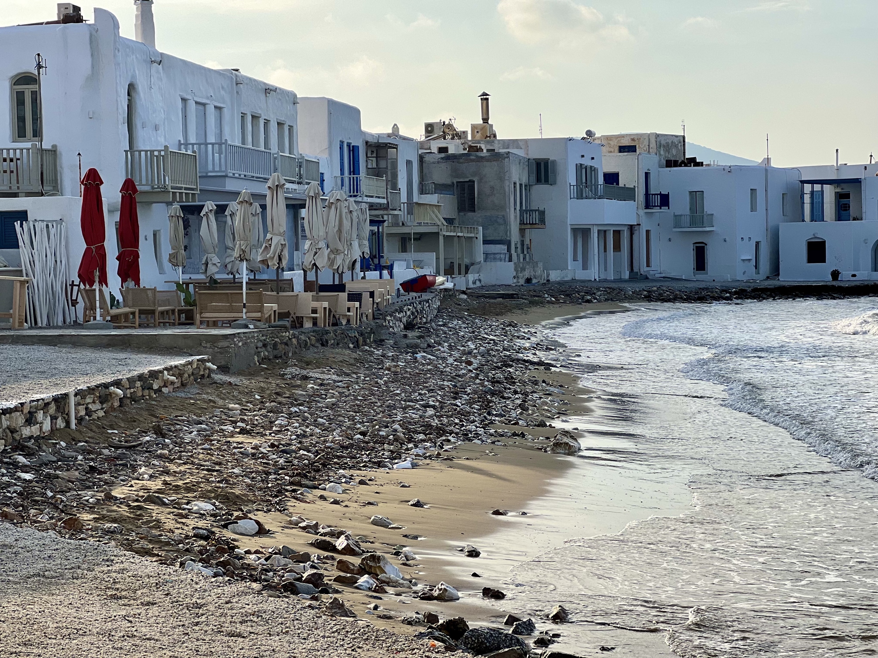 I went yesterday at 4 p.m. to the cafe with comfortable, stylish chairs and tables under awnings at the waters edge where the day before the small waves lapped against the beach. The water was crystal clean and a man was going swimming.