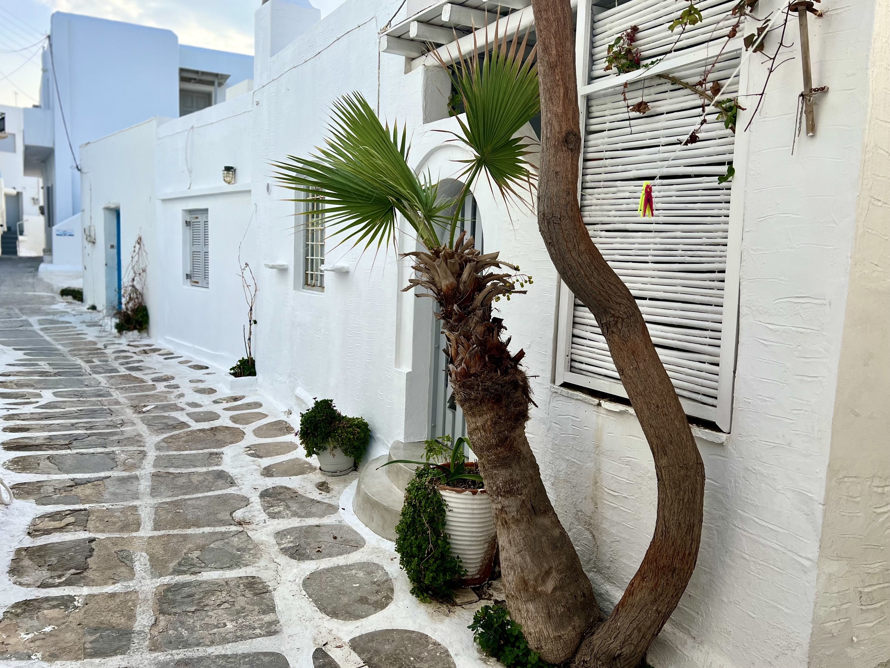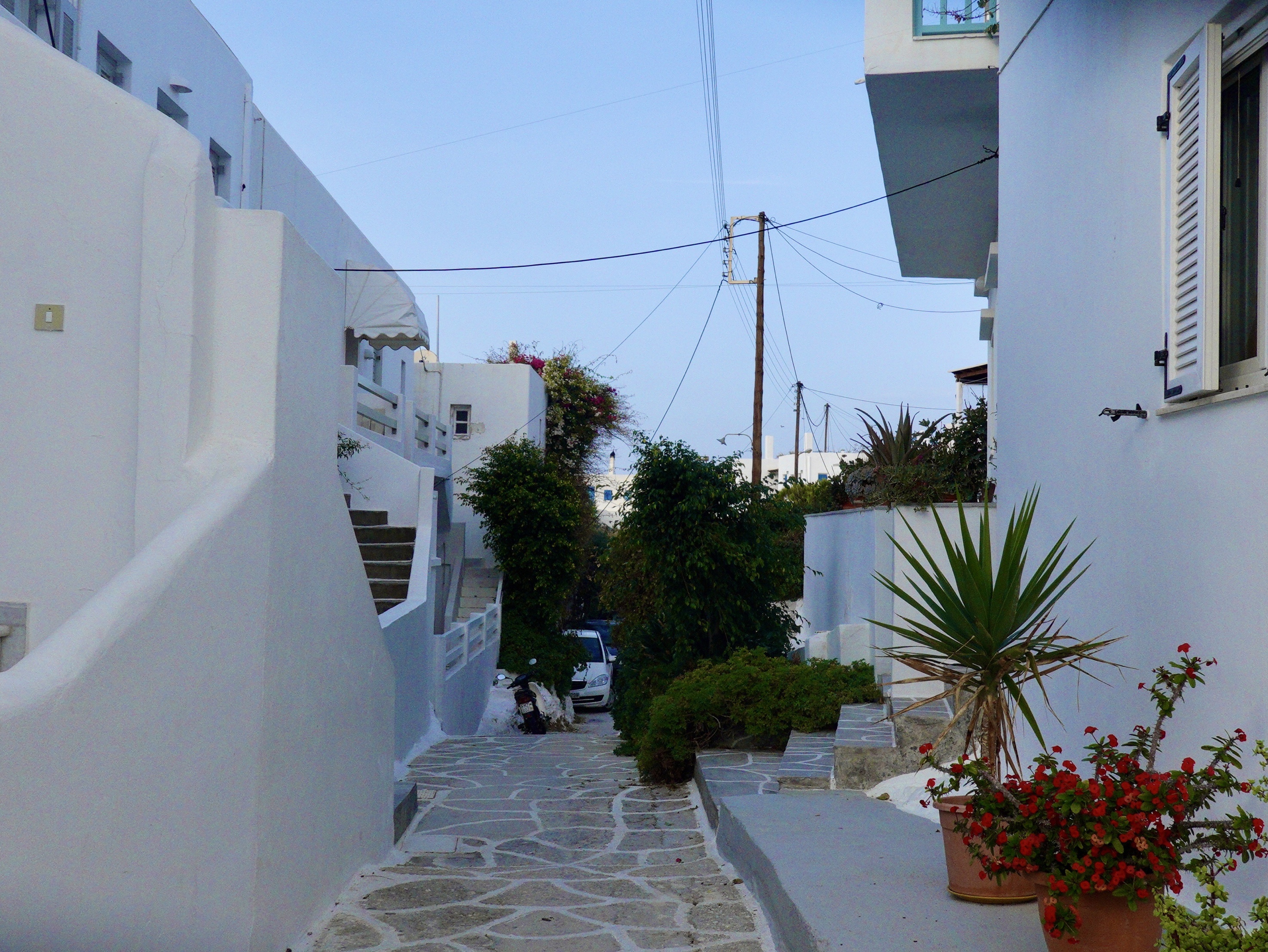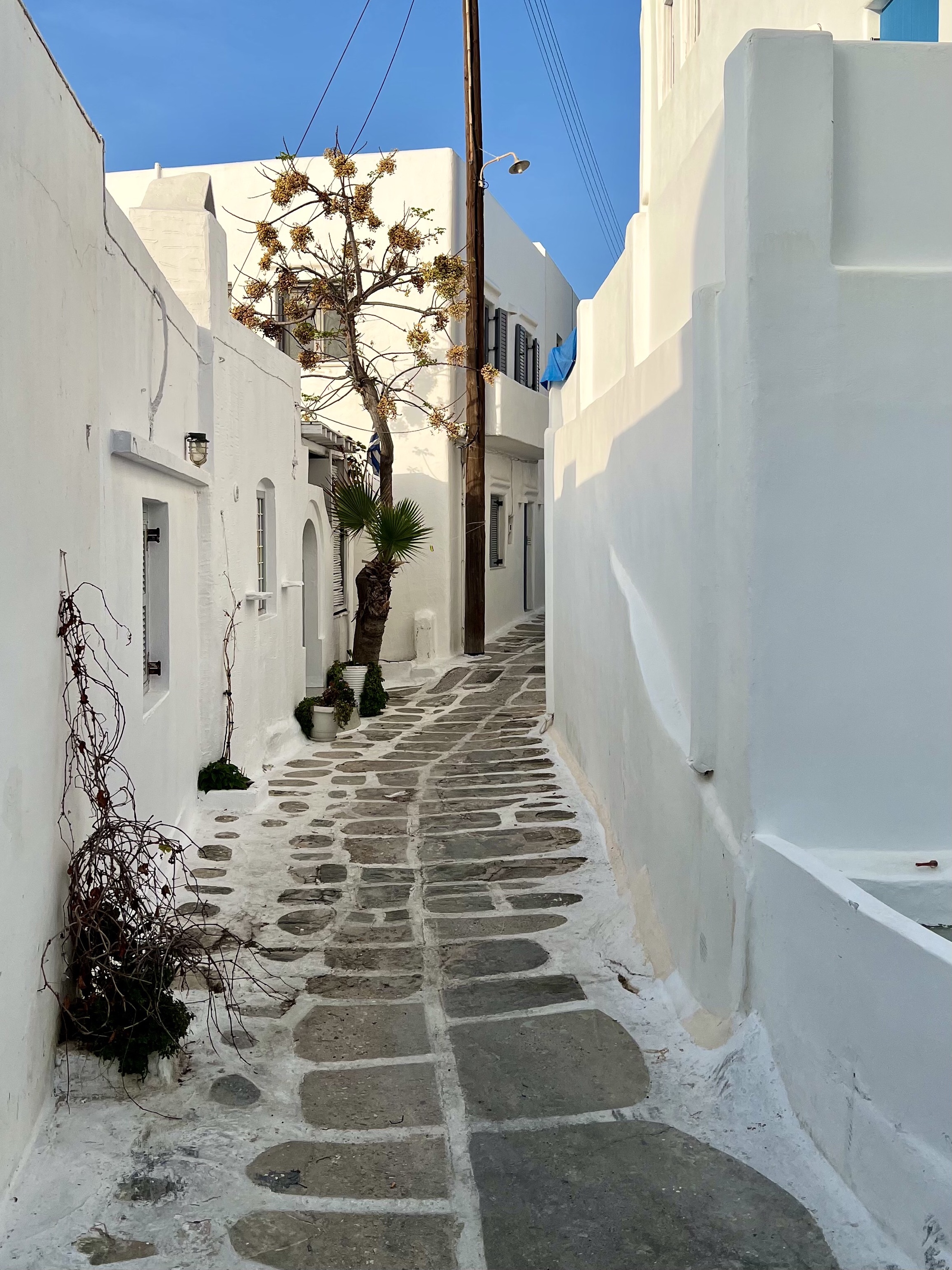 But what I delight in here is everyone agreeing to do the same thing, agreeing to have only white houses and agreeing to paint around the paving stones in front of the house. They didn‘t do this for tourists although they must be aware that tourists come partly for all this whiteness. They don’t even agree to do it, they can’t imagine not doing it. They have always done this on Paros, I‘m sure. They do it because everyone does it and they have always done it.