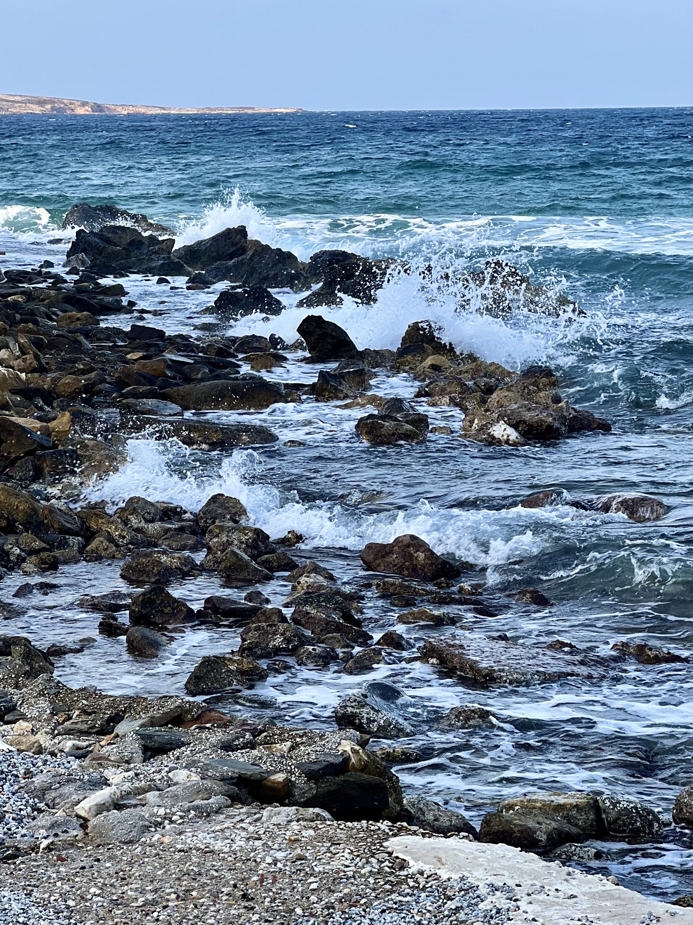 I was disappointed. I walked instead up to the large church on the hill at the center of town, the only prominent building in town, a cathedral on a hill. This time I walked down the hill beyond the church and came to the sea again and discovered that there was a faint footpath that ran along the rocky shore above eaten away cliffs against which the waves beat and splashed white against the black rocks.
