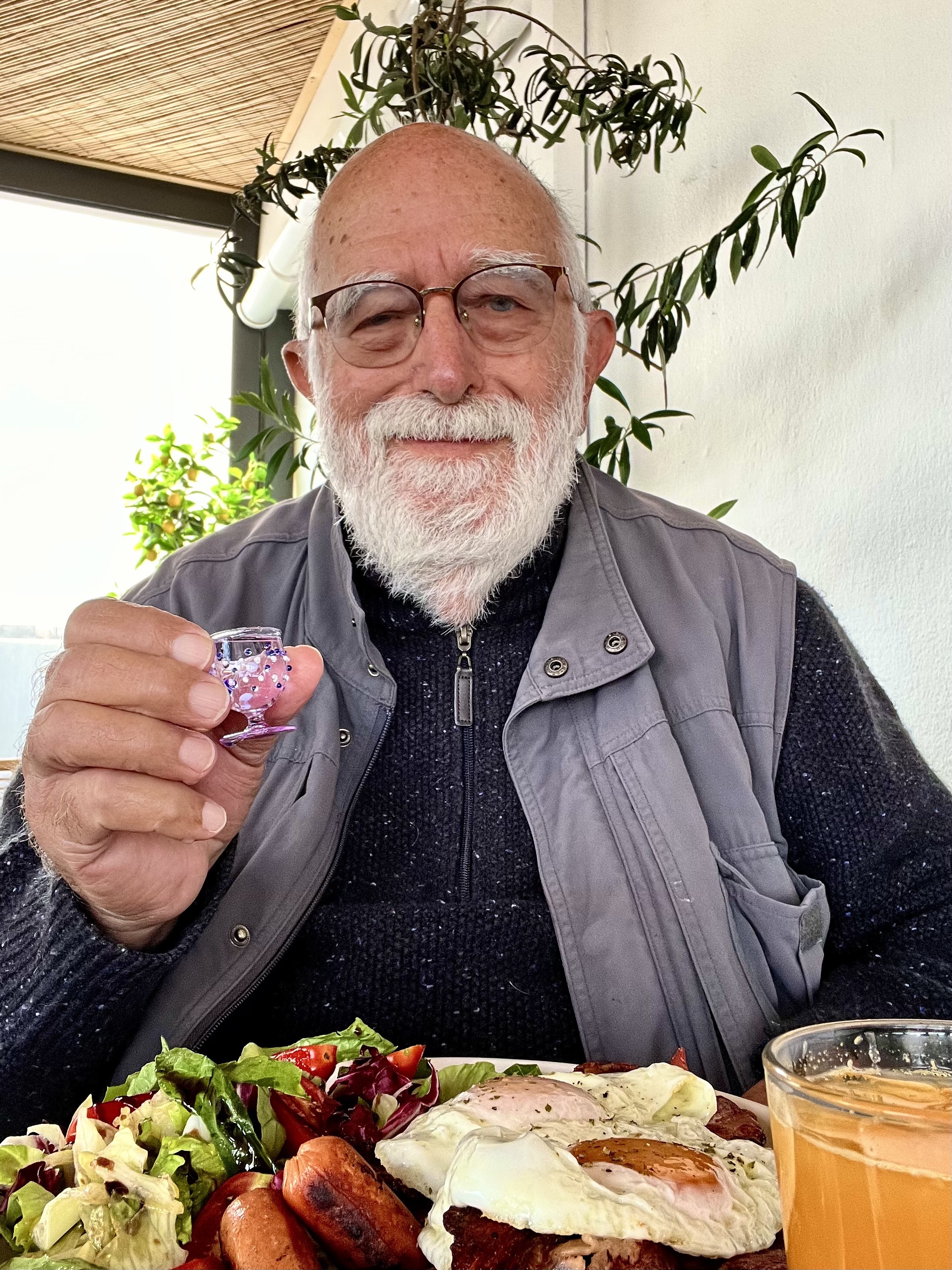 The day before yesterday was my son Tom‘s birthday, yesterday was Kathe‘s 82nd birthday. We always celebrate them together. Yesterday we didn‘t. Instead, I went to Ragoussis cafe and had a celebratory, sumptuous breakfast by myself, drinking an ouzo toast to Kathe, ouzo which Susie had left for this day from a tiny glass that Susie had found when she spent a week at Penland just before we left and knew Kathe would love. I was an invisible old man drinking ouzo from a tiny glass in a corner of the cafe, no one knowing why or caring.