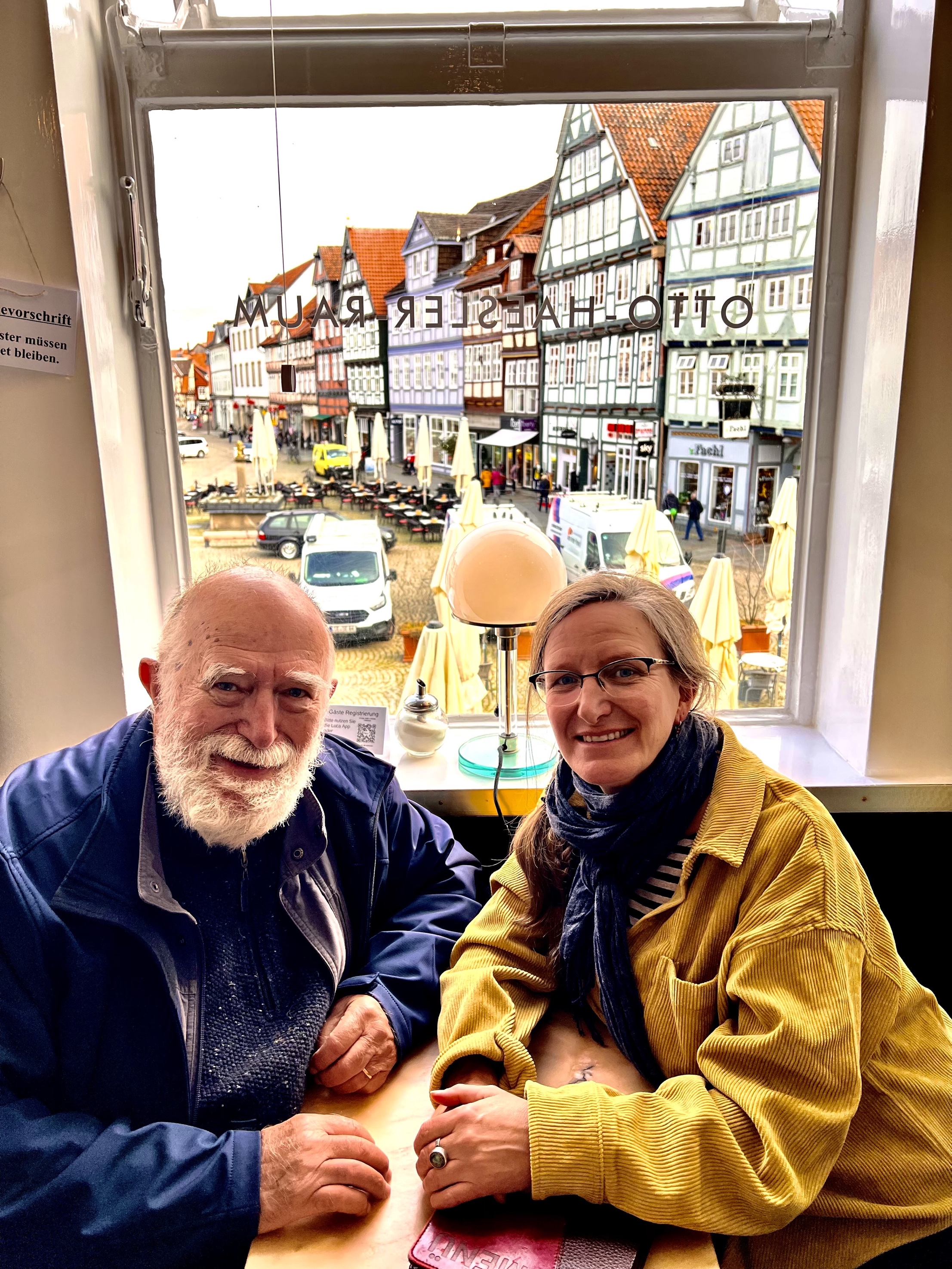 But yesterday, a gloomy, cloudy day, the delight that I have always felt when walking through Celle was muted because this was my first visit back since Volker, Kathe’s brother, whose town this was, died. Dettmer Mueller is a large elegant department store close to the white Schloss where Sophia Dorothea lived as a girl. For most of his life Volker was responsible for the window displays at Dettmer Mueller and for presenting the store in the best way, a very important job, as important as decorating the Fifth Avenue windows of Lord and Taylor in New York. After retiring he went along on boat trips on the owner’s yacht to Denmark and they had wild adventures with each other. My son Tom and his family spent a wonderful ten days in Celle with Volker hosting us ten or so years ago. And I and Susie have walked the streets with Kathe looking in on elegant store after elegant store. Susie showed me some of Kathe’s favorite shops yesterday.