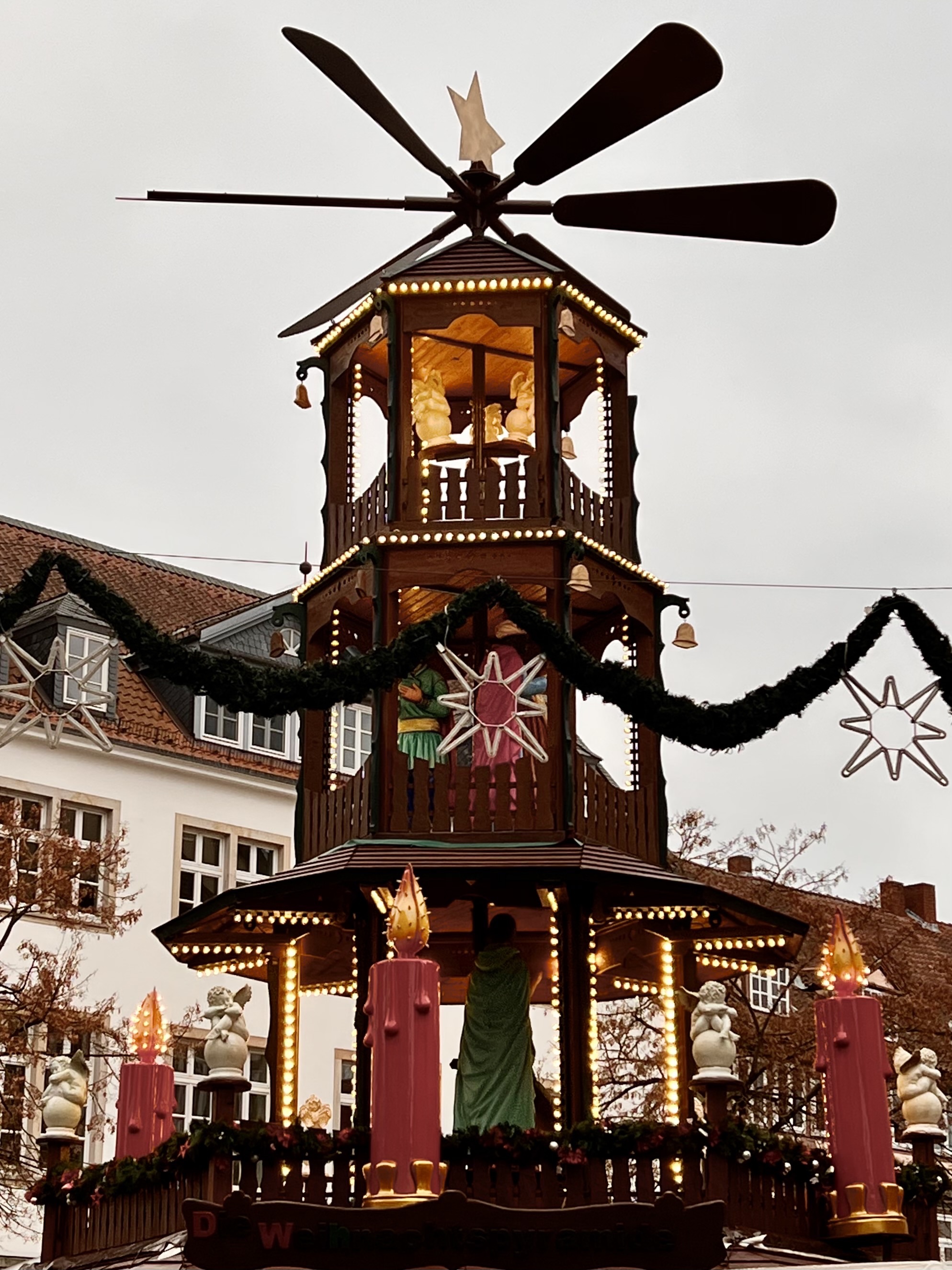 Then I wandered around Celle all day. The Saturday morning vegetable market was in full swing, the streets were full of shoppers, and the very elaborate Christmas decorations were being erected. There was a giant 30 foot replica of a common German table top pyramid of wooden painted figures circling because the heat of candles made the slanted blades at the top rotate the whole display.