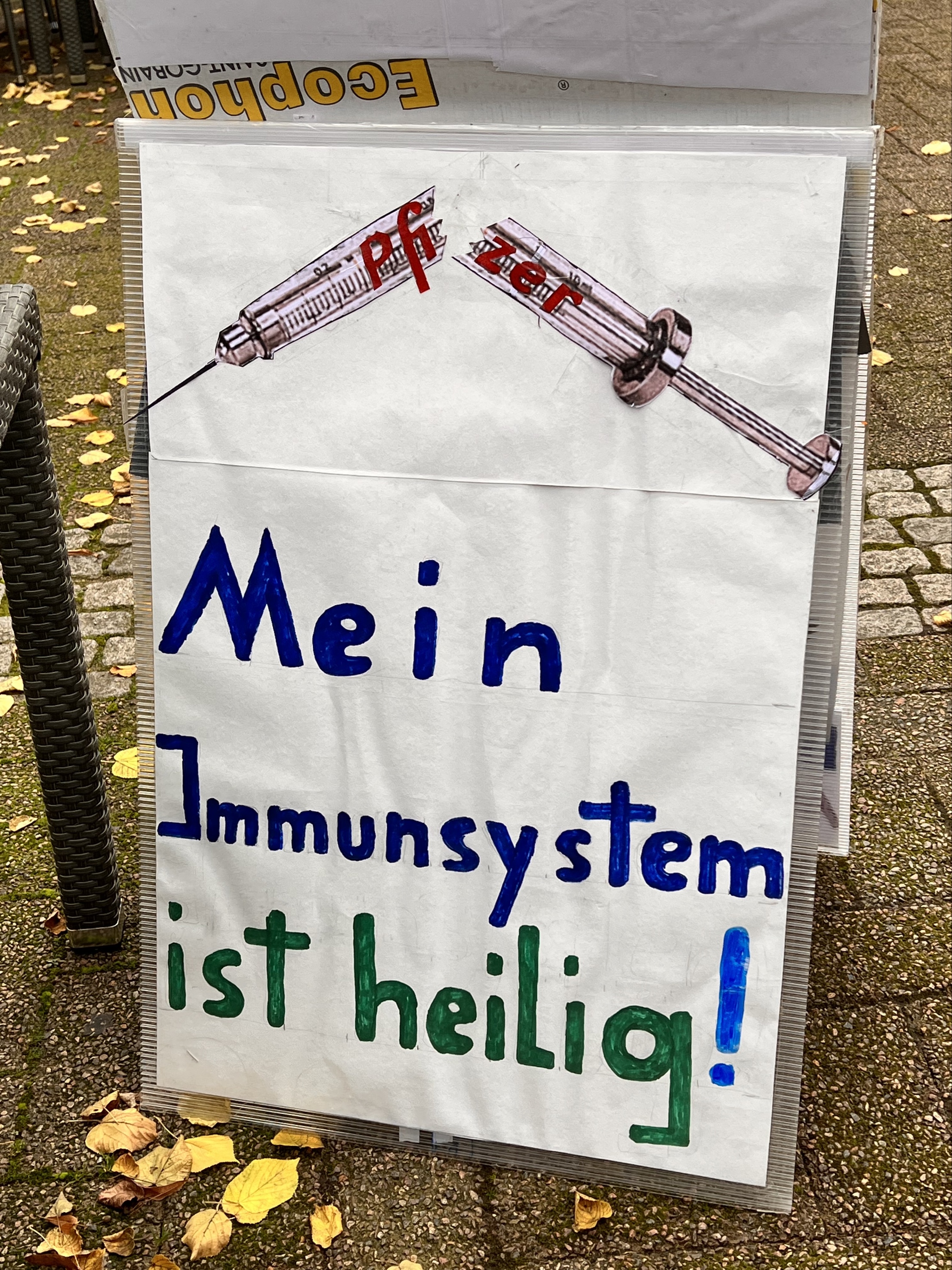 All around the square were posted signs castigating the government as being tyrannical, claiming that the true facts about Covid 19 were being suppressed and that there was a conspiracy to sicken and kill Germans through a diabolical vaccination program. These were anti government conspiracy true believers, who believed in freedom and individual liberty. Everyone who didn’t believe as they did were caught in a conspiracy through blindly believing false information. The were accusing liberals of all of the blindness and stupidity that the liberals are accusing them of.