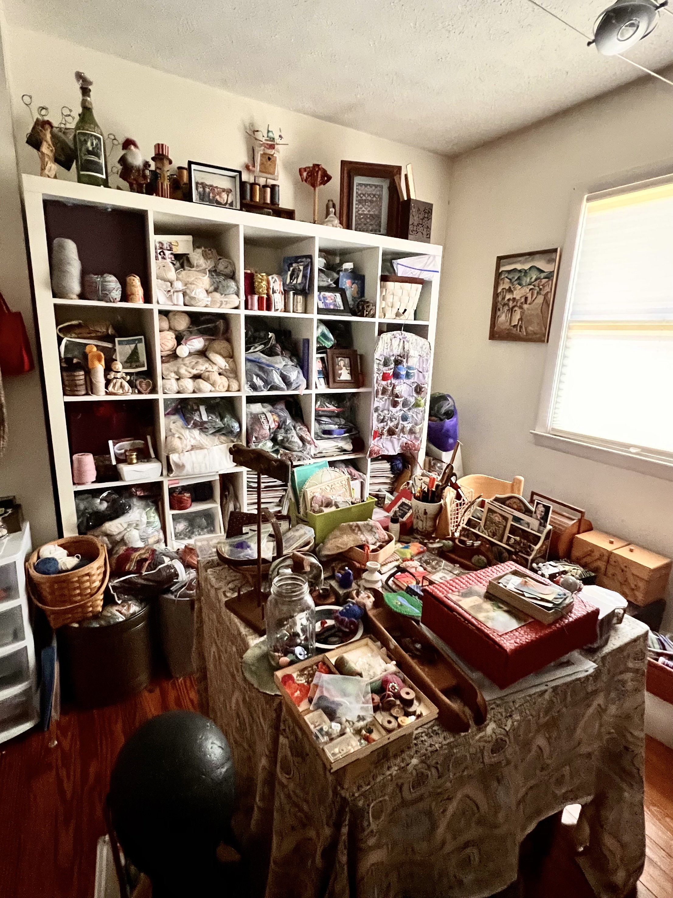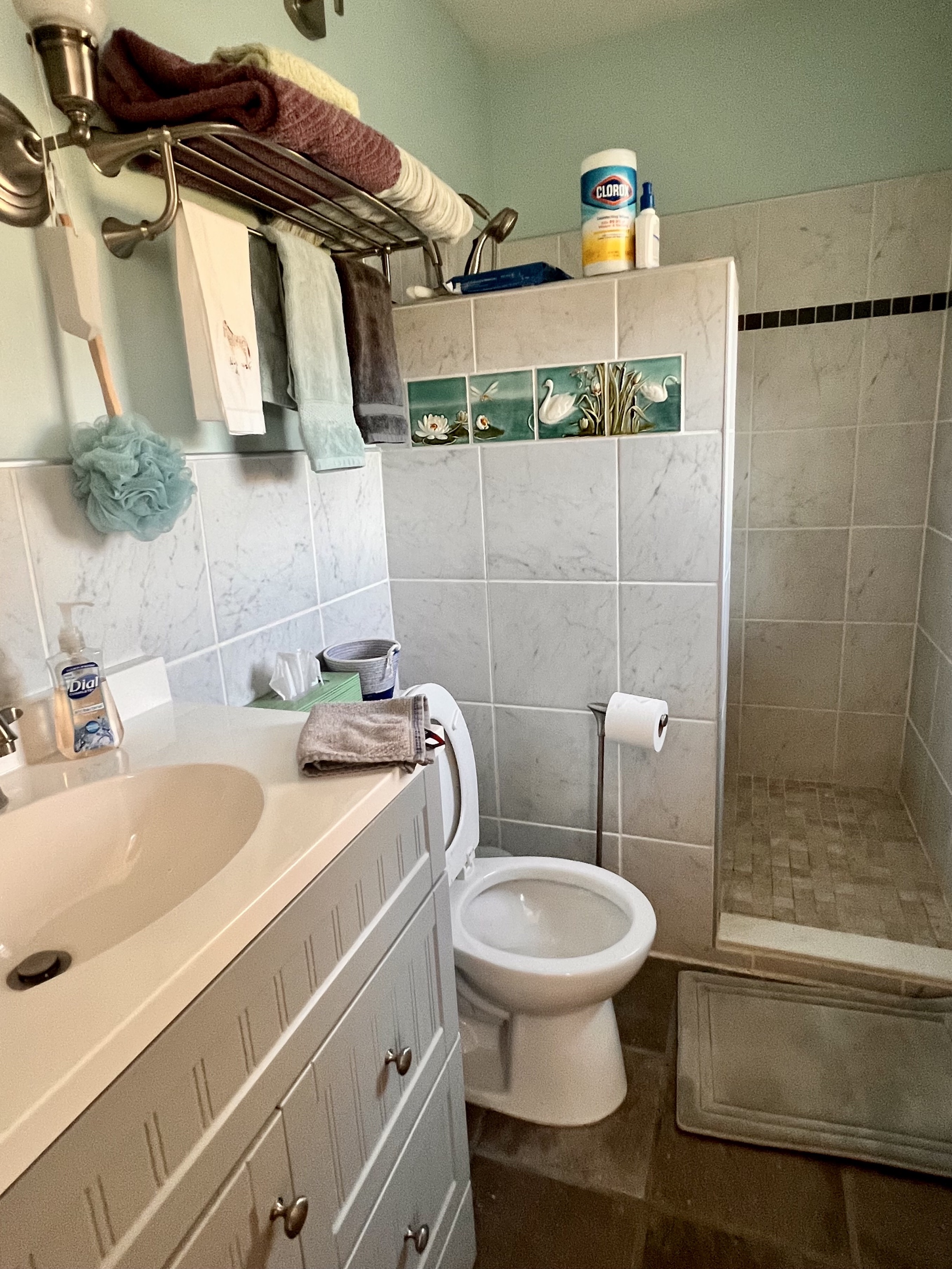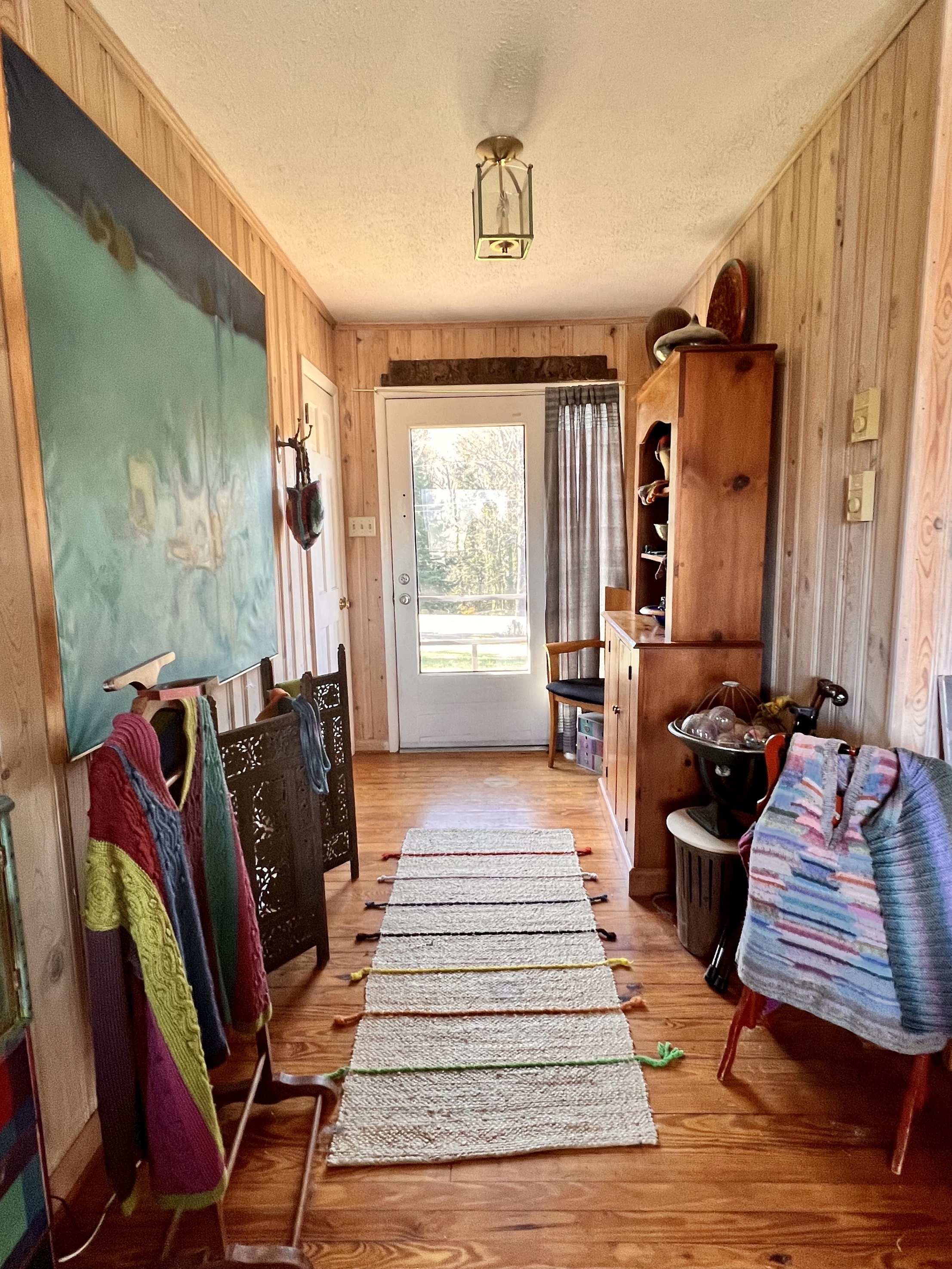 I have two bathrooms and two bedrooms, each of which will sleep two people but with the possibility of adding cots if a family comes. One bedroom is stacked with stuff that I am trying to sort out to make more room so I won’t show it. It has a view toward the street and Jones mountain, a hill just across the street on Warren Wilson College land where there are a number of marked trails for walks through the woods. The other bedroom, shown here has views of the mountain and a small recently remodeled bathroom with a sink, toilet and shower. The other bathroom is off the hallway for visitors or for those in the second bedroom. I will probably leave my wife Kathe’s knitting room as it is because I don’t know how to dispose of her things, or want to, with the offer that knitters can use any stored yarn for knitting projects.