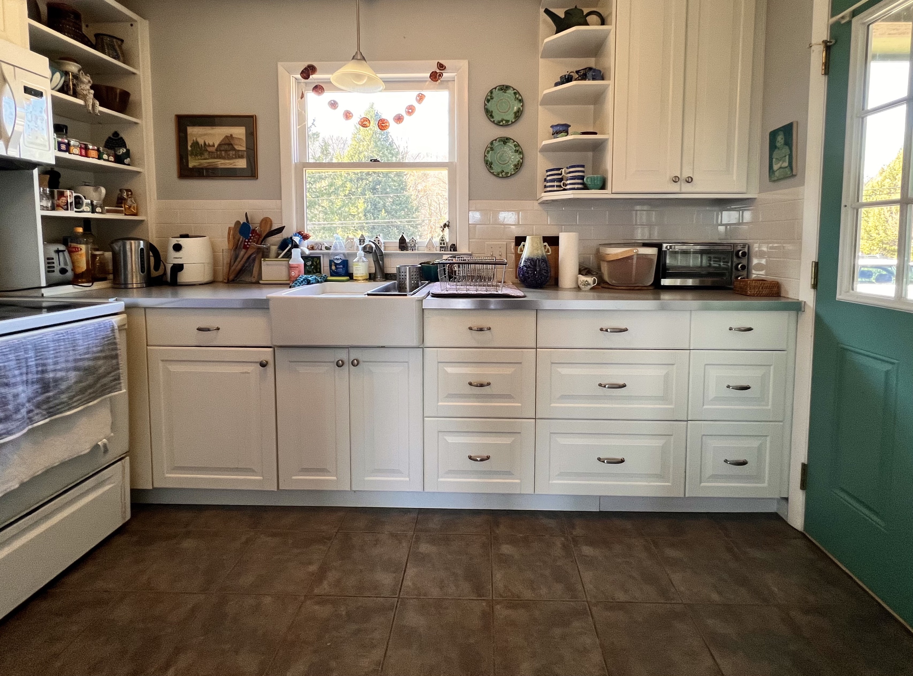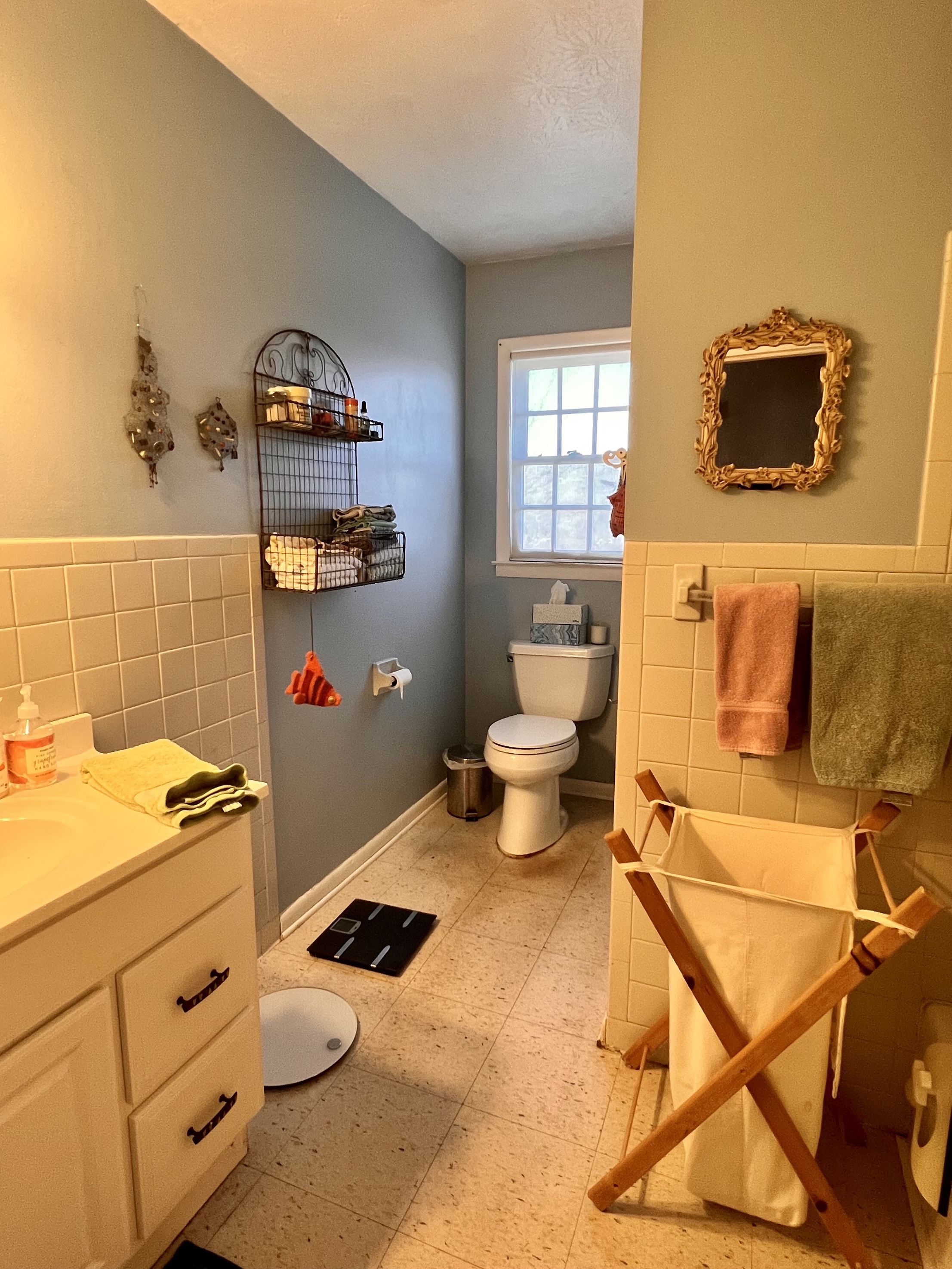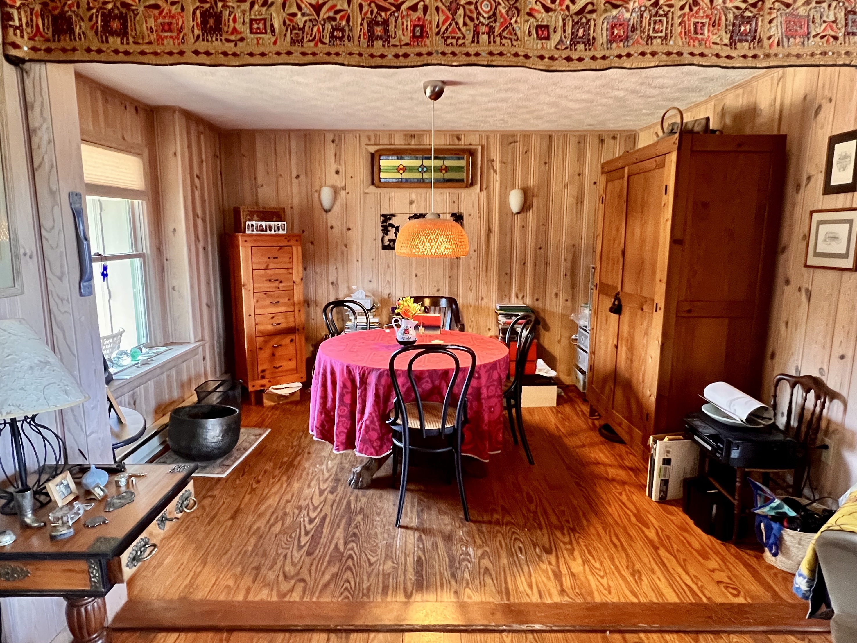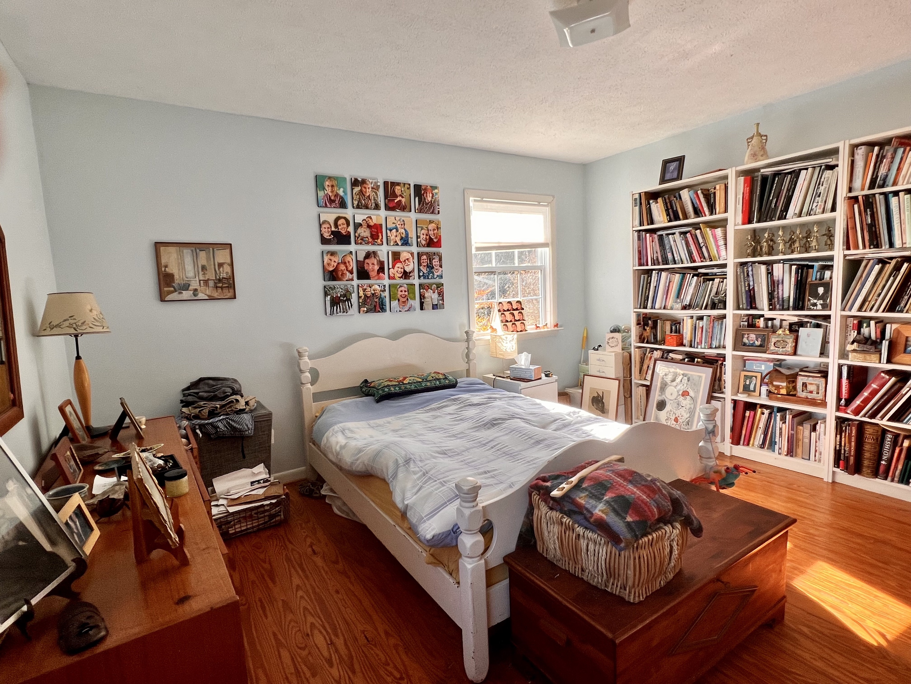I have two bathrooms and two bedrooms, each of which will sleep two people but with the possibility of adding cots if a family comes. One bedroom is stacked with stuff that I am trying to sort out to make more room so I won’t show it. It has a view toward the street and Jones mountain, a hill just across the street on Warren Wilson College land where there are a number of marked trails for walks through the woods. The other bedroom, shown here has views of the mountain and a small recently remodeled bathroom with a sink, toilet and shower. The other bathroom is off the hallway for visitors or for those in the second bedroom. I will probably leave my wife Kathe’s knitting room as it is because I don’t know how to dispose of her things, or want to, with the offer that knitters can use any stored yarn for knitting projects.
