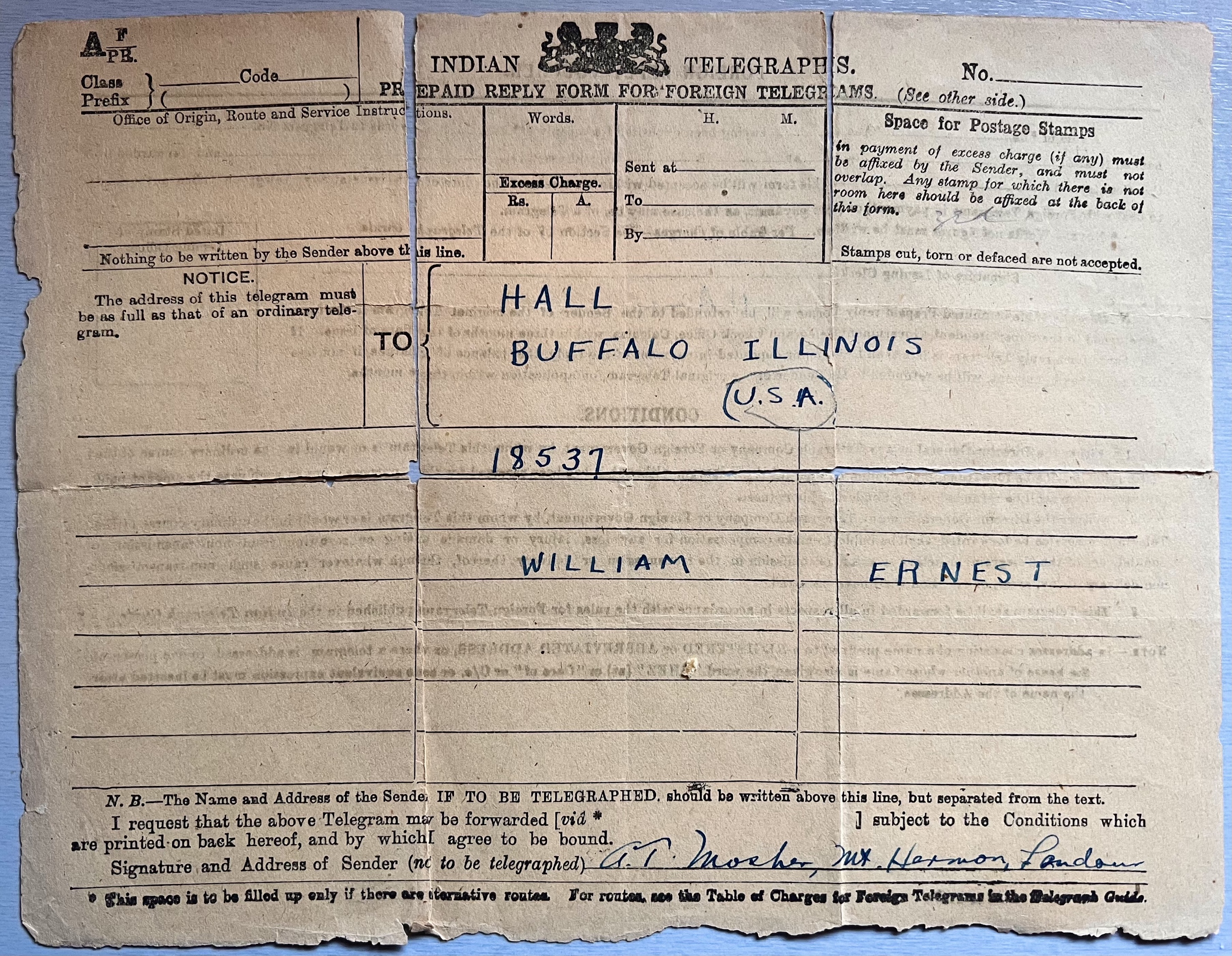 When I was born on August 11, 1937 in the Landour Community Hospital in Landour, Mussoorie, United Provinces, India, under the British Raj, my parents sent a telegram to my mother’s parents in Buffalo, Illinois announcing my birth. Apparently it was very expensive to send a telegram in those days because they paid by the word and there were only seven words in the telegram, four in the address and three in the body with no sender listed. The address had to include USA and Illinois but the rest was abbreviated, my grandparents last name, Hall, and the town, Buffalo. There was no mailing address which saved a few words. The body included my first and middle name, William Ernest, and the message contained one word only, 18537. 1 indicated I was a boy; 8 indicated I was Husky, full of life, lots of hair; 5 indicated I was 8 pounds; 3 indicated instrumental delivery, A.W. (My mother) recovering nicely, Arthur (my father) present; 7 indicated born between 3 and 6 p.m. today. There was no need to sign it.