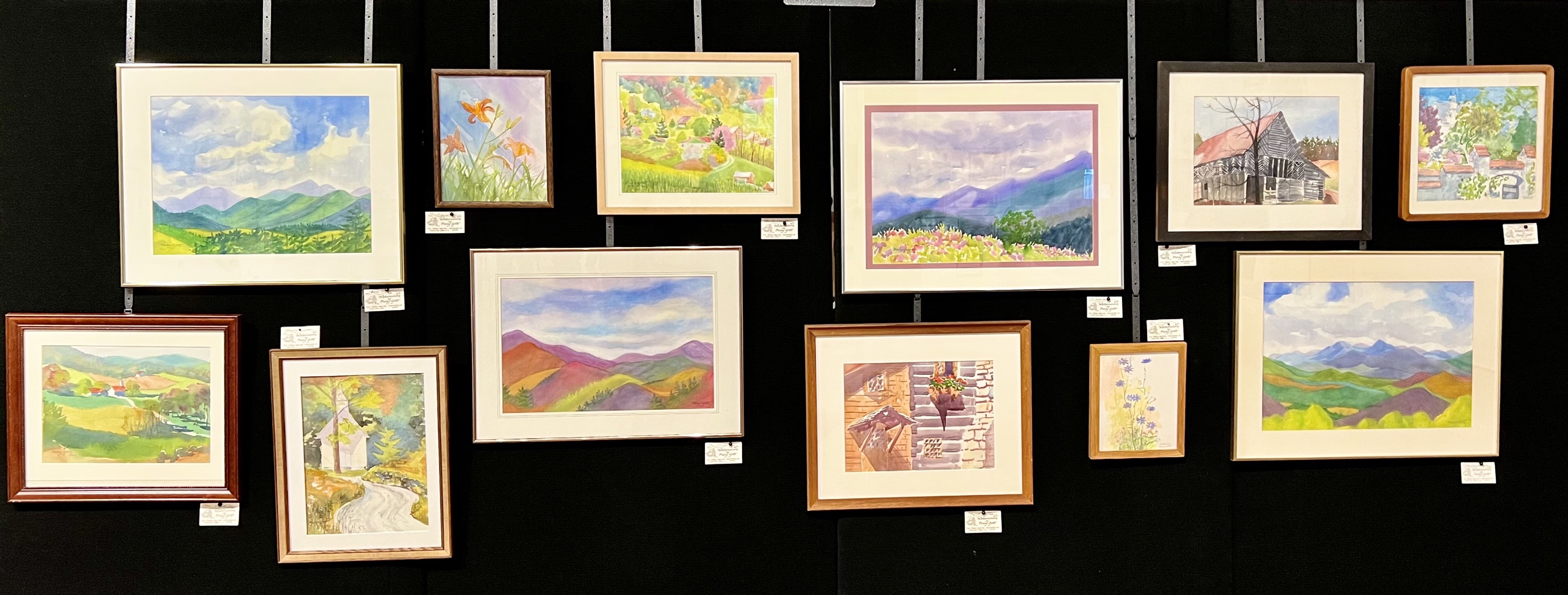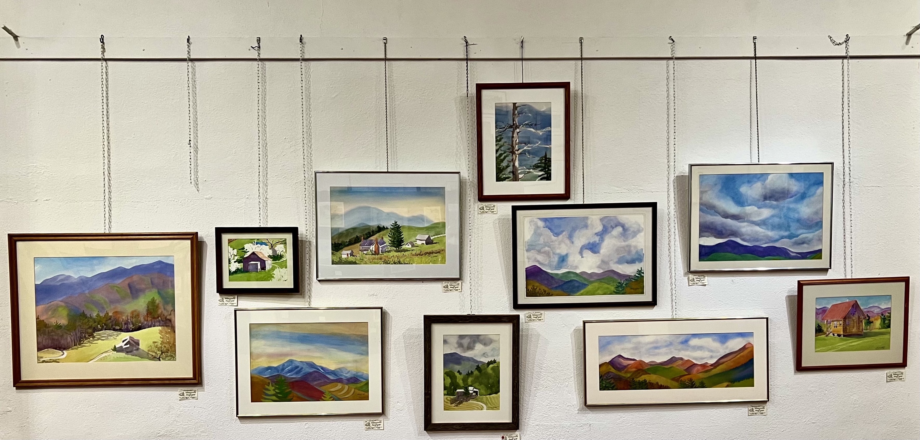 Now Madison county, with its beautiful forest and mountains, is home to three types of people. There are the descendents of the original settlers with their tobacco barns, now falling, and fields no longer growing tobacco, and derelict cars and hound dogs and cows. There are the new Northern educated homesteaders trying to flee city life to live in the country like my daughter Susie and Todd. And then there are the rich from hot, humid Florida who have elegant houses with excellent views who live in gated communities which they visit in the cool summer months when Florida is unbearable. The rich folks weren’t at this exhibit and neither were the former tobacco farmers. The new homesteaders, like Polly herself, were. But most of Polly’s paintings were of the falling barns and churches and forests of old Appalachia. The exhibit was in the little town of Marshall, the administrative center of Madison County with a gold domed court house, squeezed between the wide French Broad River and the steep bluffs through which the river had carved its way as it streams toward the Mississippi delta in the Gulf of Mexico. Marshall still celebrates the old mountain music, banjos and guitars, in the abandoned train depot once a week, but the rest of the town is rapidly gentrifying with a brewery and elegant restaurants and beautiful stores as Northern outsiders and tourists come to town. Some of these outsiders were there last night And I had a great time getting to know some of them a little bit as we visited old Appalachia in Polly’s paintings.