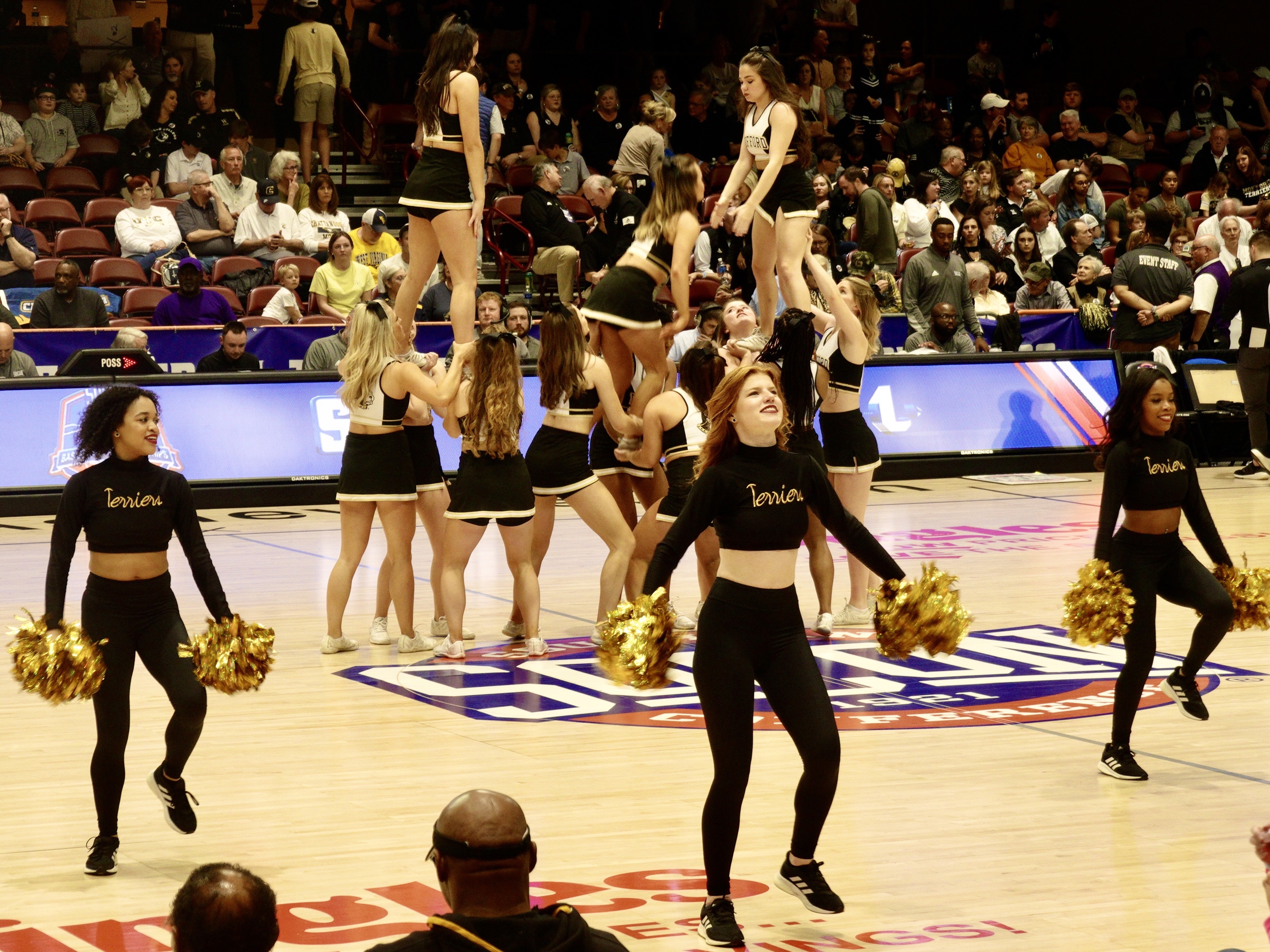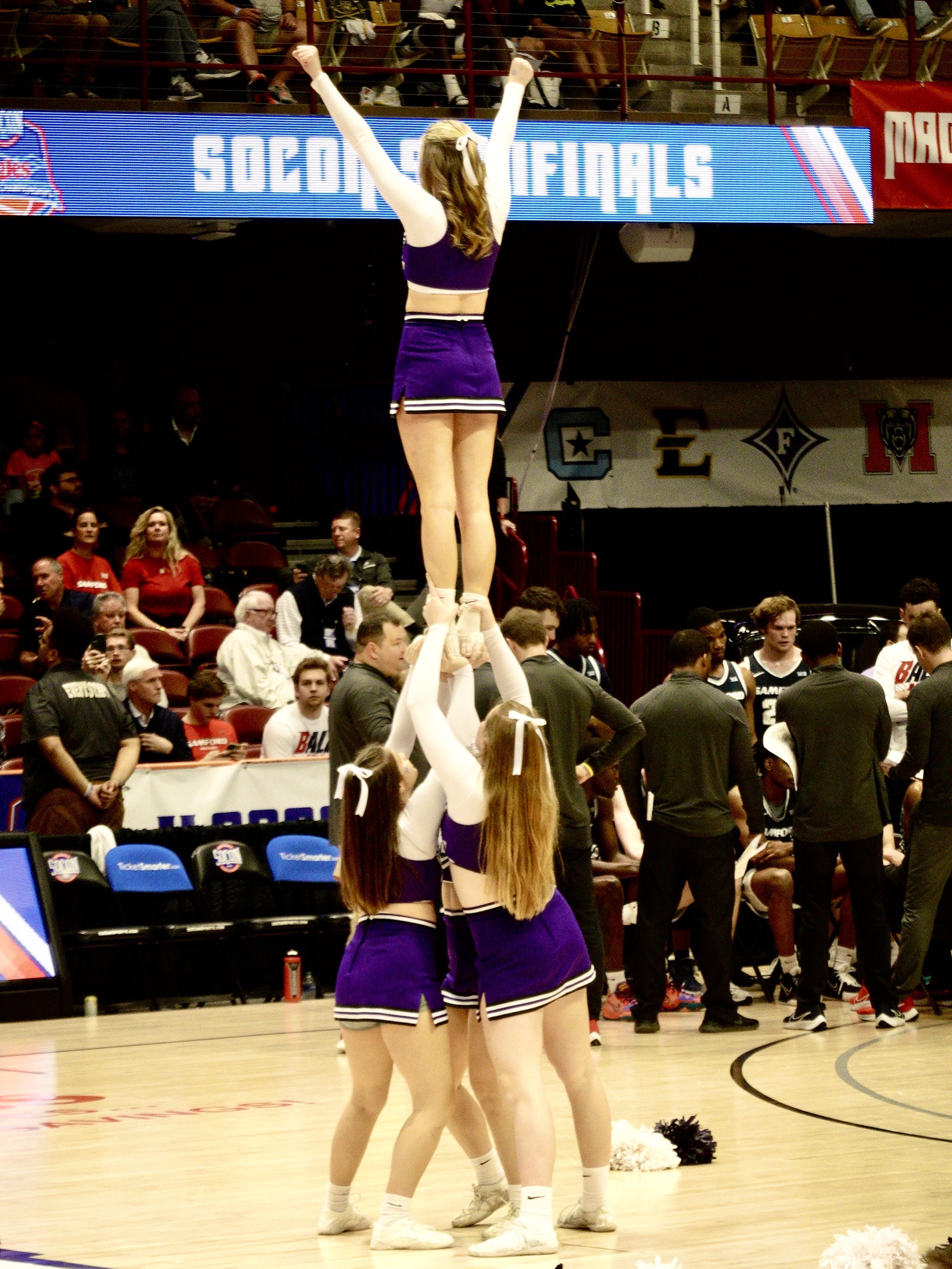But if you are sitting courtside these time outs are filled with performances by the cheerleaders, first the cheerleaders for one team and then the other. And while these may be partially to fire up the fans to get them to cheer louder, they are also a display of acrobatics in which the women show off their acrobatic skills either by doing back flips along the court or by forming pyramids in which they lift one performer very high as she smiles broadly and waves at the audience. Being a cheerleader is the equivalent of being a star male athelete.