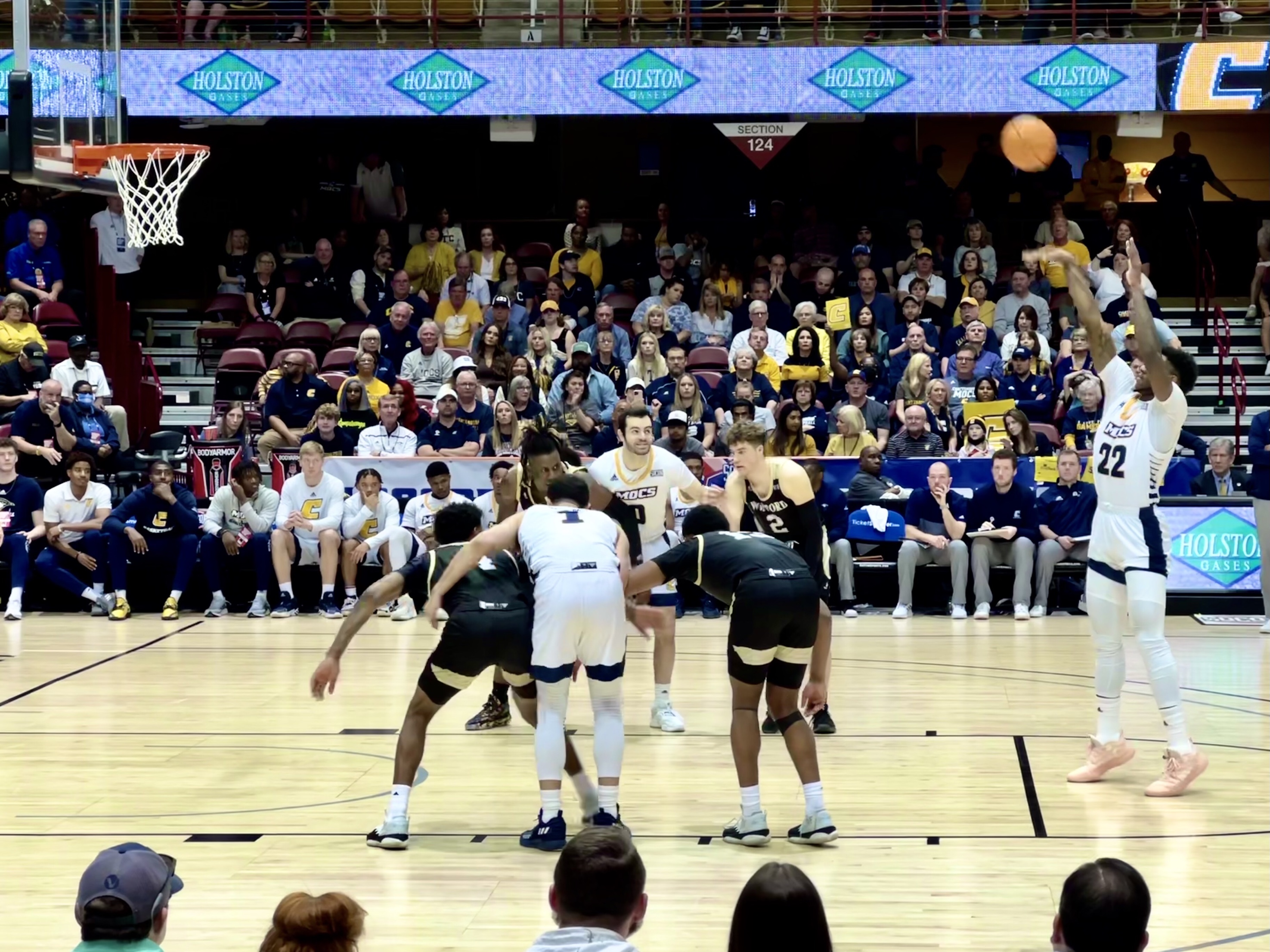 But the games on Sunday night seen in person were different from this final game last night seen on television. Seeing the game from court side was a completely different experience. The feel of the game started outside the Harrah’s Civic Center where the people were streaming in. There there was a holiday spirit of people who had driven to Asheville to watch the games and see the town. They were here with Furman or Chattanooga, Samford or Wofford, jackets and caps, middle aged couples and old couples who had been coming to tournament games for thirty years. These were the supporters, the fans, who were connected by strong college memories but had no connection to these schools today and certainly didn’t know the men who were playing.