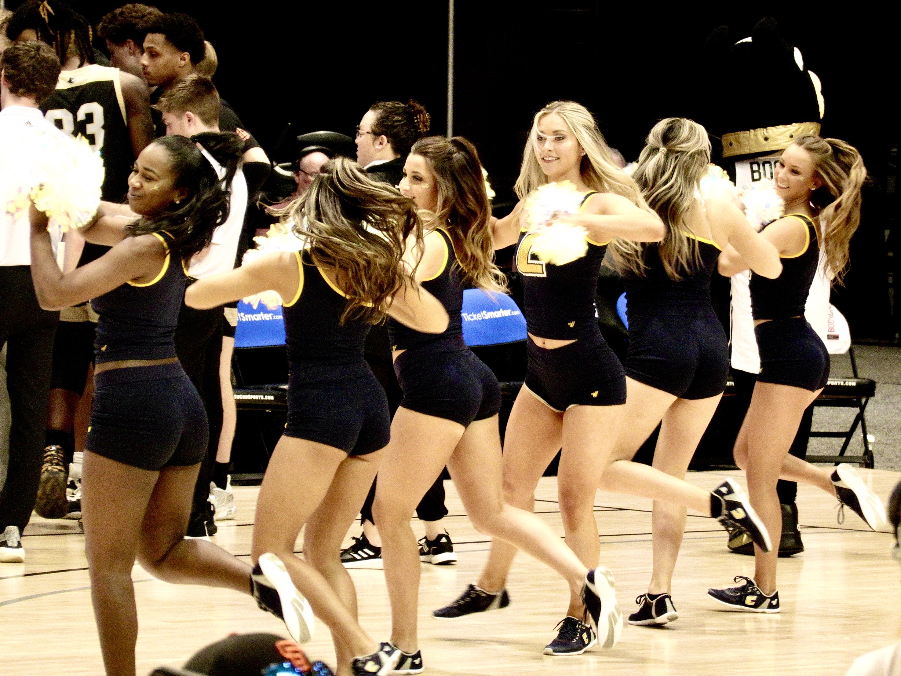 And in front of the student sections were cheerleaders, maybe twenty women cheerleaders and ten men, for each side. But it was the women who did most of the cheerleading routines. The women cheerleaders wore very short skirts and tight tops with lots of spangles. Some cheerleaders had white pompoms in their hands.