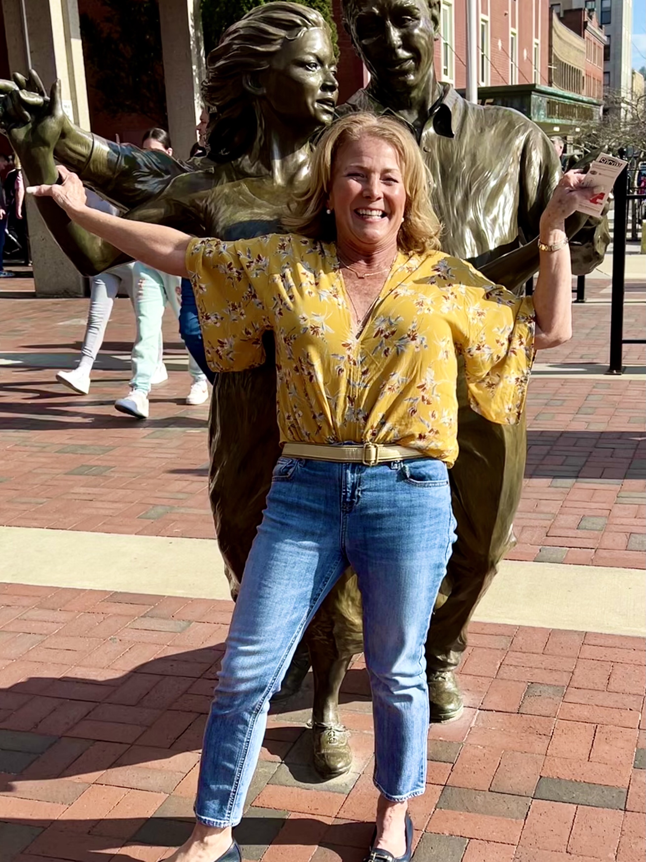 I took a photo of one who posed with the statues in front of the civic center. Inside these fans sat mainly in the section of the stadium designated for their team and cheered all the way through the game.