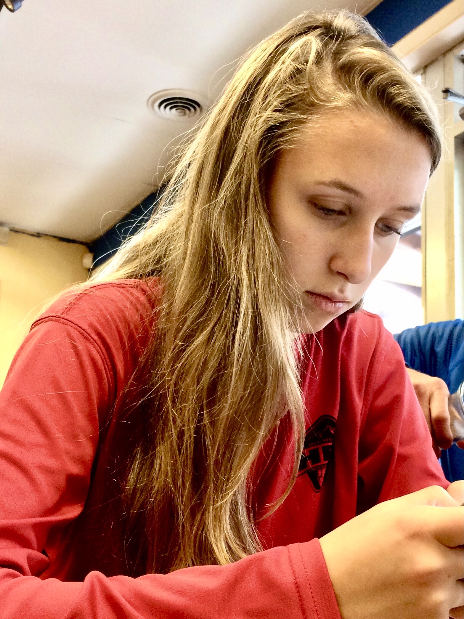 Between the two episodes that we watched we FaceTimed niece Caroline who was studying for a Physics test at NC State. We could see her on the large TV screen, big as life. She leaves for ten days in Peru on Friday with a group to do a medical internship. She talked for a bit and then said she had to get back to studying her notes on her iPad.