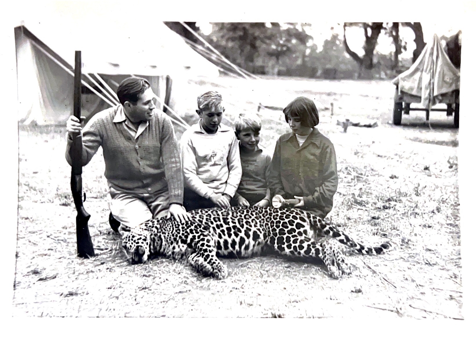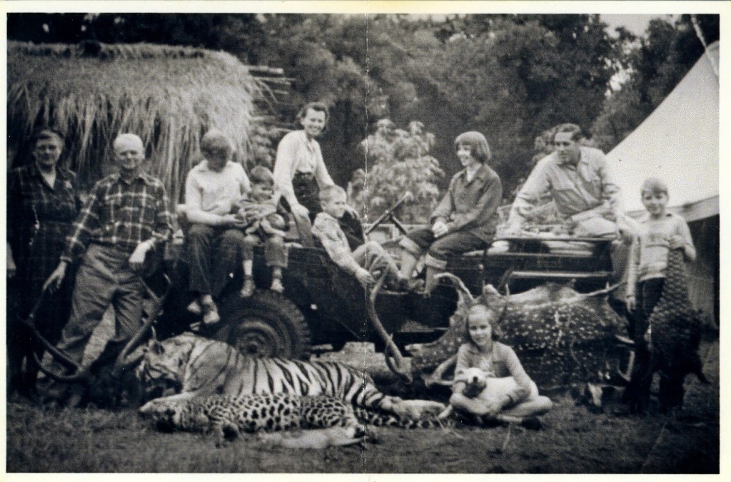 A third intense memory of the hunt that I have was when on the same night a leopard killed a staked out goat outside of a village where an this leopard had caught and eaten several of goats. The villagers were hoping we could kill it. On the same night a tiger had killed a buffalo that had been staked out in the forest as bait. So the next night, Mr. Owen’s, who happened to be Principal of Woodstock School was stationed on a platform built into a tree above the dead still tied up buffalo to wait for the tiger to return. And my Uncle Bill was stationed behind the bamboo hut of village shed to wait for the leopard with the body of the dead goat 30 feet away. My Uncle Bill invited me and my brother Ted and the Winnie McGavran to accompany him. We went before dark, sat behind the flimsy bamboo wall of the goat shed with the goat in front of us and waited and waited and waited. Again I was intensely jealous, because it was Winnie who was entrusted to hold the powerful flashlight with six fresh batteries, not me. Finally in the gloom there was a movement, Winnie spotlit the transfixed leopard, and my Uncle pulled one trigger after another with huge explosions, there was a terrible scream and then silence. We couldn’t see any leopard and afraid it could be lurking out there retreated to our Jeep and drove back to our campsite. The next morning my Uncle Bill drove out and found the leopard not far from where he had shot it.
