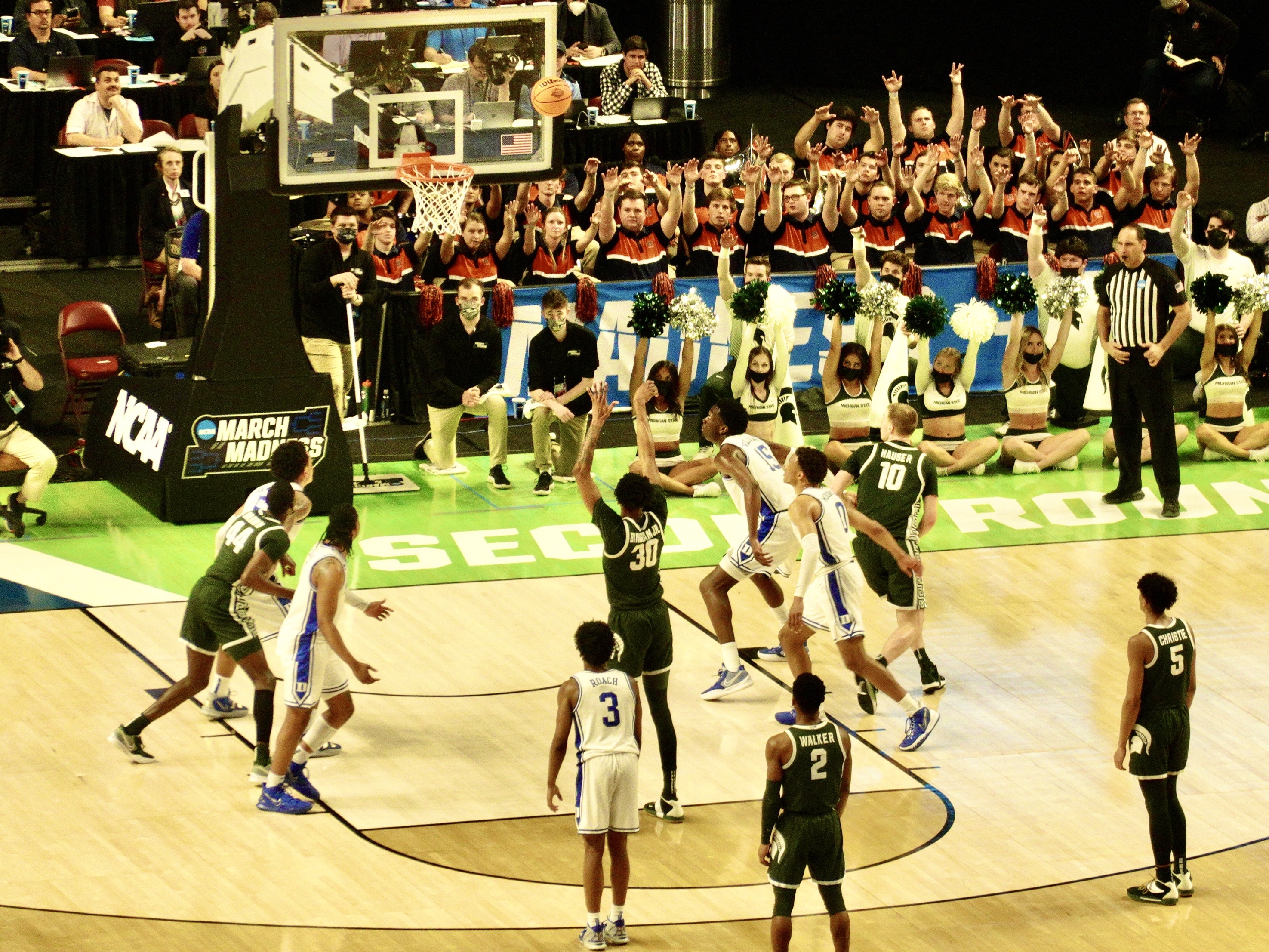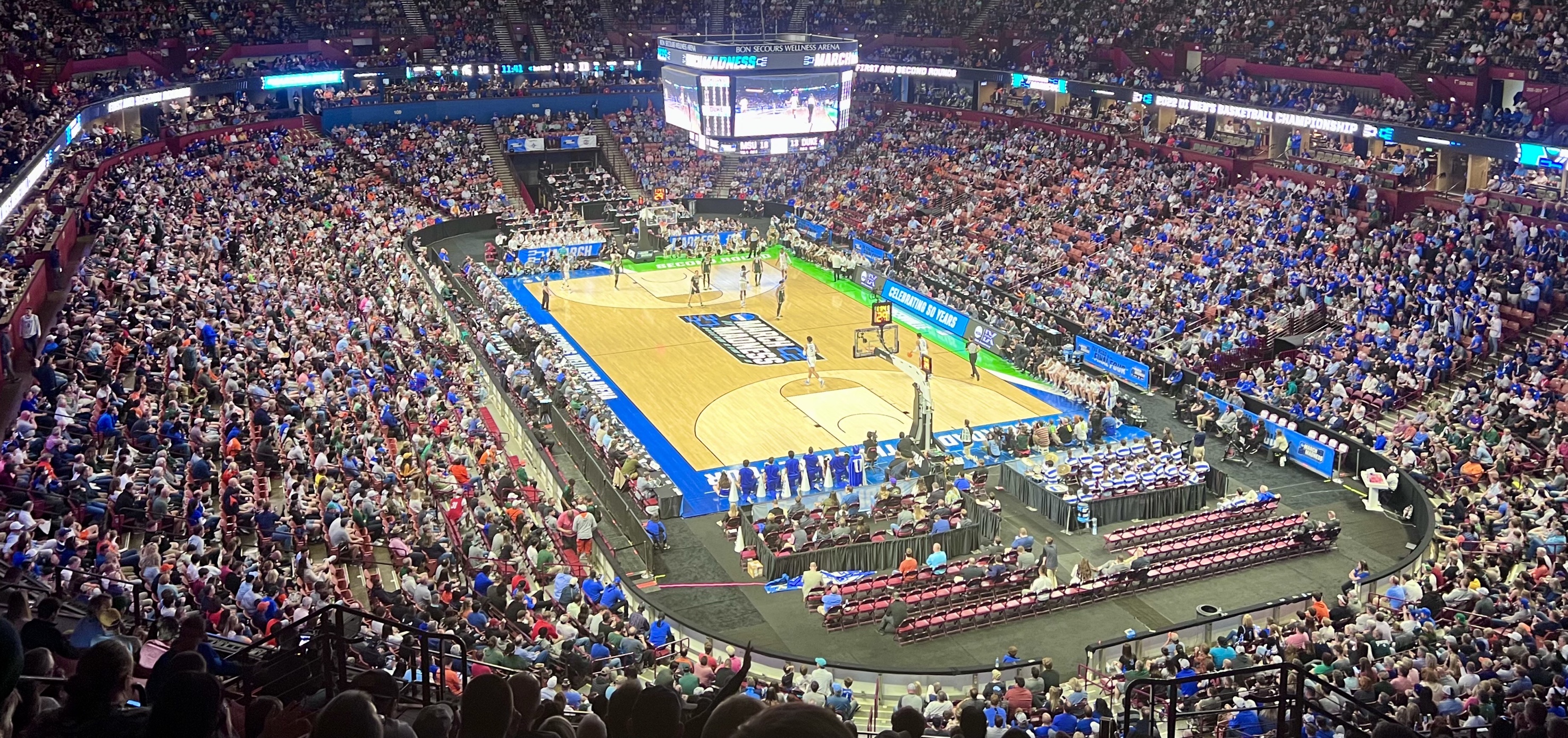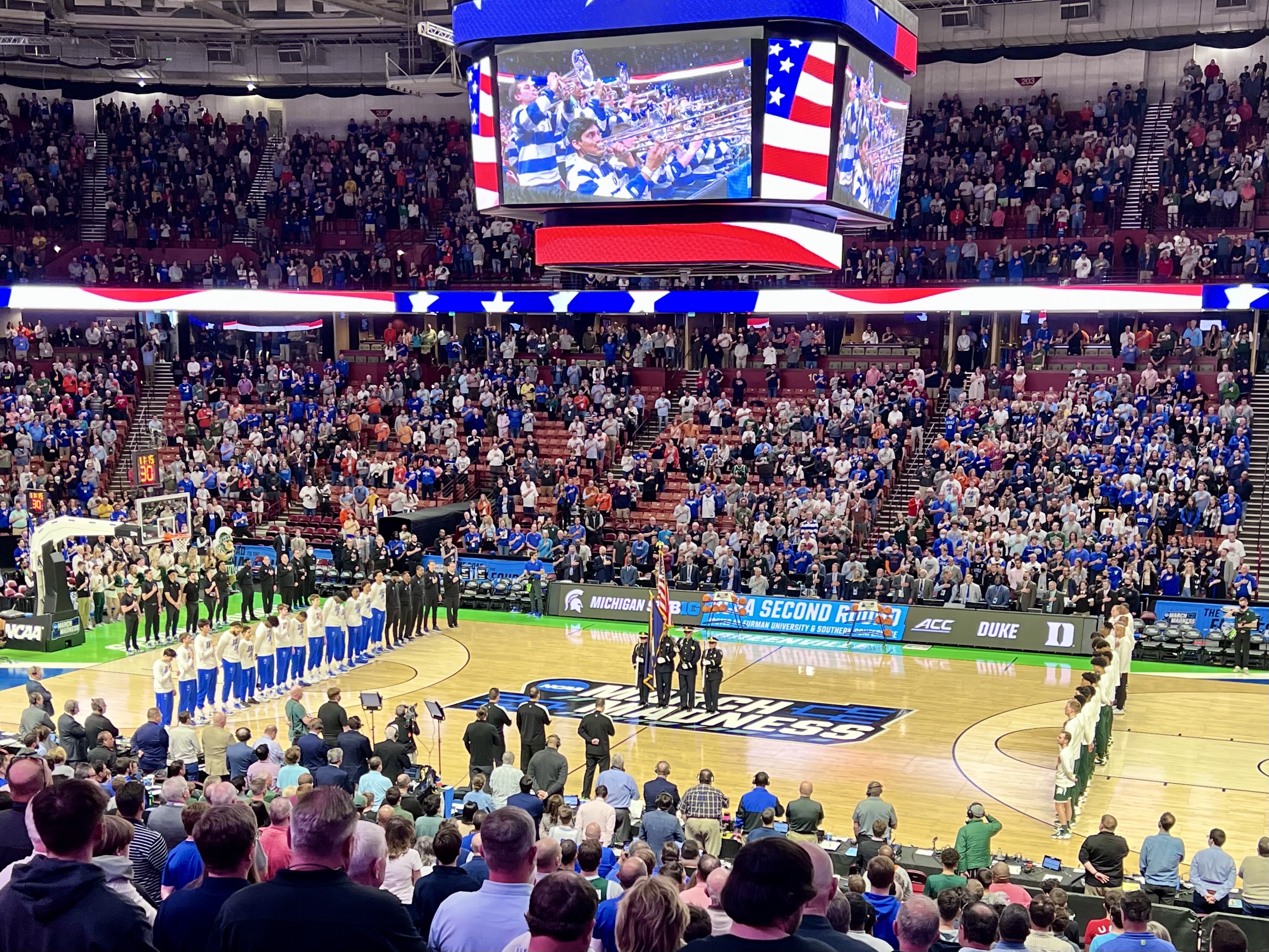 This is the American college basketball tournament of tournaments in which 64 college teams compete for the national championship. My son Tom invited me to go along with his friends Greenville, South Carolina, an hour away when one of them dropped out. Tickets were in the nosebleed section, four rows from the top, so that the game was far below us, but still cost $180 for two games. The atmosphere was electric and the cheering fierce during the first game between perennial champion Spartans of Michigan State coached by Tom Izzo and the Blue Devils of Duke University coached by retiring legendary coach Mike Kryzewski.