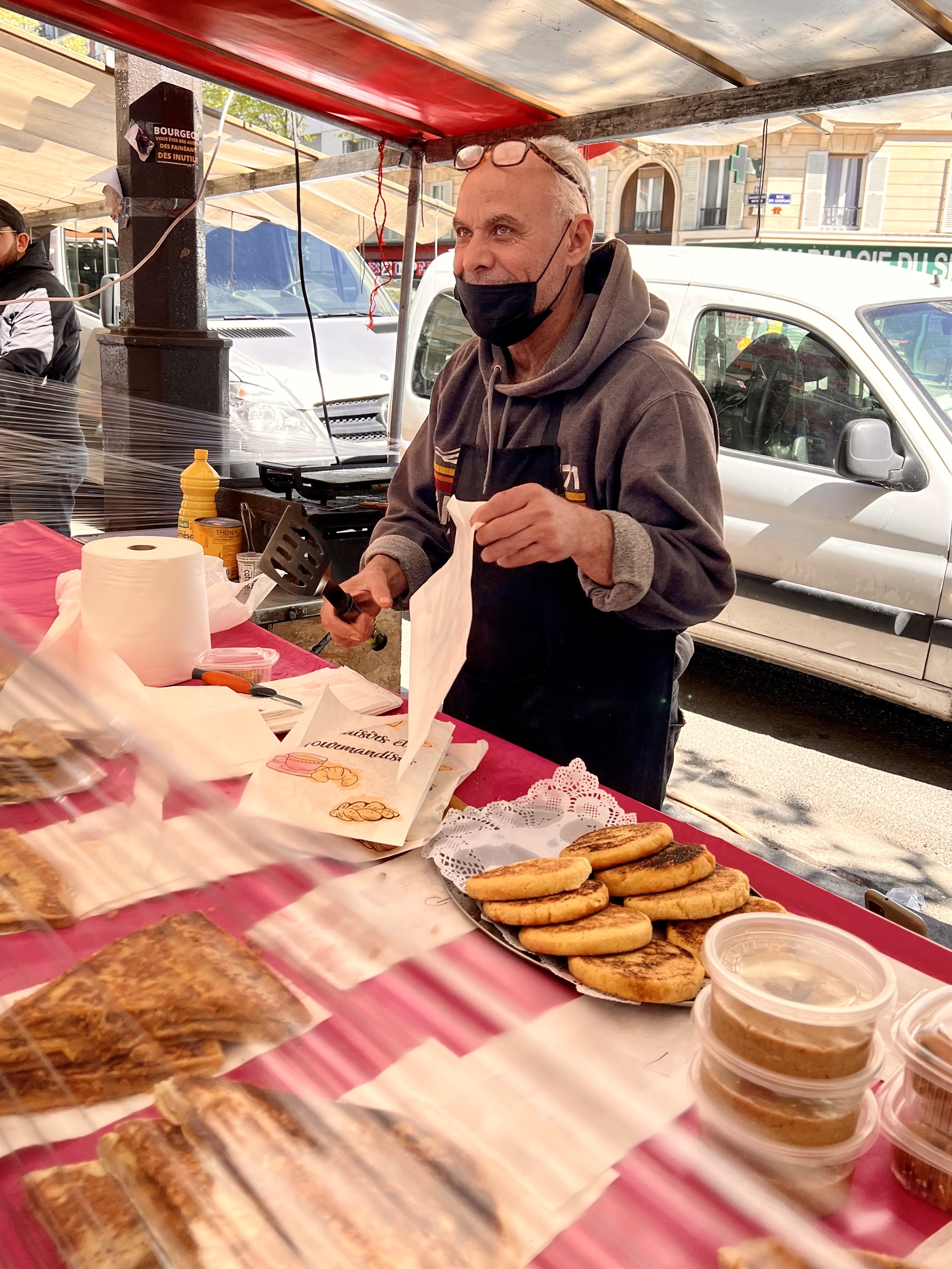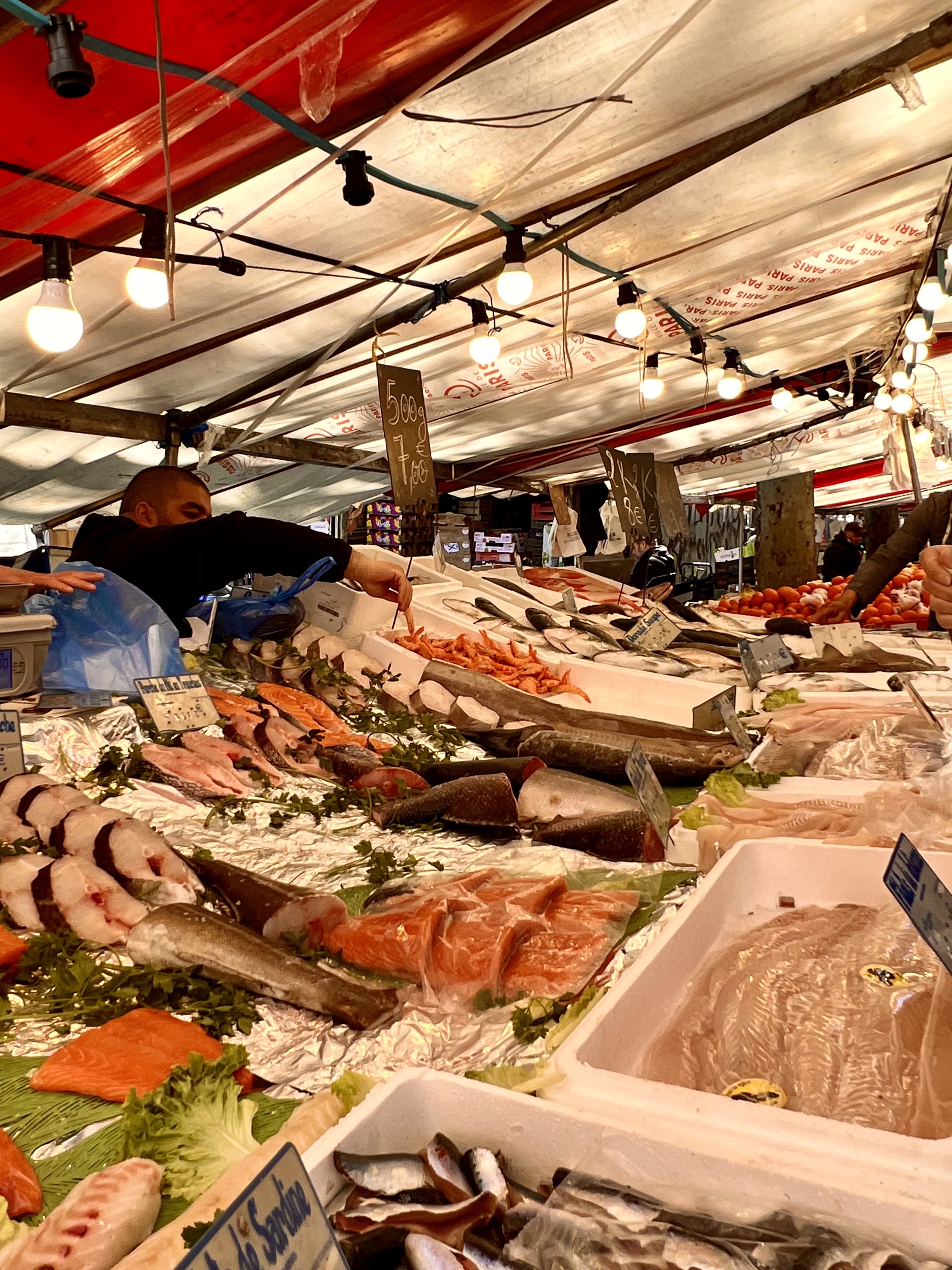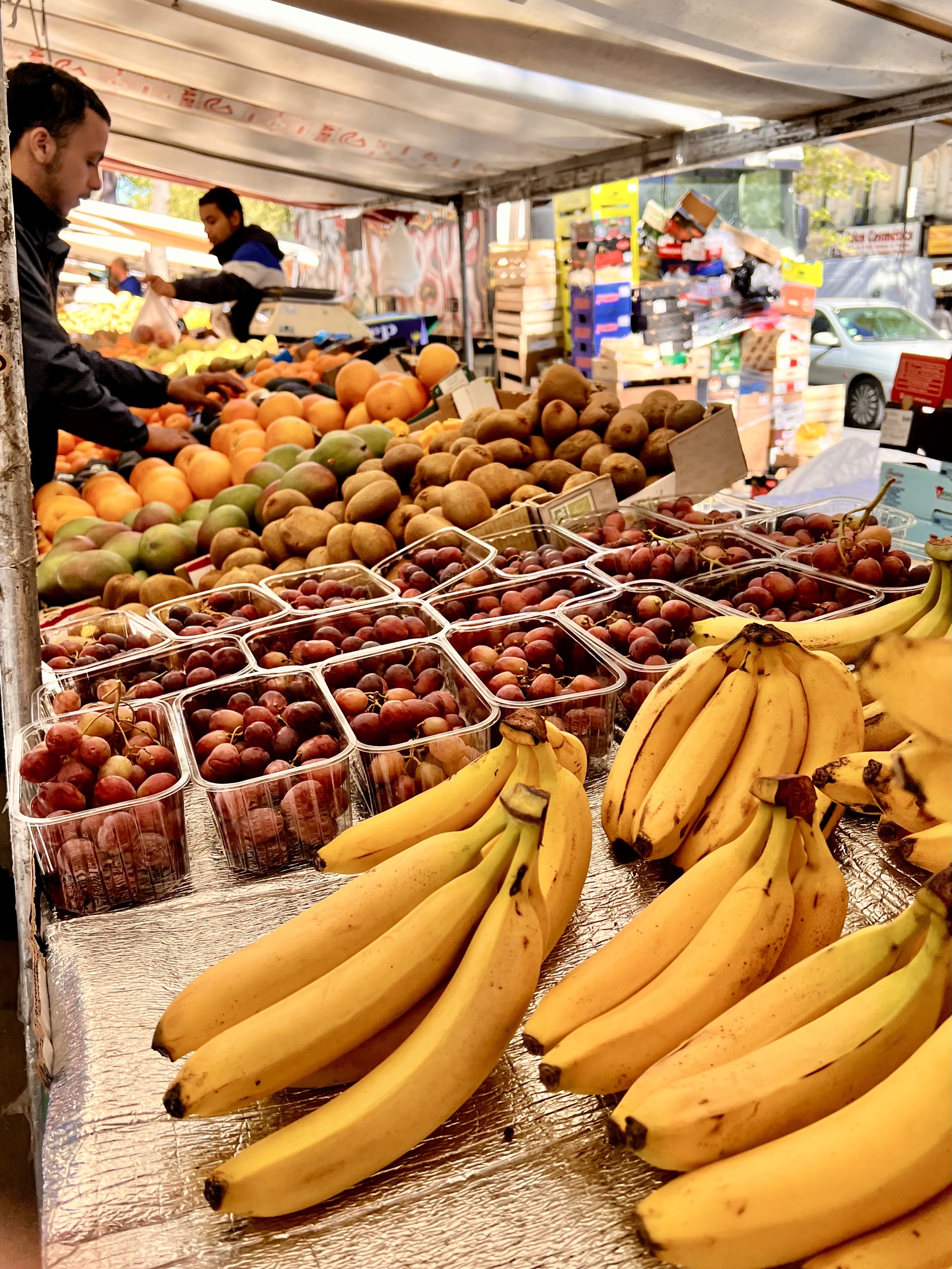 On a beautiful Easter Sunday we went to church, briefly, because there were no seats left and the sermon in French seemed interminable. Instead we went on a walk and got lost. Susie wanted to show me an section behind Montmartre where an old rail line had been turned into a walkway and garden but GPS led us astray. We walked and we walked through what was largely an African area. Because of it’s colonial past Paris has a very large African population. It was almost like walking through Chandni Chowk, Delhi with the sidewalks lined with vendors selling clothing and vegetables and fish and with a number of shops selling cooked food to go. So it turned out to be another Parisian adventure. Finally we got to the green walkway and a train station converted to a restaurant, La Recyclerie, who maintain the walkway, where we had a very environmentally proper lunch with all kinds of vegetables.
