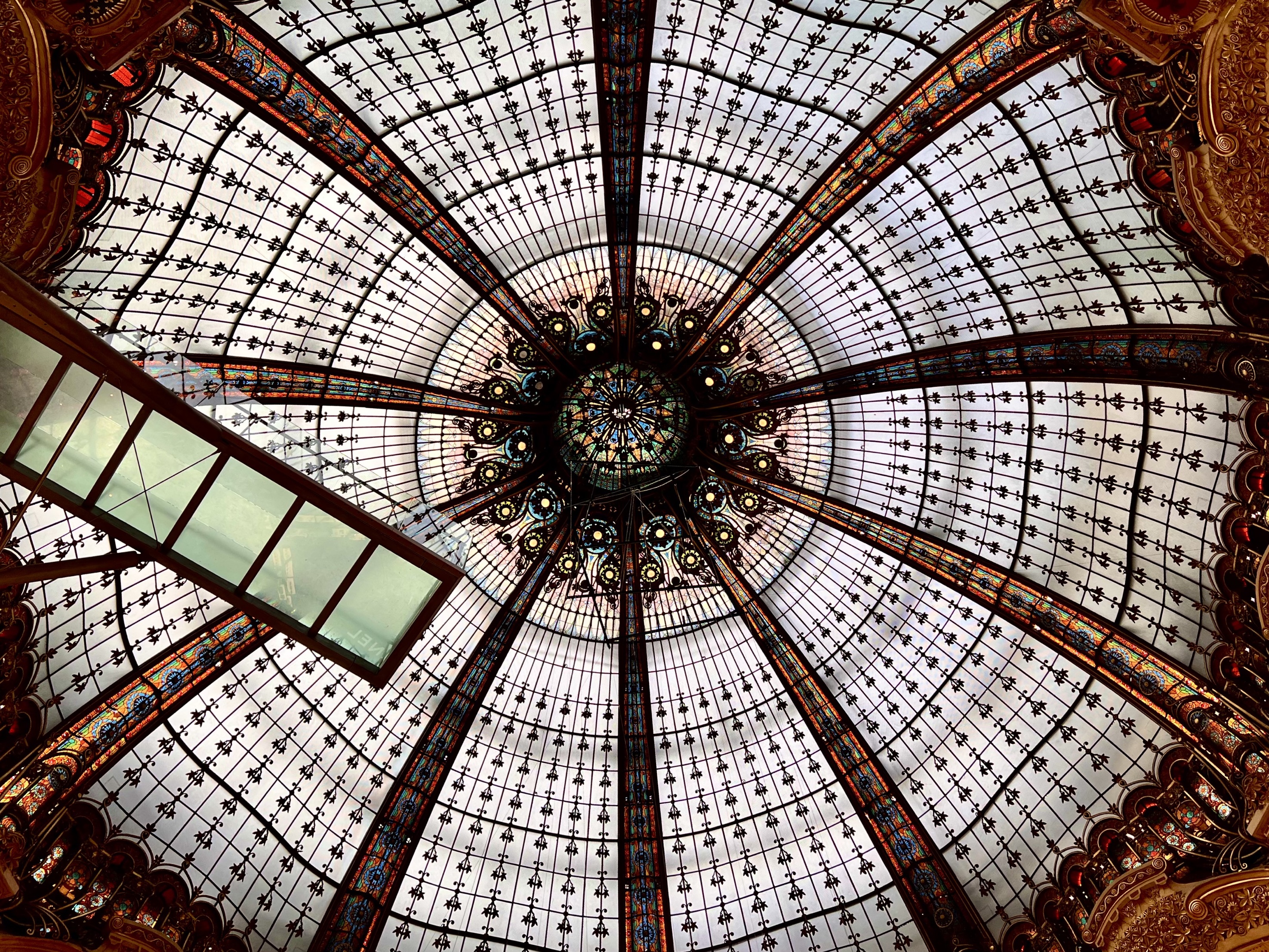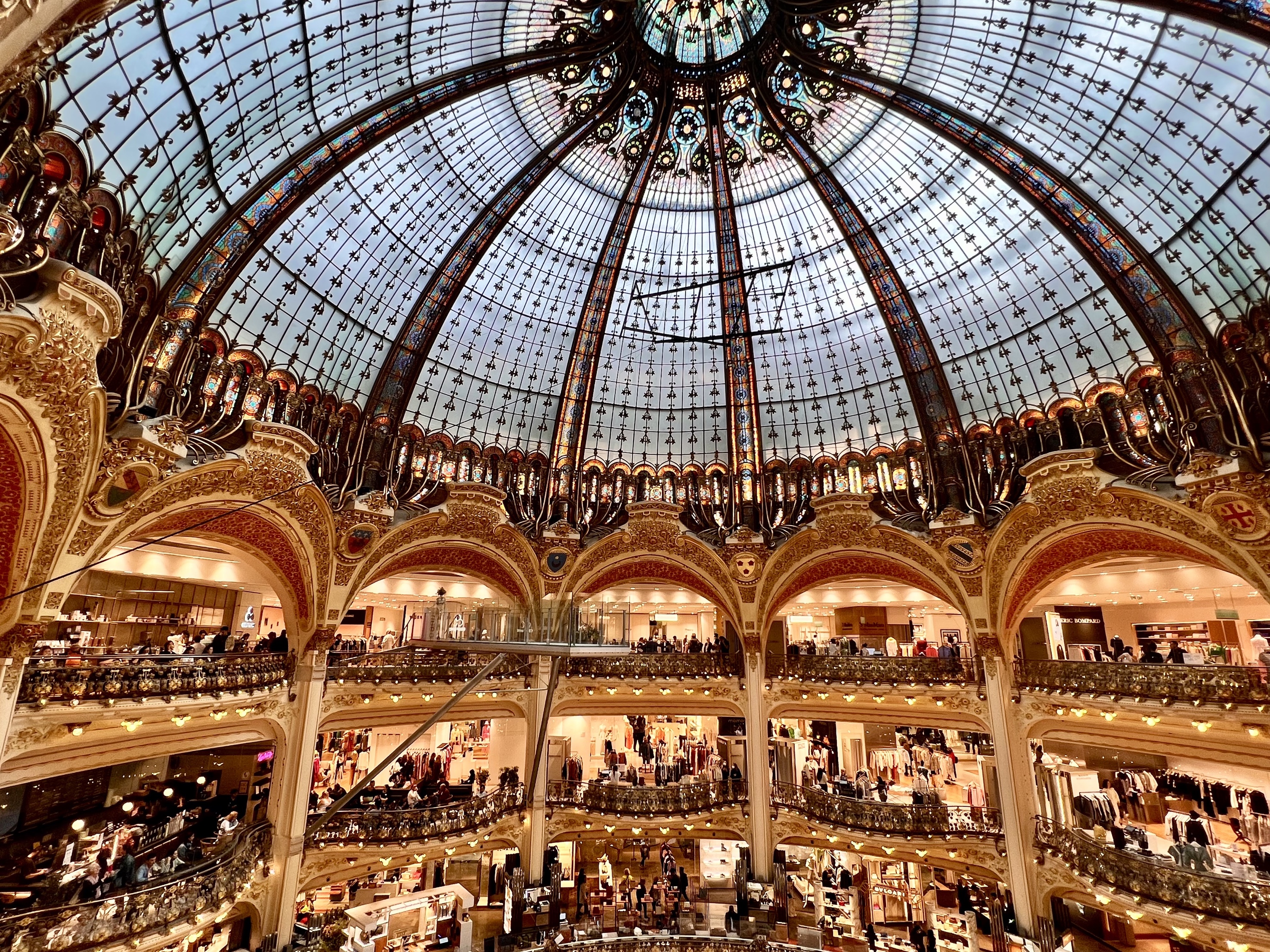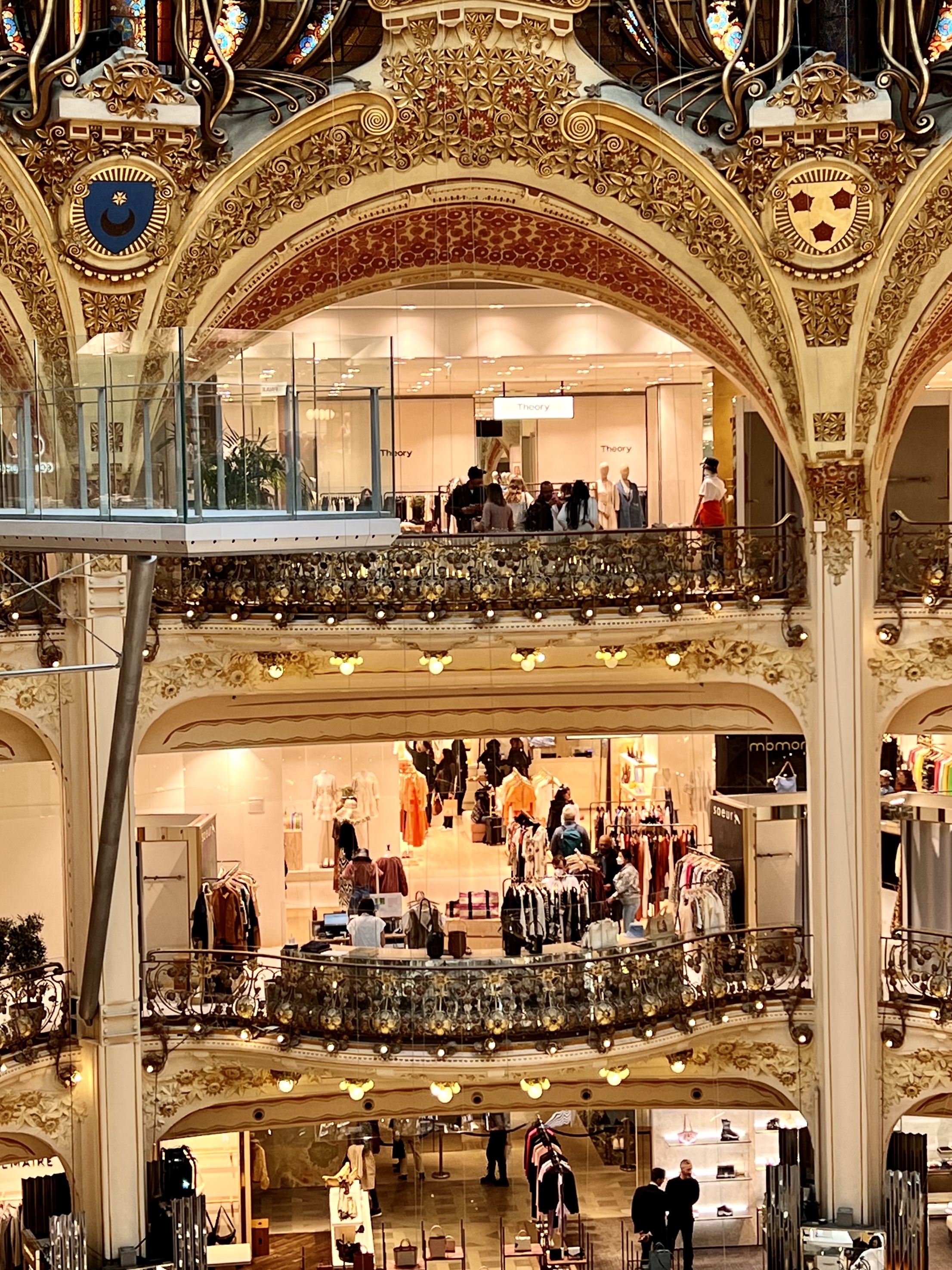 And then we were dazzled by Gallerie Lafayette. It is a six story store with ornate balconies opening onto a huge atrium covered with a jeweled glass covering. It had the same awe inspiring power as the huge church, San Germaine, we visited yesterday with its brilliant stained glass windows. You wanted to bow and worship, but this time not to God but mammon, to very expensive high French fashion. We weren’t quite sucked in, but almost, and finally had to flee before we were fully corrupted.