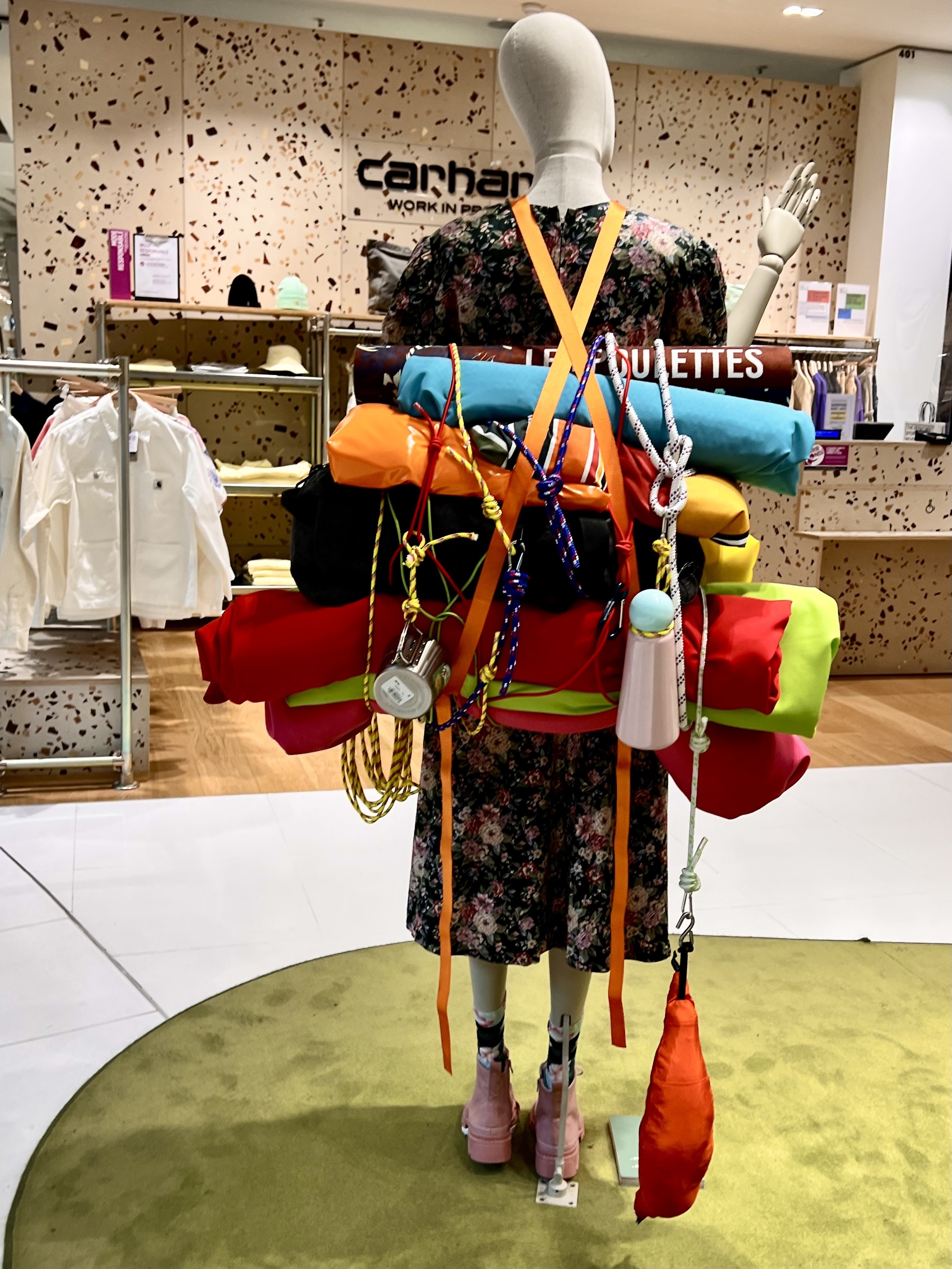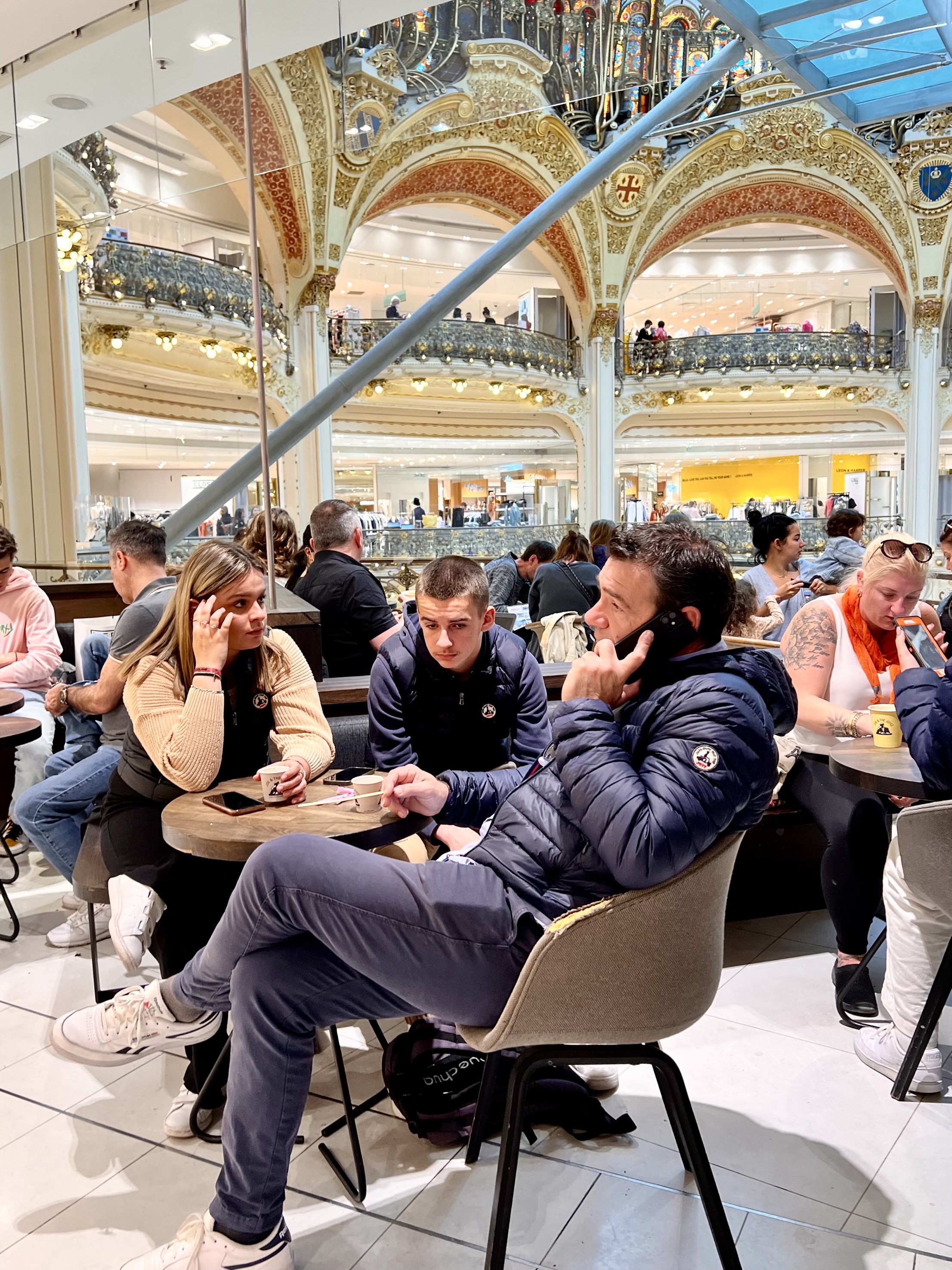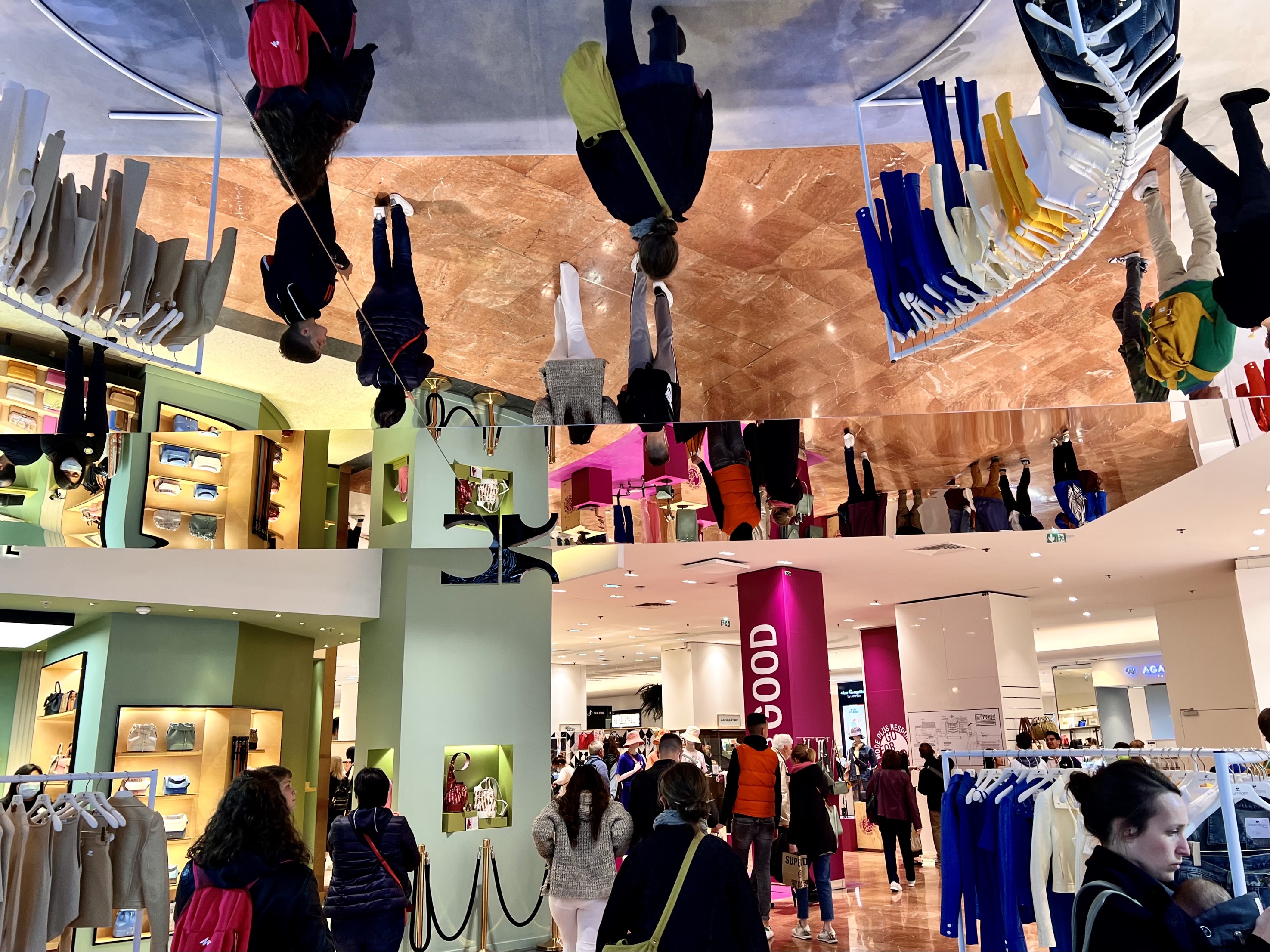 The same could be said of shop windows, every shop window. Everyone in France seems to have good taste. The windows are brightly lit and the merchandise colorfully displayed. Maybe they have trained window decorators who come from shop to shop. Kathe’s brother, Volker, was a window decorator for a large department store in Celle. It was a high calling. He and the store’s owner would go off to Denmark on the owner’s boat and carouse and have a great time. So today we went again to one of these models of French good taste, the enormous Lafayette Gallarie, an easy walk downhill from Martmartre.