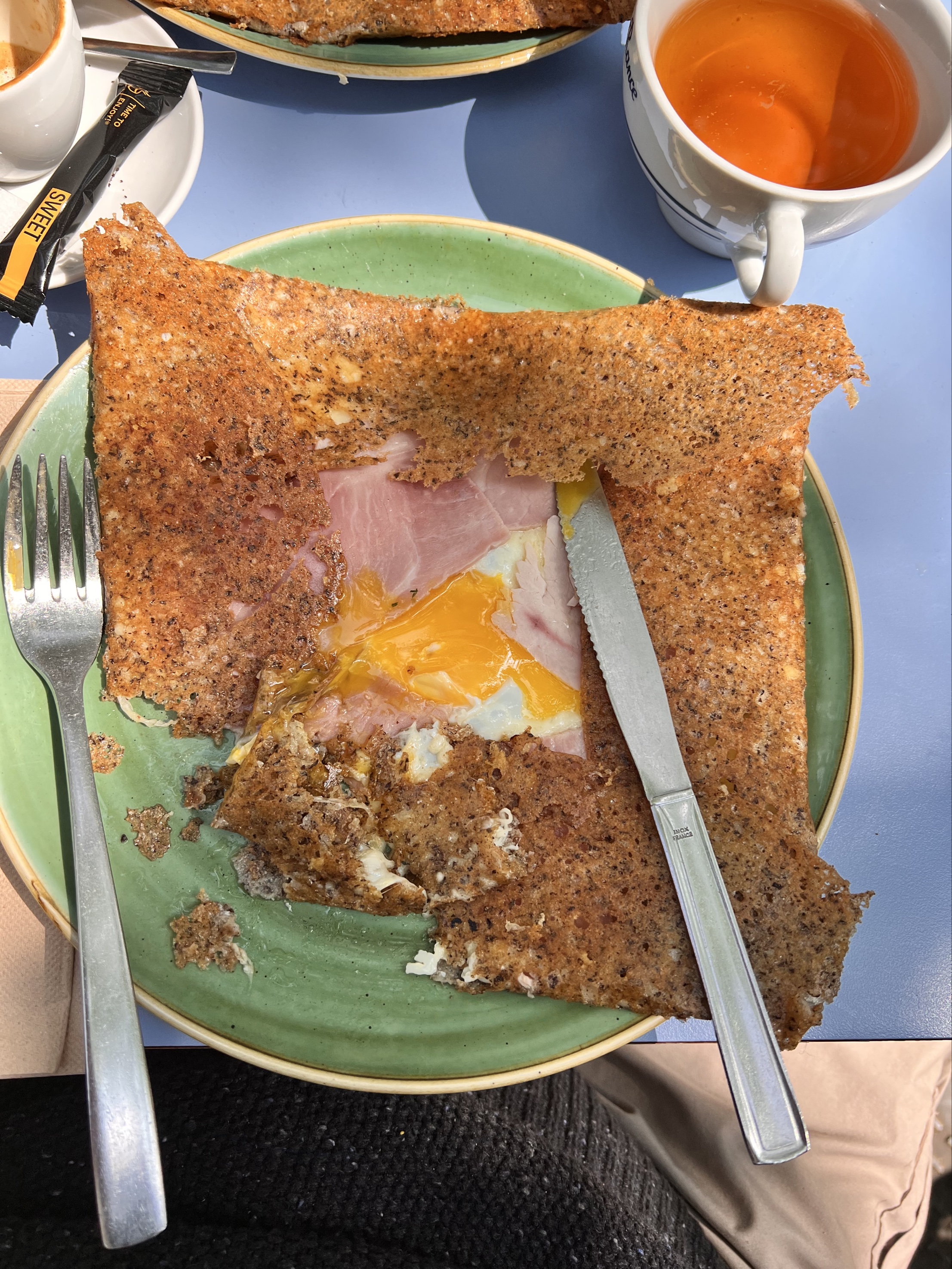 But on the way we stopped at a beautiful blue creperie for the lunch special of cider, salad, a ham, cheese and egg very crisp buckwheat crepe and then a sweet dessert crepe which we were too full to eat, all for $15.