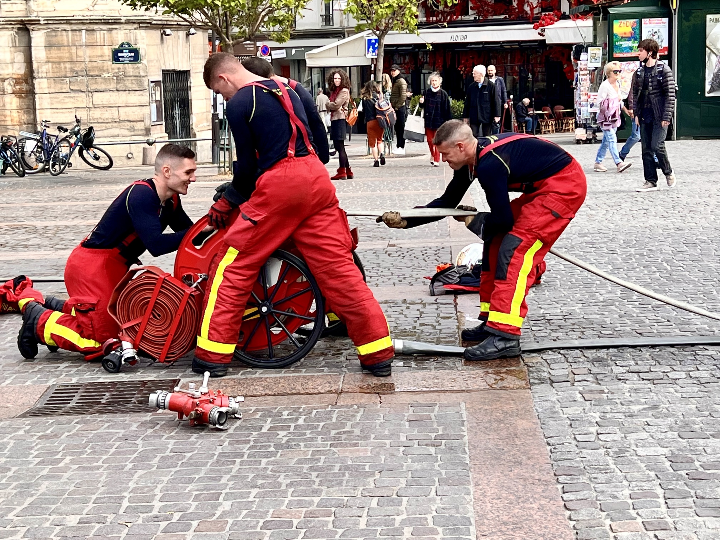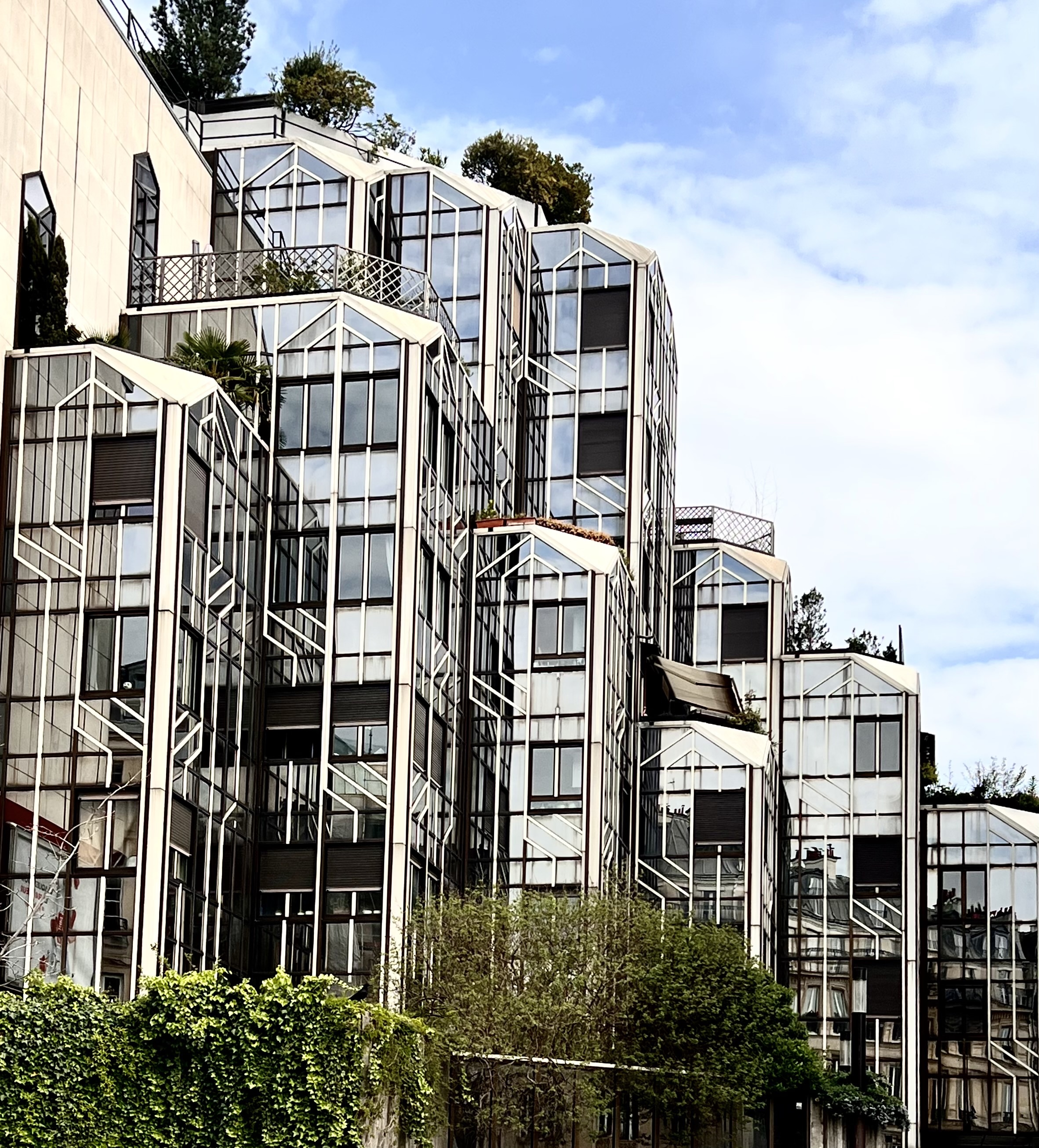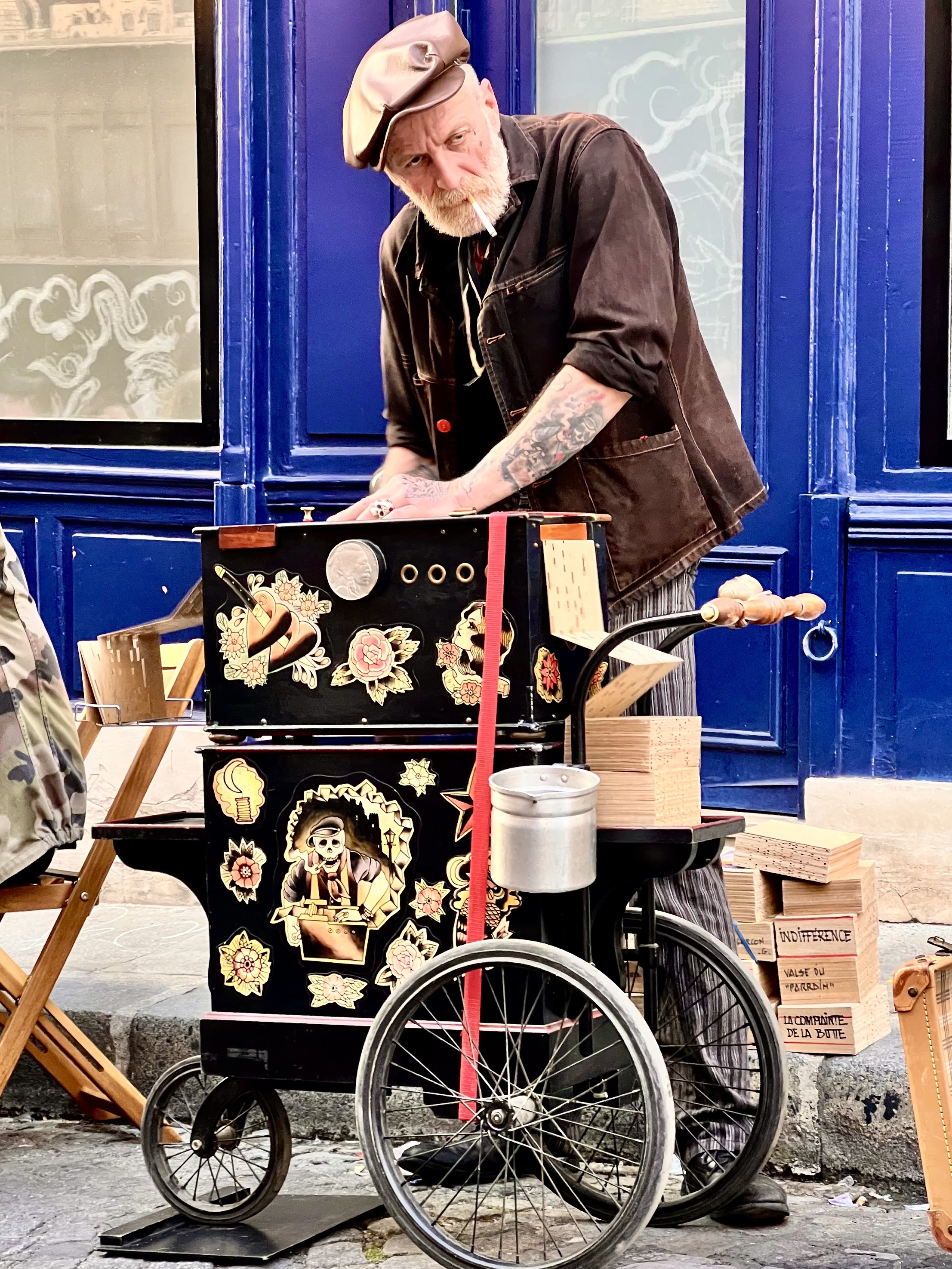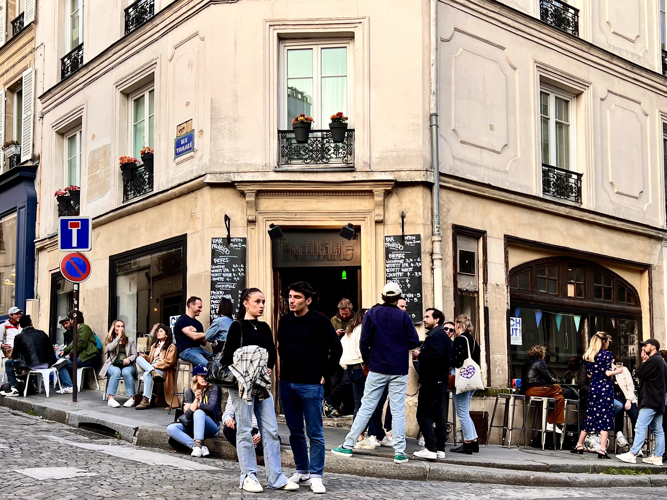We spent an hour there and then went back to La Droguerie, the buttons, ribbons and yarn store, one last time. Trying to find the Metro we discovered that under the park of Les Halles there is a shopping center with movie theaters and brightly lit stores. We decided to take it easy this afternoon and did, our last afternoon in Paris. We ate a delicious lunch at an outdoor cafe close by on Rue des Martres, crowded with shoppers. And then at the end of the day in the late evening glow we sat at a table at our favorite Cafe, Chez Ginette and drank a Mojito and watched the people go by: walking, on bicycles, on scooters, on motorcycles and in cars. And then we walked back through Montmartre to our Airbnb. It was a great way to soak in Paris one last time. We also had some excitement along the way which I will write about tomorrow.