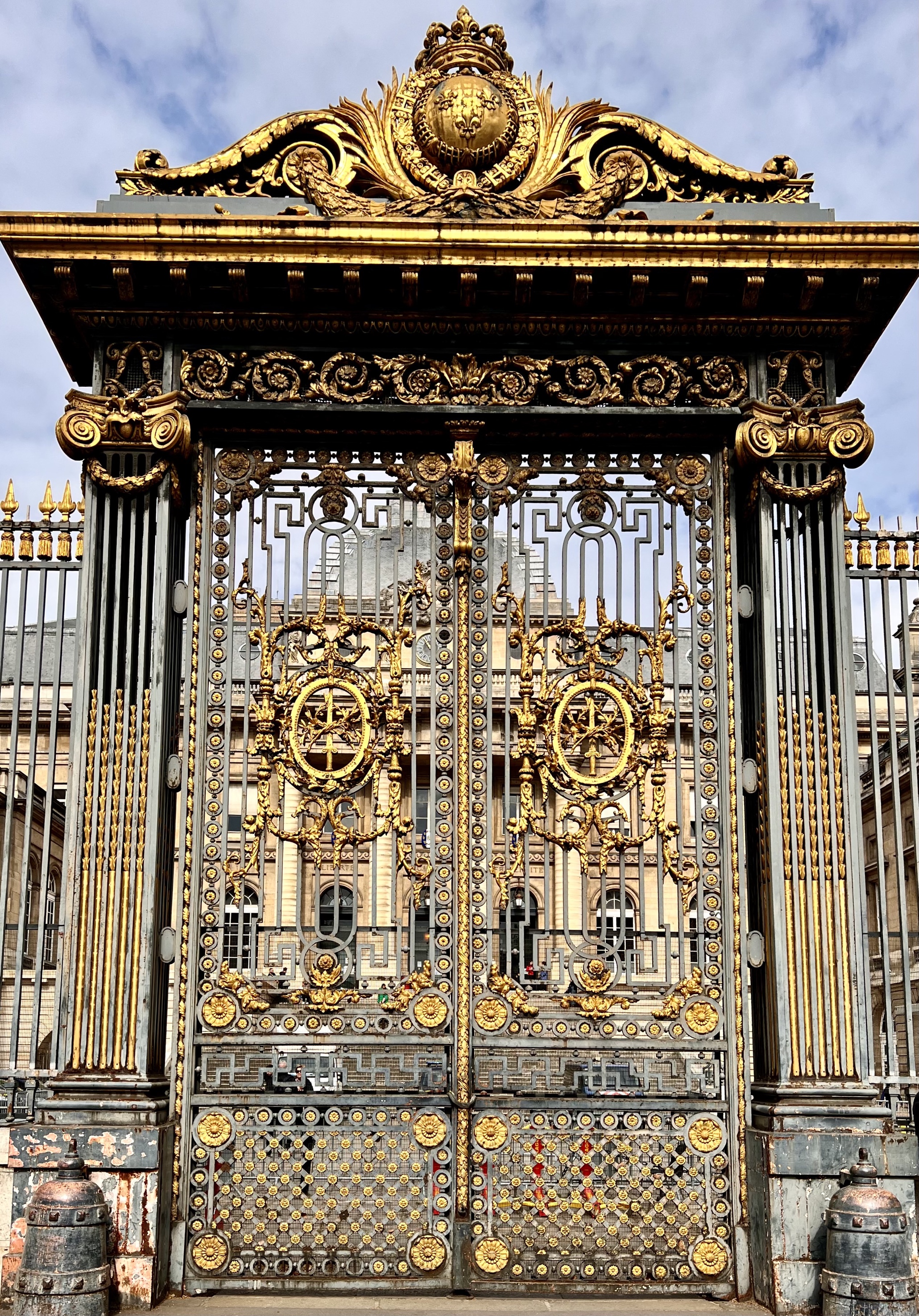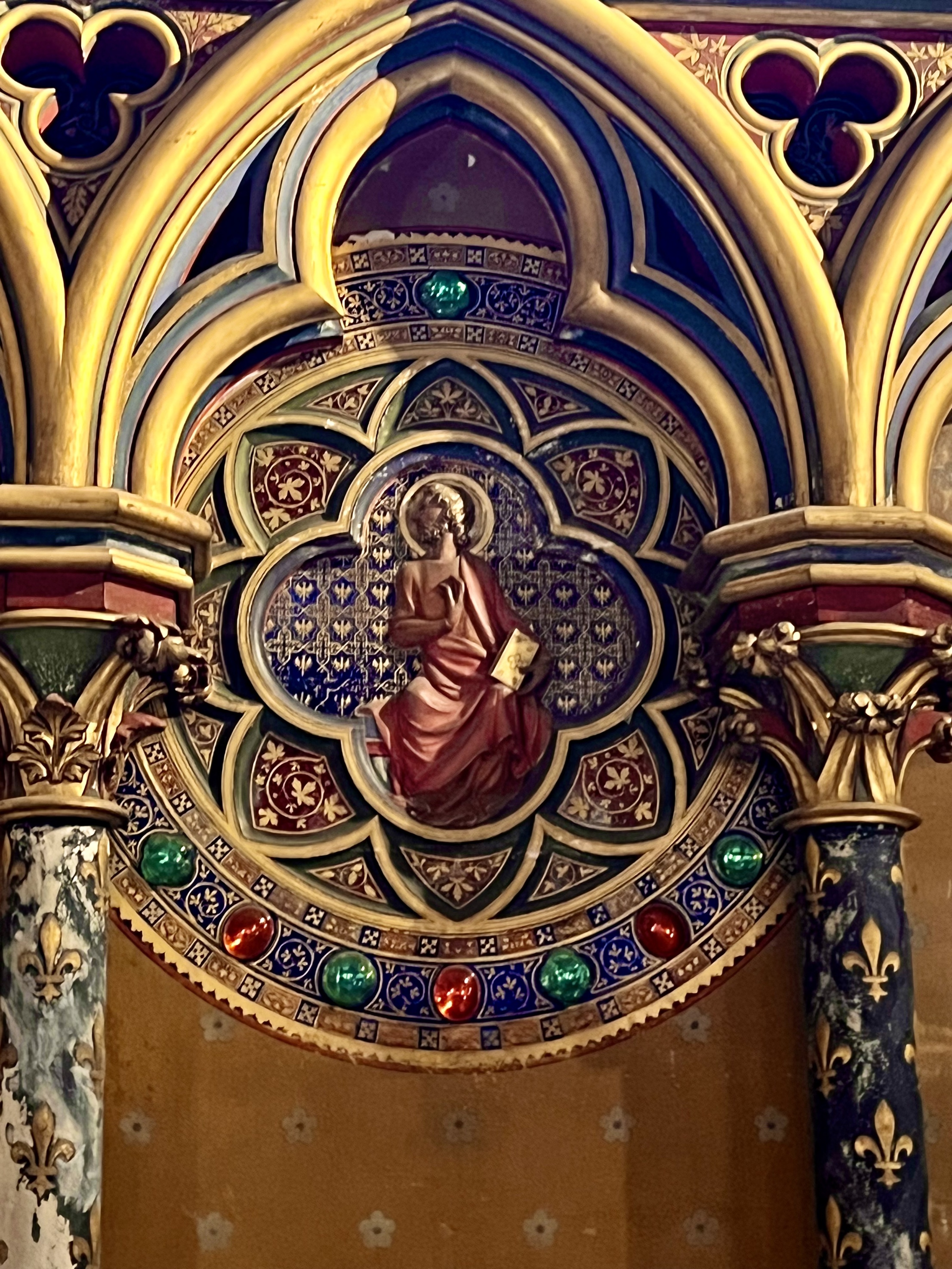 After waiting in line and being turned away a few days ago we bought tickets to Sainte Chapelle on line and when we got there at 10 discovered we had been in the wrong line earlier. 10 was apparently early and we got right in. And the stained windows of Sainte Chapelle were as beautiful as we dreamed they would be, delicate and graceful and light with intense colors both in the windows and on the painted walls.