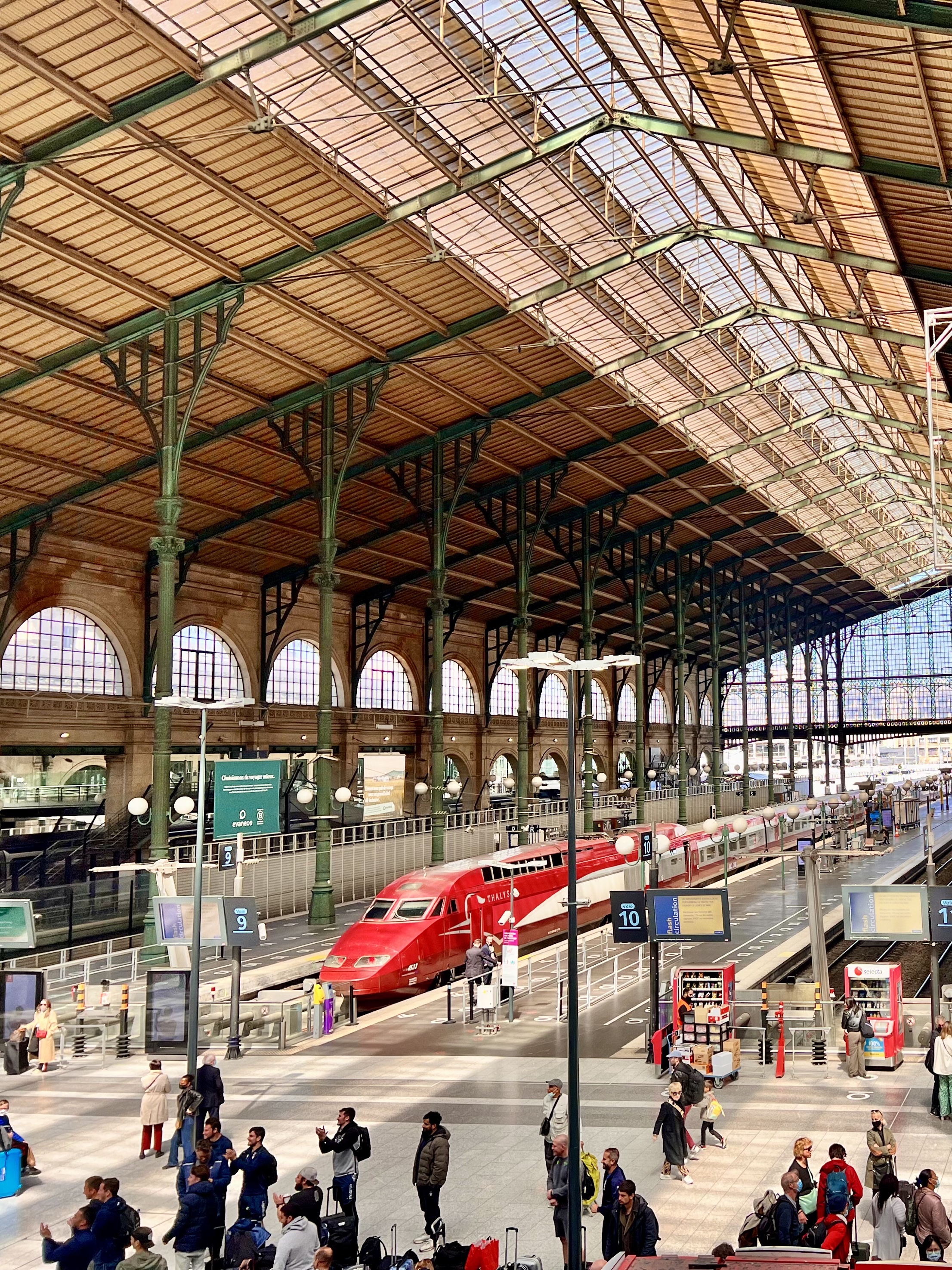 But even flying, where you see nothing because you are so high up, or the Eurostar, are slowed down at both ends. I couldn’t see any reason that I should arrive at Gare du Nord to catch the Eurostar at 1:15 p.m. when it didn’t leave until 3:15, two hours early for a two and a half hour train trip didn’t make sense. But Susie had been told to be at Charles de Gaulle for her Delta flight to Atlanta three hours early, which we couldn’t make because the Metro didn’t run that early, but she was there two hours ahead and there was a long line. But after going through the line with her and then going to security I came back past Delta and there as a line at least 50 yards long. Airlines may be fast in the air but on the ground they are very, very slow. And the same with the Eurostar. At an hour and a half early there was already a long slow line. First we had to be cleared by the French, who had a machine that was supposed to confirm that your face was was the same one as in your passport and even with six tries, each taking more than a minute, couldn’t do so for me and transferred me to another line where a man confirmed they were the same just by looking at me. And then we were cleared by the British which had a similar machine which took only three tries to recognize me. All of that face recognition took forever and the line moved very slowly. It took an hour to check into the train and then we waited in a lounge for another 45 minutes before being allowed to board.