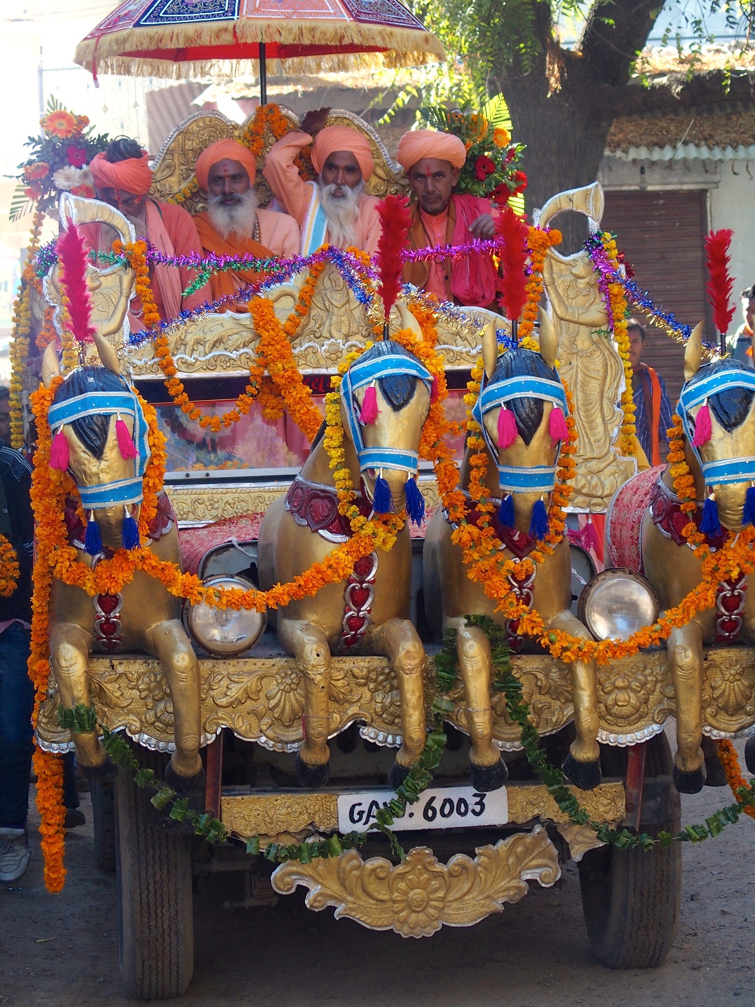 I had no idea what was going on and didn’t understand how or why the rituals were being conducted in Sanskrit. I didn’t know a soul there. And of course as an old whitebeared Don Quixote I stuck out and was completely out of place. I guess some of the people knew I was connected with Hasmukh Patel who was well known and this may have helped people to accept me. But I think the main reason I was accepted was that I was an old white man with a camera that no one knew how to respond to so they simply ignored me even as I wandered into the space where sacred ceremonies were going on and inserted myself into the parade and photographed people worshipping or being sprayed with pink powder or riding in a chariot with golden horses in front.