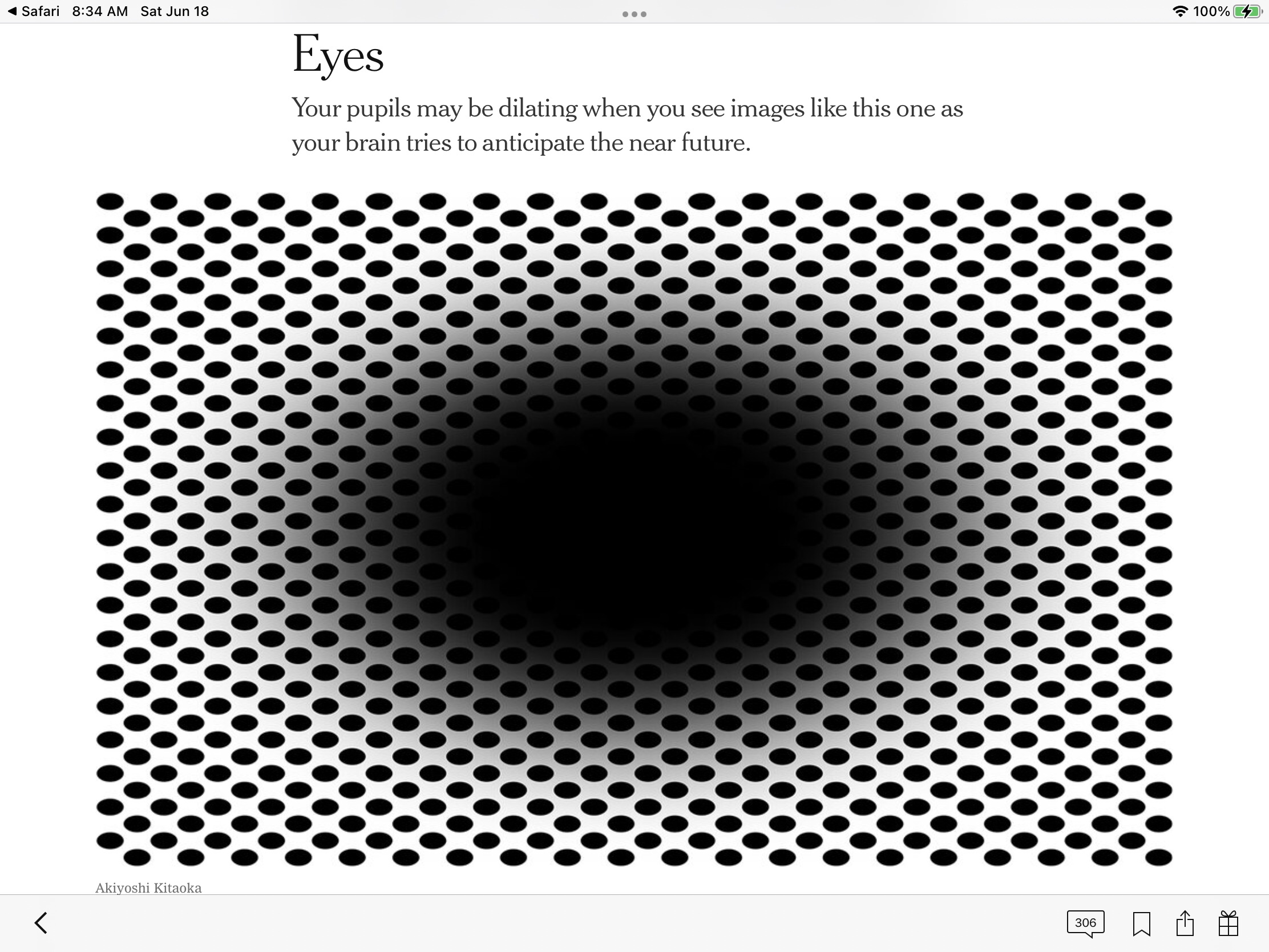 This seems to be the image of the entry to a tunnel and as many people see it, the tunnel darkens and you get sucked in as you move into the tunnel. It is an optical illusion that the the image is actually moving as you move into it. This is because for many of us in our response we are not seeing what is on the page, our brain is anticipating what is about to come and our brains are dilating our eyes in anticipation of entering a tunnel and as our eyes dilate the tunnel gets darker and darker. Not all of us do this so don’t disbelieve me if it doesn’t happen to you.