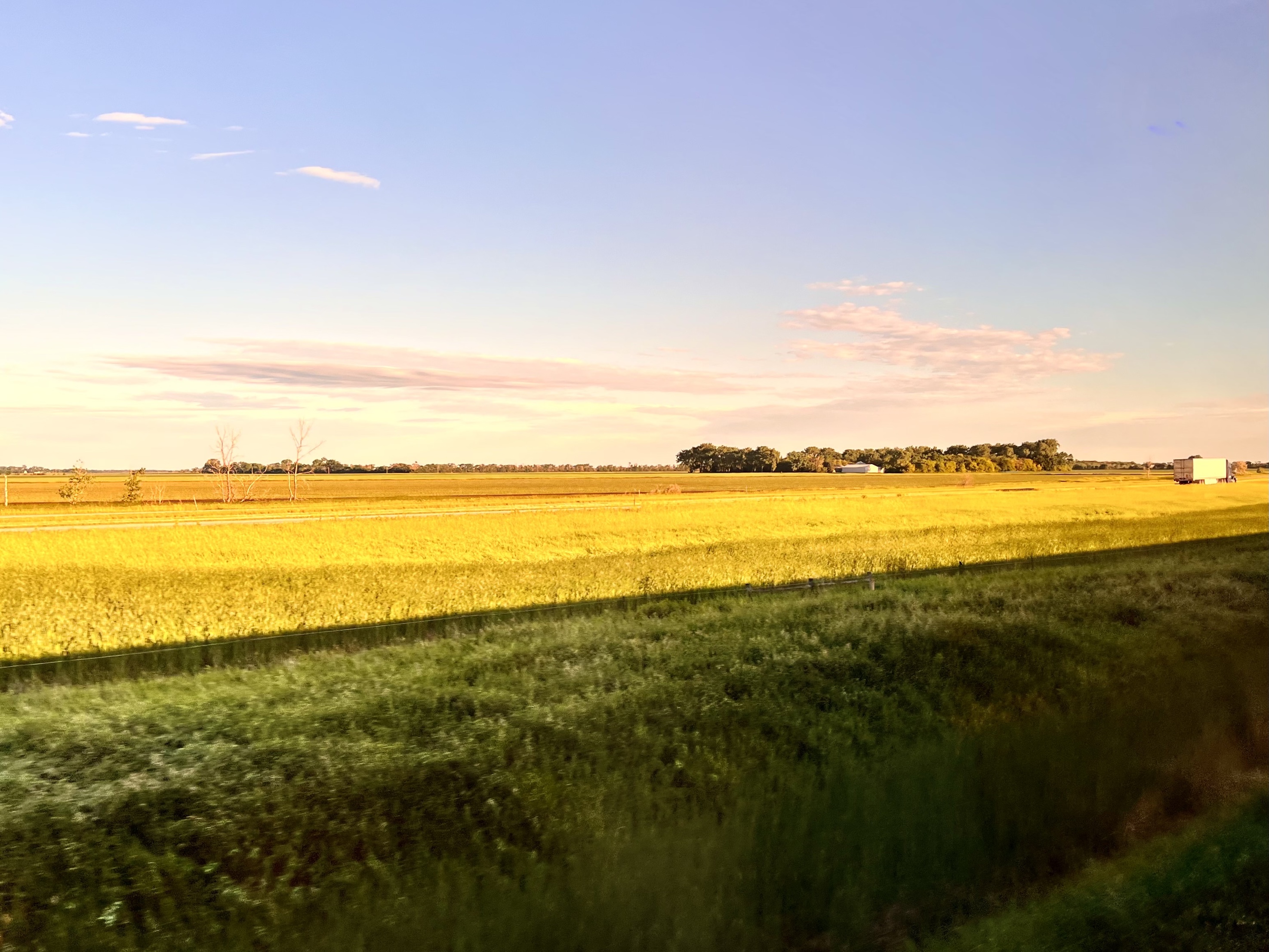 Up until yesterday the view out the window seemed to be familiar. Even Wisconsin with its many lakes and evergreen tinted forests seemed familiar. But today I feel as if I am out West. I woke up in Fargo, North Dakota and now the landscape is new. The first thing that strikes me is being able to see to the horizon with fields so huge that they seem to stretch almost the far, fields that it would take half a day to walk around which now a a sheen of new grass but I expect will soon turn into something else. I have a feeling of isolation.