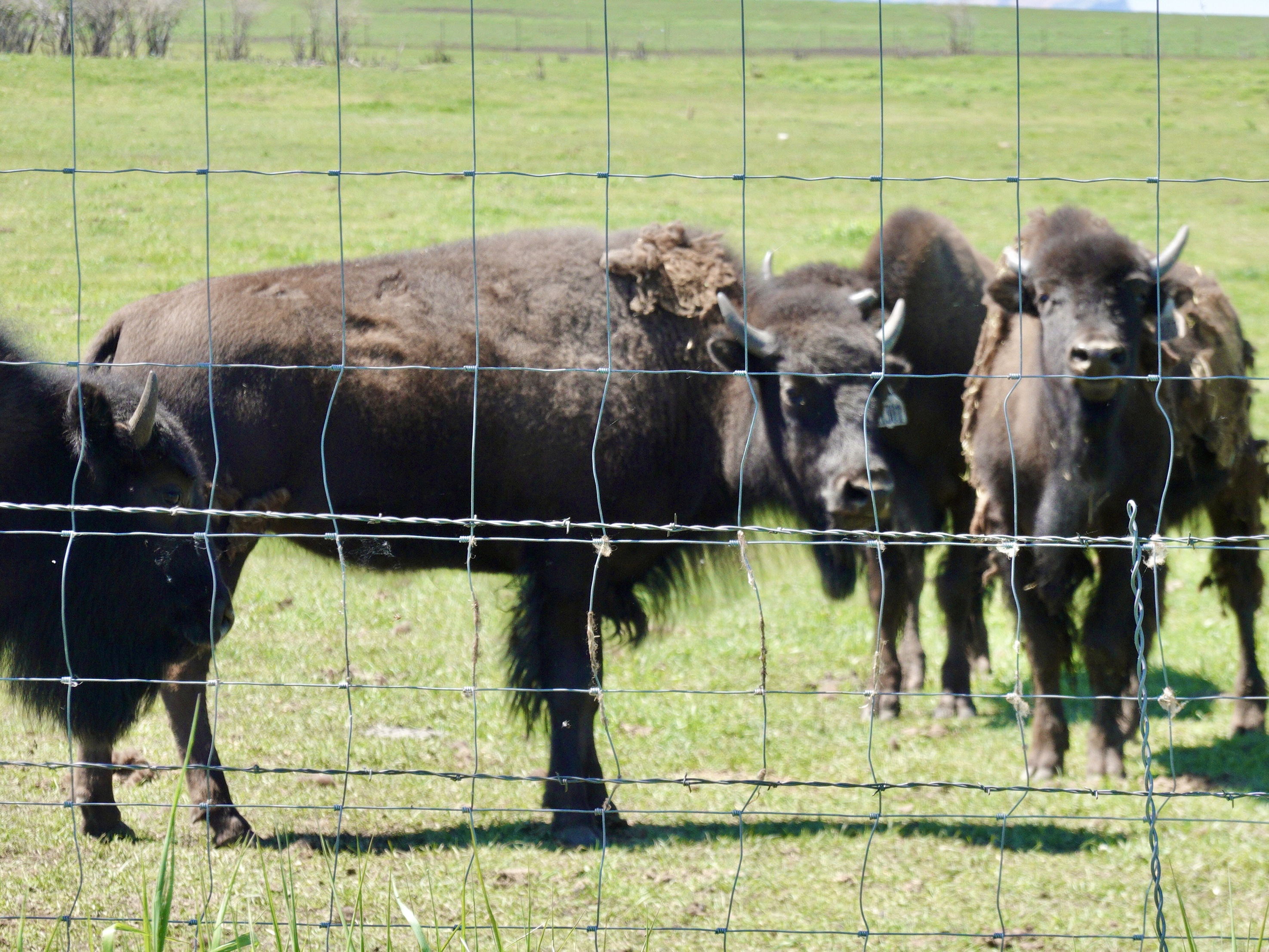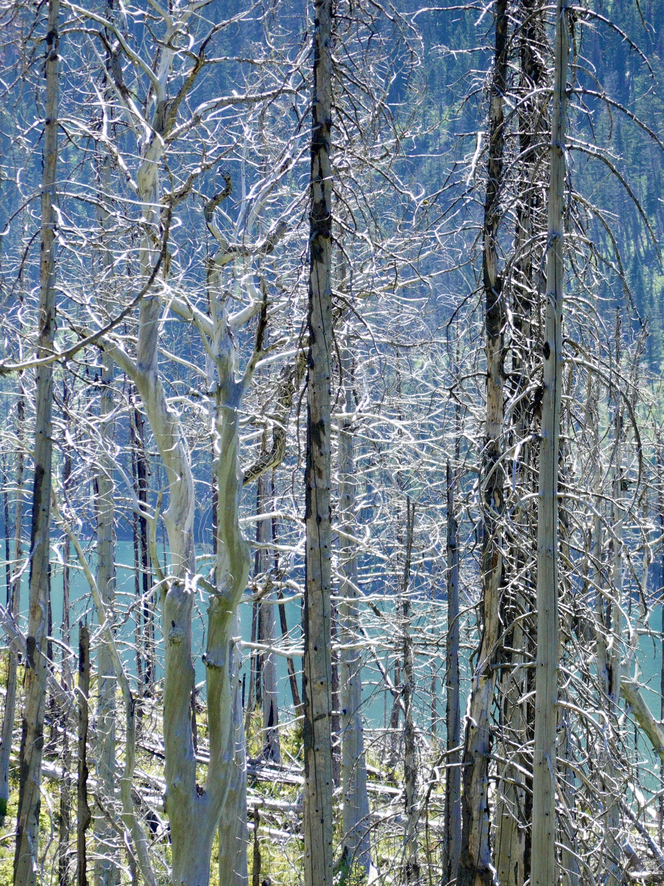 A big snow two weeks before our visit, which was on the second sunny and warm day after weeks of rain and snow, had closed the Going To The Sun Road, which is the most visited part of the park so we were only able to see 15 miles of road. But this shortened trip gave us time to get out again and again and to take short walks and to take as many photographs as we wanted to. A forest fire started by accident by camping Boy Scouts in 2016 burned 1000s of acres of this side of the park as seen in the bare white trunks of the dead pines. We saw a fox run across the road, saw a moose far across a lake, were told that there was a bear up the hill but couldn’t spot it and finally got to take as many photographs as we wanted to of bison behind barbed wire lolling on a ranch waiting to be turned into bison burgers, one of which I ate at our lunch stop at St. Mary’s Lodge restaurant.