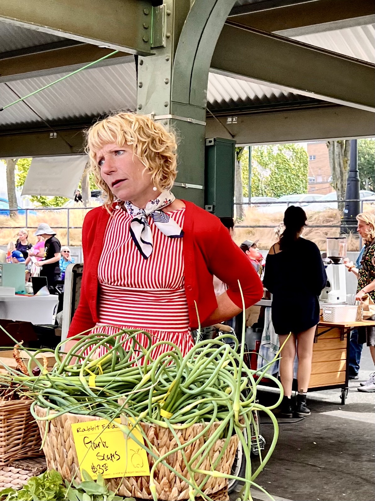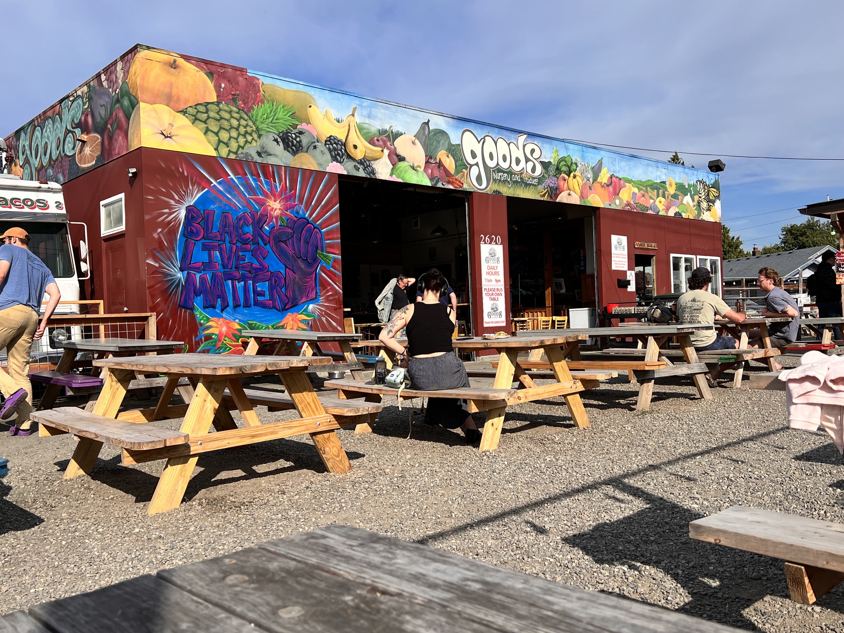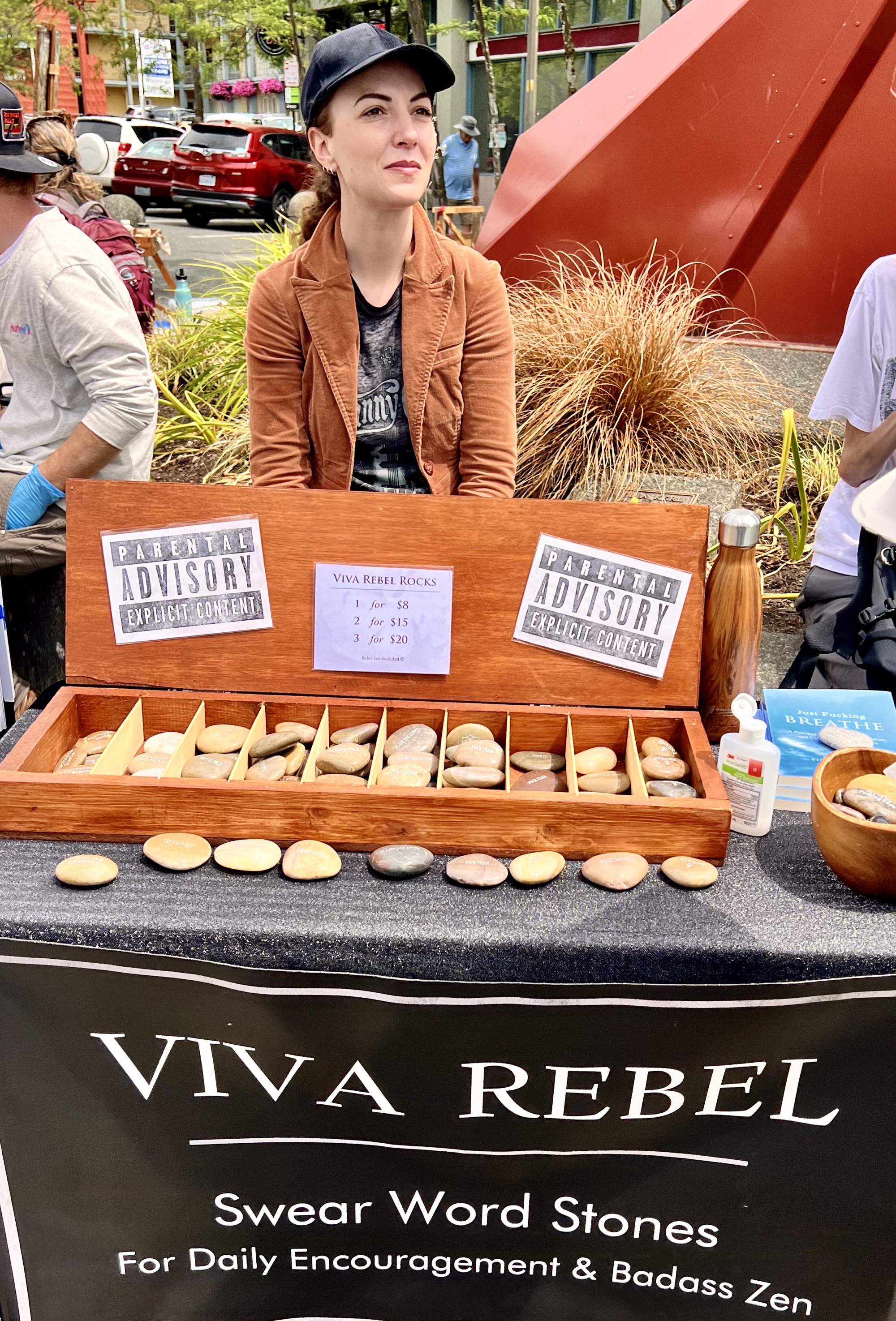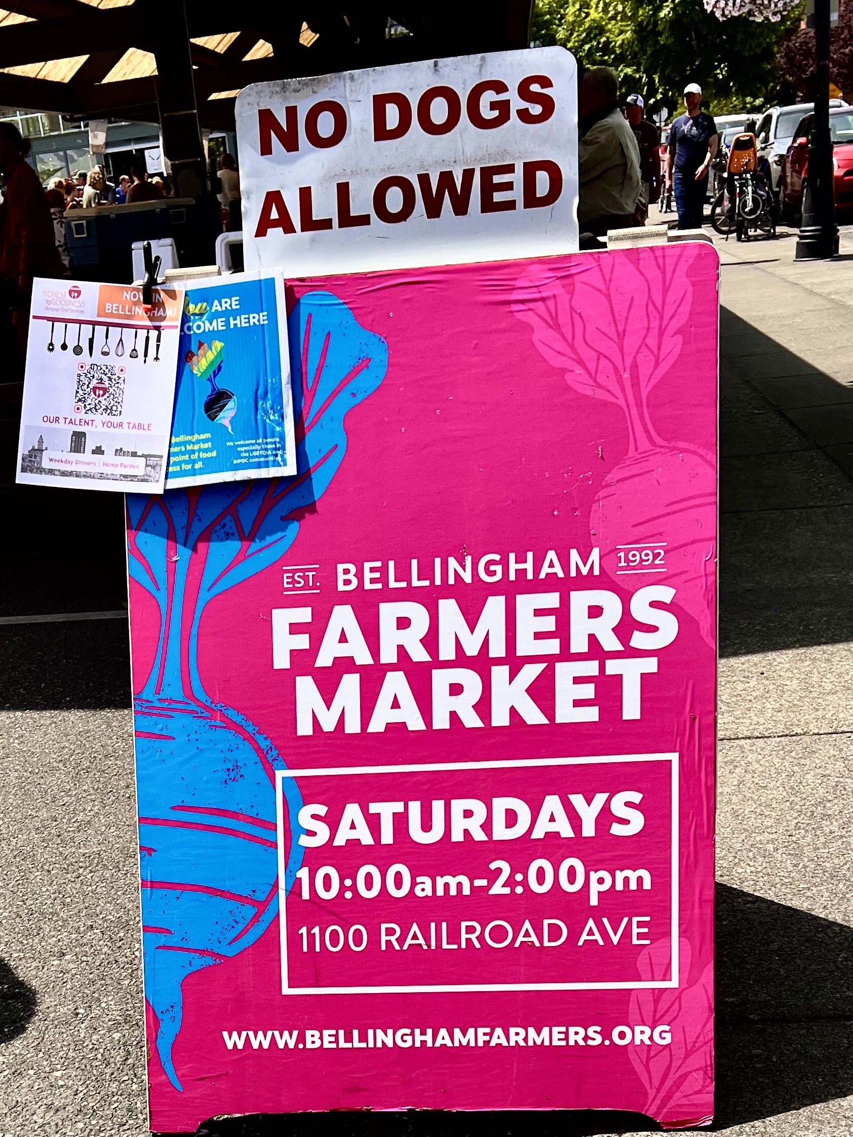 Yesterday we went to the Bellingham Farmer’s market and could have been at the Asheville Farmer’s Market or the Uncommon Market in the River Arts District. It was crowded and so much fun with such a variety of crafts and health products and food and even $8 rocks with Effing exhortations on every one being sold by a sweet looking hypnotherapist (the polite positive rocks she had tried hadn’t sold, these did). And then on a sunny afternoon we drank local beer at Goods, a brightly painted converted gas station with rows of picnic tables in front with A Que Tacos food truck on one side and Dumplings food truck on the other. I was home again.