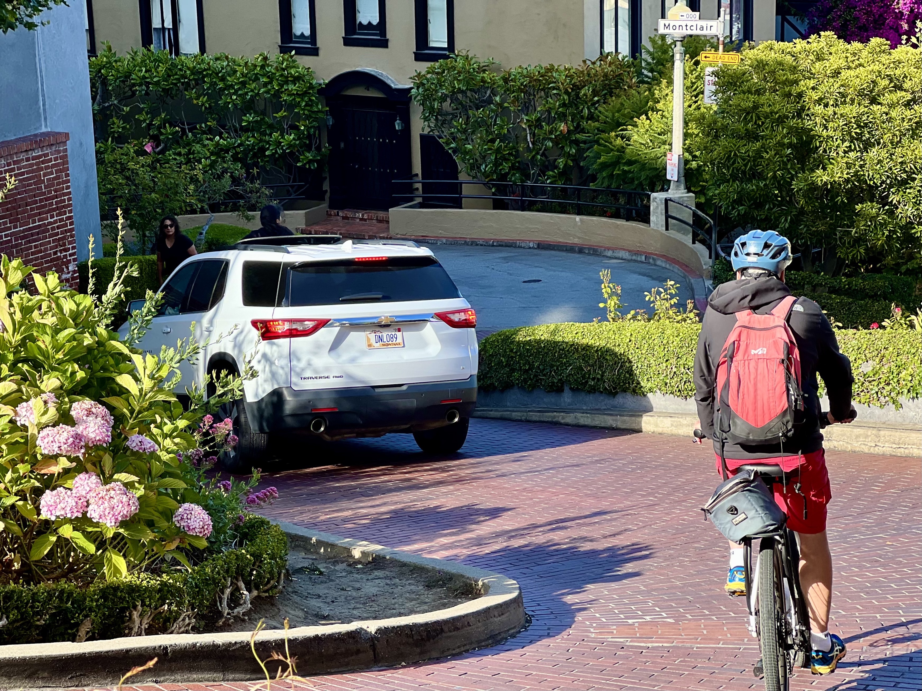 The second disappointing attraction was the fabled San Franciscos cable car which to me were clunky, grinding tourist attractions with a huge line before you could get on and then a bumpy ride up pretty ordinary streets, unlike the Big Bus ride through the most interesting parts of San Francisco. My cable car had a stand up comic as conductor who felt he was hilarious as he described what we were passing (short glimpses down streets to the bay), but who made up for it by neglecting to charge me for the $8 ride. I abandoned the cable car at the highest point, Lombard street, “the crookedest street in San Francisco,” where hundreds of tourist milled around (including me) with a view out over San Francisco which would have been more exciting if it hadn‘t been so windy and cold and we didn‘t have to wait so long for the cable car down (where a sober conductor charged me $8). Lombard Street was hidden by bushes.