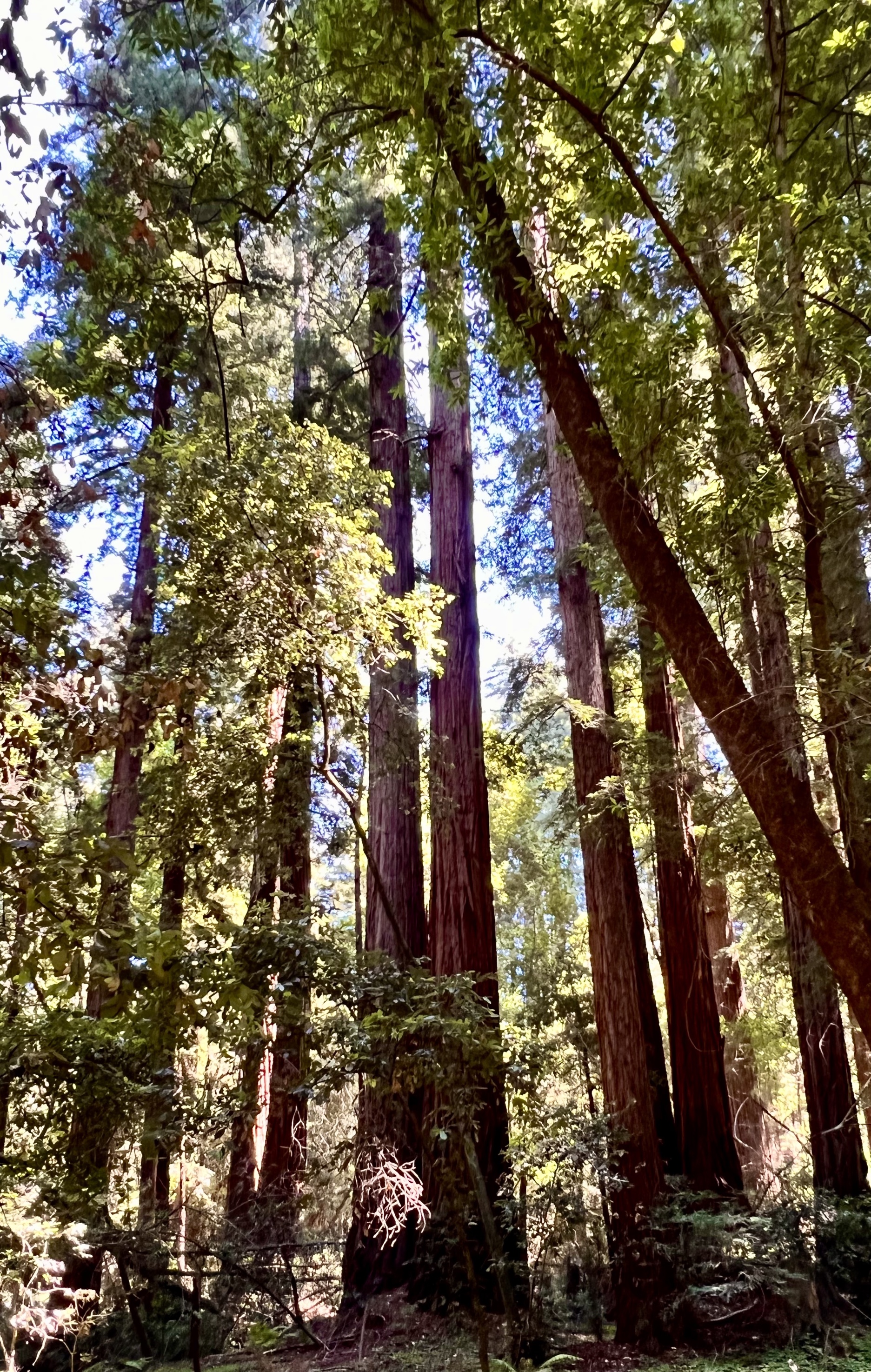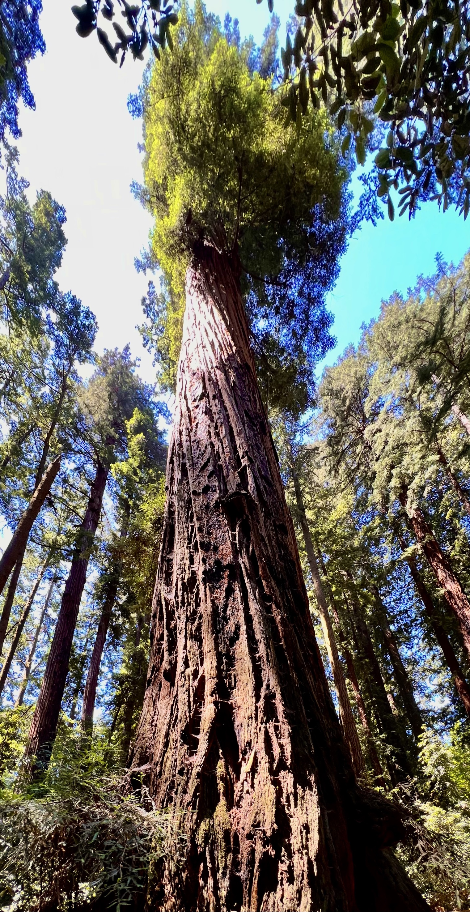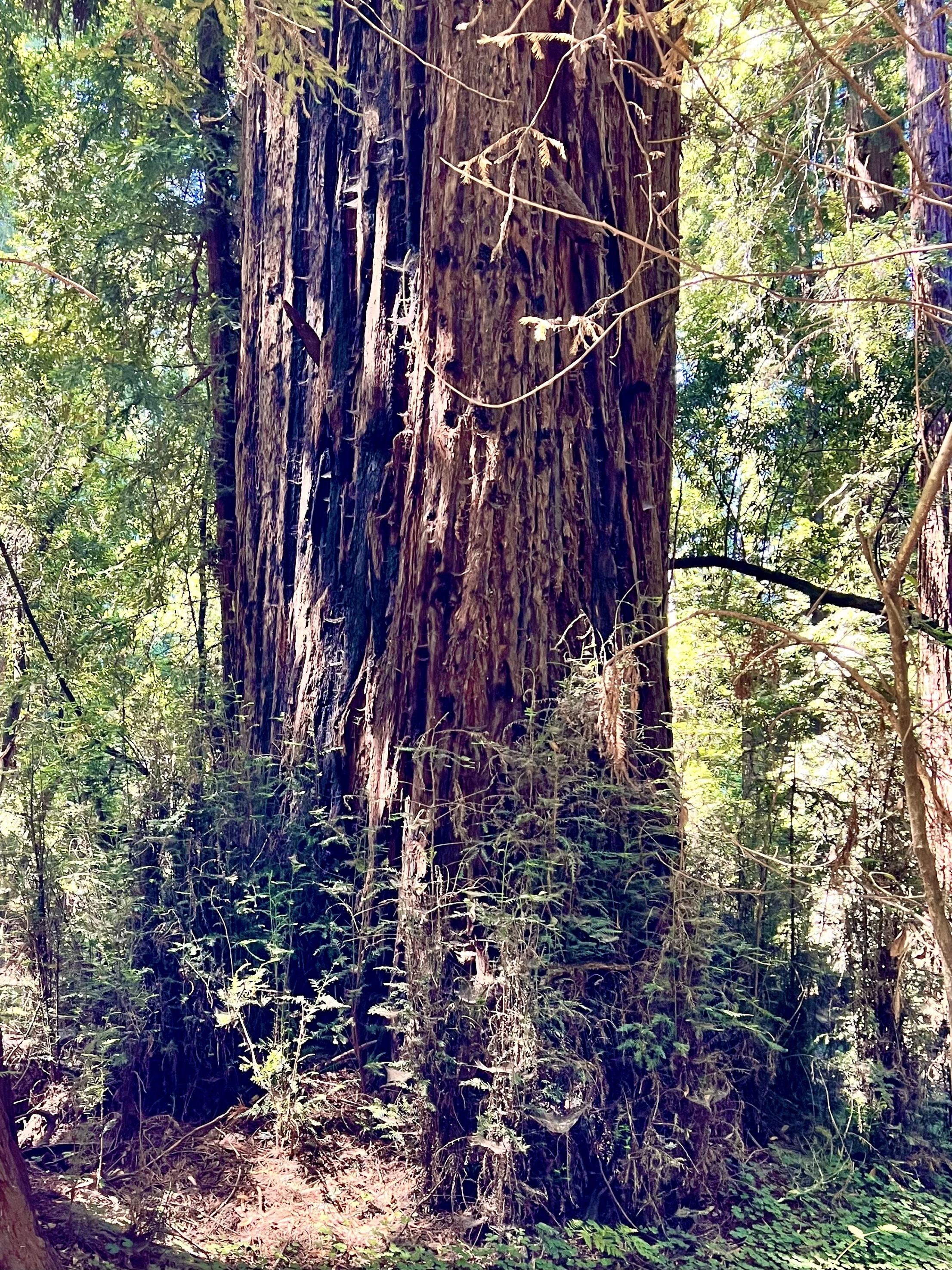 It also means that the redwoods grow in families of five or six or seven trees beside each other while growing from each other hundreds of feet into the air. And oddly, when they for some reasons fall into each other they grow together fusing into each other. They even support each other with nutrients because of the shared root system which is not deep, maybe ten feet, but spreads laterally over a wild area entangling itself with other redwood roots to give it strength. If a tree is cut the the root system sends up more sprouts. In addition, the very thick bark and tannic acid in the bark protects against insects of all kinds and against forest fires. Even if part of the trunk is burned away the rest of the tree can survive.