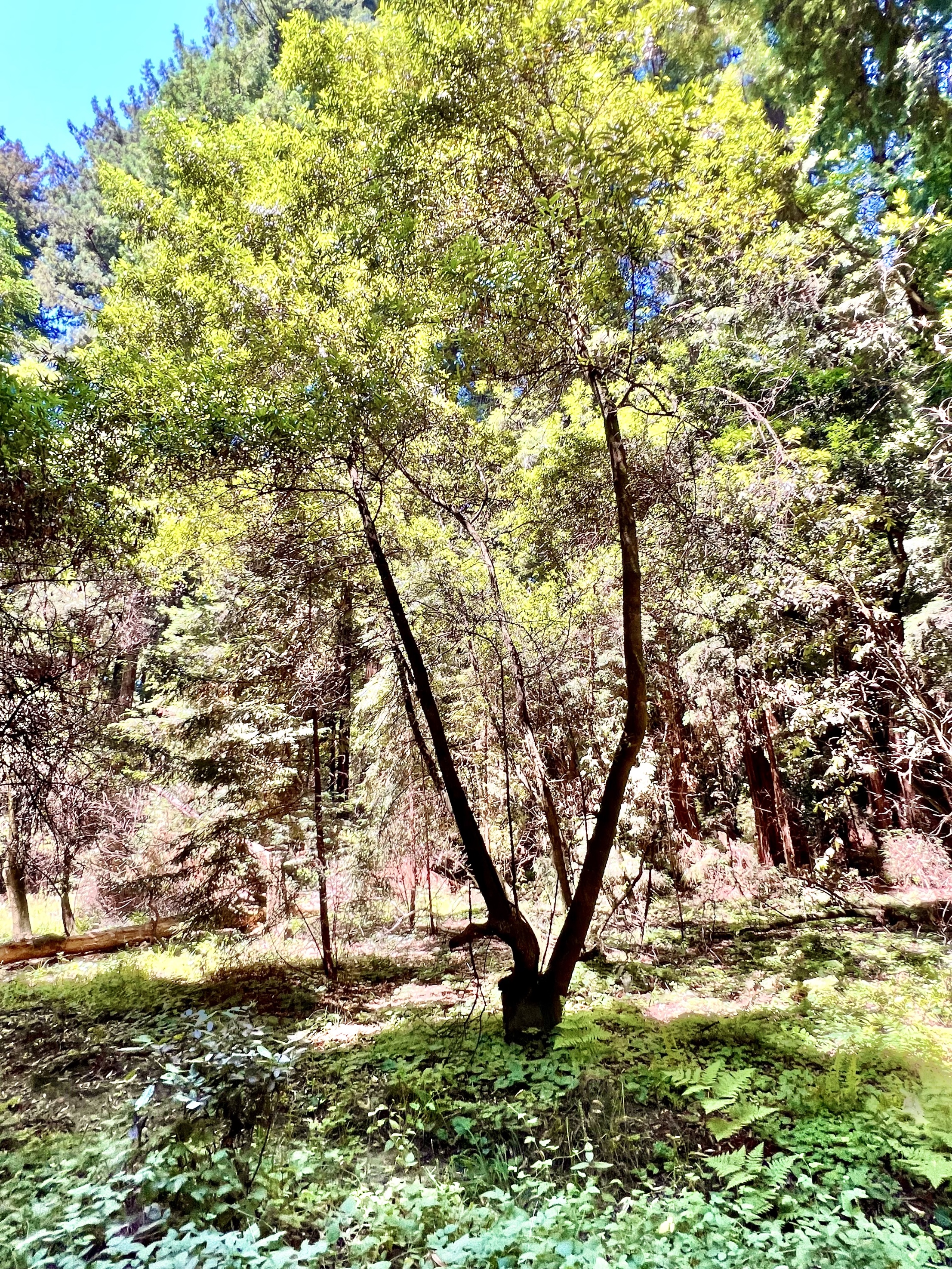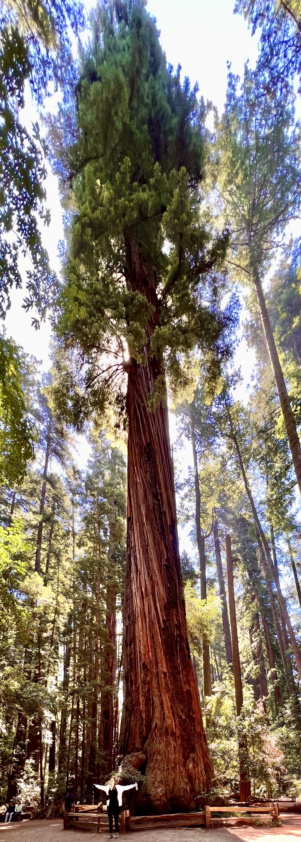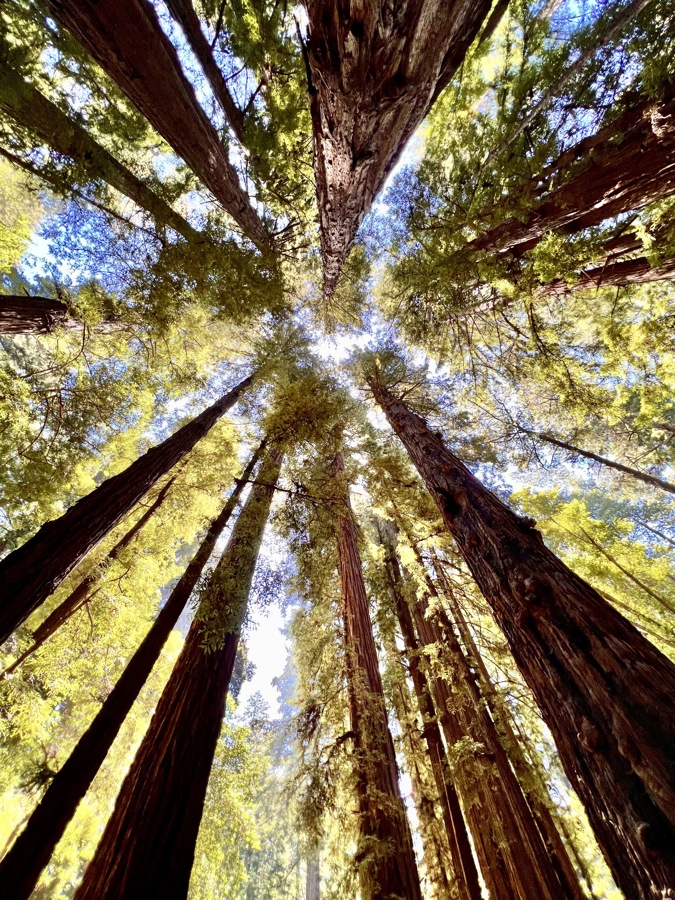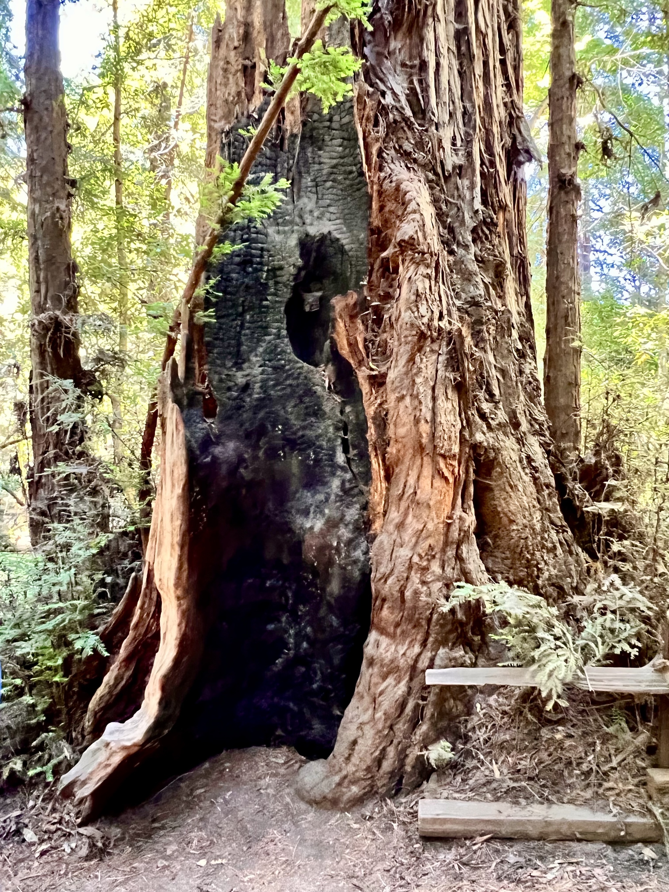 It also means that the redwoods grow in families of five or six or seven trees beside each other while growing from each other hundreds of feet into the air. And oddly, when they for some reasons fall into each other they grow together fusing into each other. They even support each other with nutrients because of the shared root system which is not deep, maybe ten feet, but spreads laterally over a wild area entangling itself with other redwood roots to give it strength. If a tree is cut the the root system sends up more sprouts. In addition, the very thick bark and tannic acid in the bark protects against insects of all kinds and against forest fires. Even if part of the trunk is burned away the rest of the tree can survive.