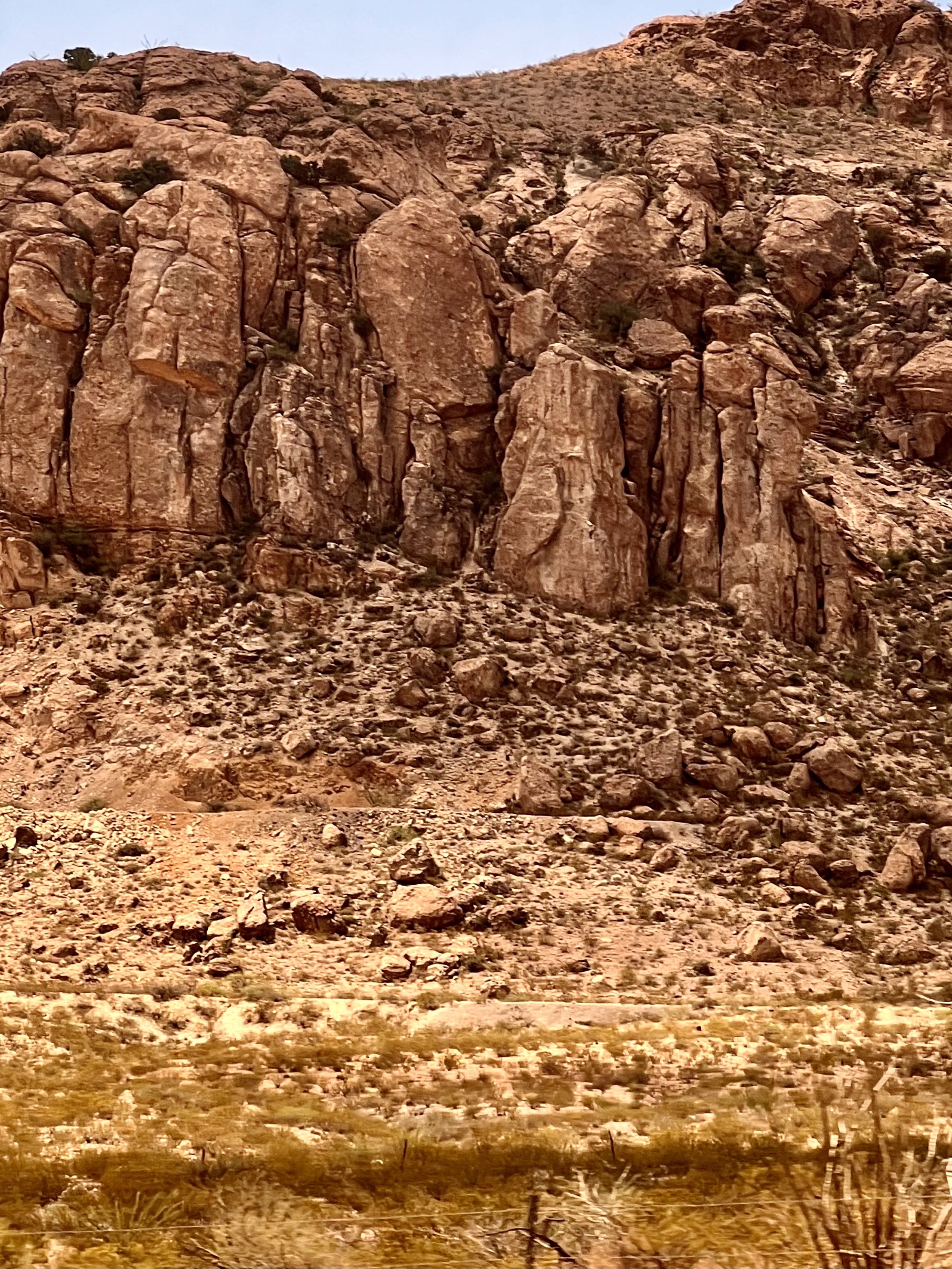 This was my longest leg of my Amtrak circling of the United States, 48 hours plus the four hours we were late, 52 hours, with two nights sleeping in a reclining seat. And I have the least to report of any two days on the trip. I went to sleep at 10 p.m. on Sunday and woke up in the Arizona desert and stayed in the Arizona desert all the way through New Mexico to El Paso, Texas. There was always the same brown desert with scrub trees and brown grass and purple hills in the distance. At one point our route took us near jagged hills that had a stark empty beauty.