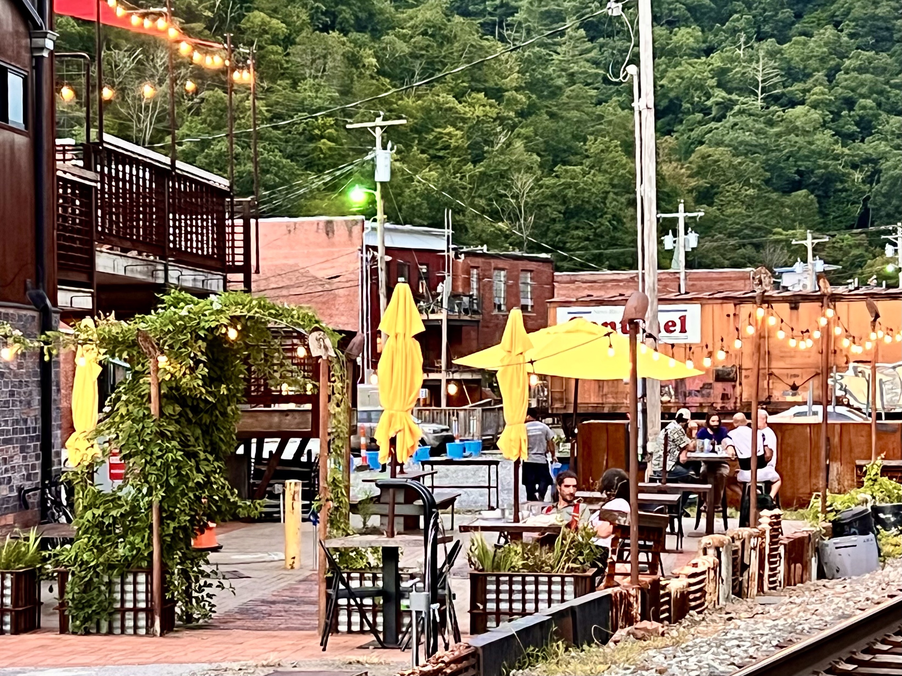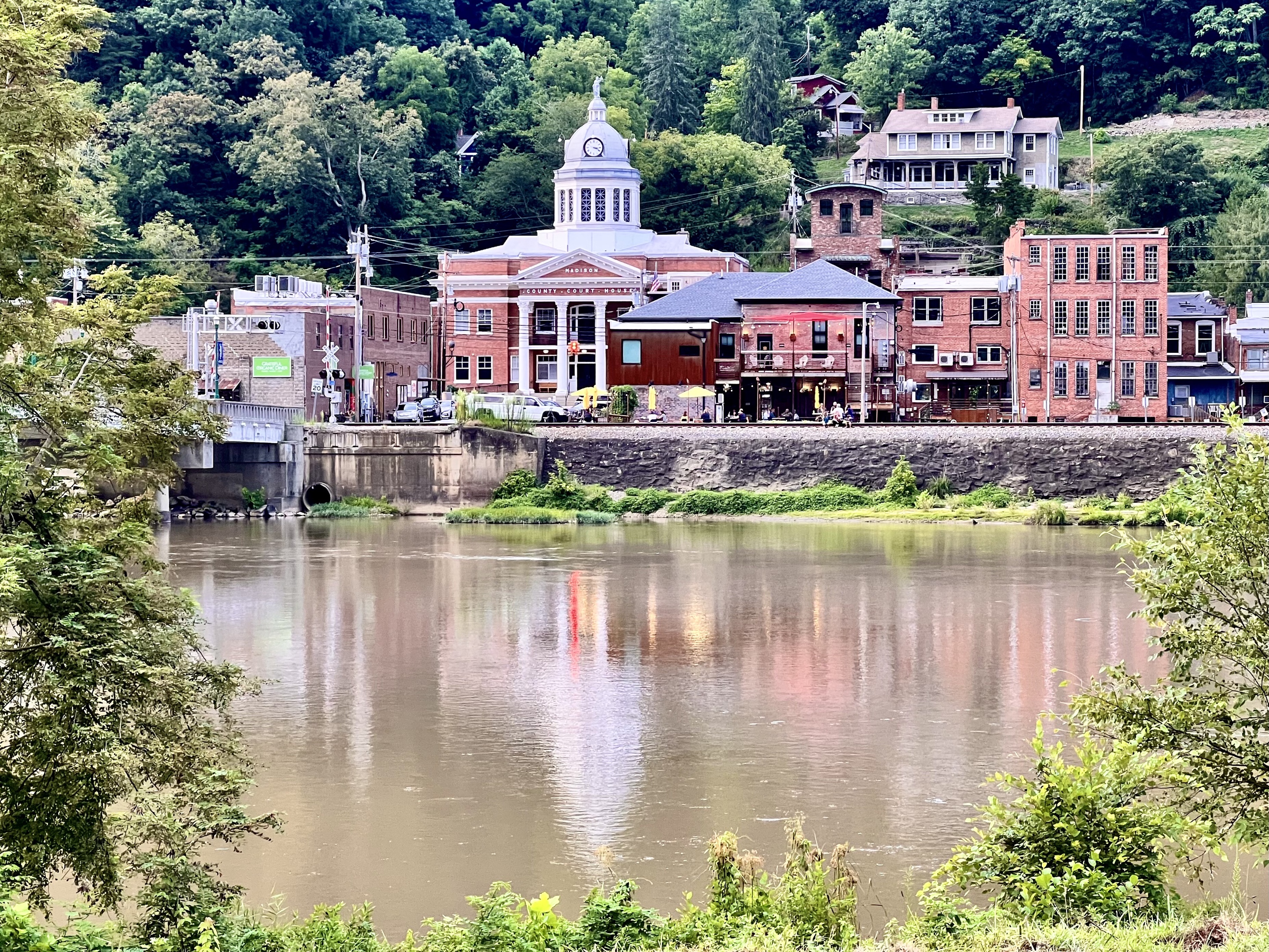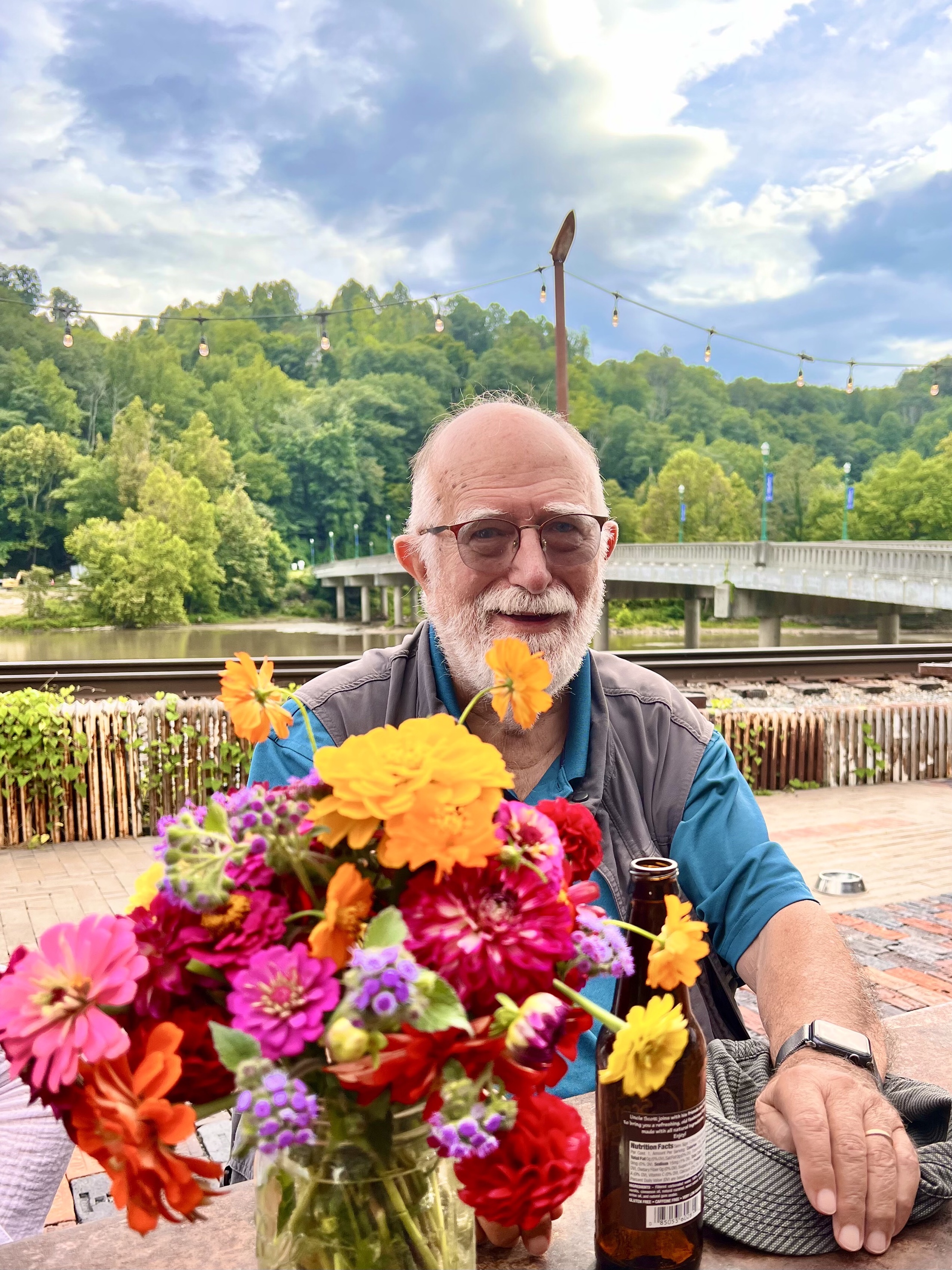 Today was my 85th birthday. It was also the 59th wedding anniversary for Kathe and me. Quite by accident, because it was the day the chapel was free and relatives could attend, Kathe and I married on my birthday. Then for 59 years I never forgot our anniversary because it was my birthday and for 59 years my birthday was an afterthought. But this year Kathe is not here and we couldn’t celebrate our anniversary, but my children and their families took me out for a birthday dinner at the Marshall Jail Hotel on the bank of the French Broad River. Until a couple of years ago this was the Marshall police station and jail, but then they moved out and the jail, with a number of its original furnishings became a hotel with Zadie’s bar and restaurant on the first floor. We sat on the patio beside the railway tracks. Just beyond the railway tracks was the full, muddy French Broad River on its way to the Mississippi.
