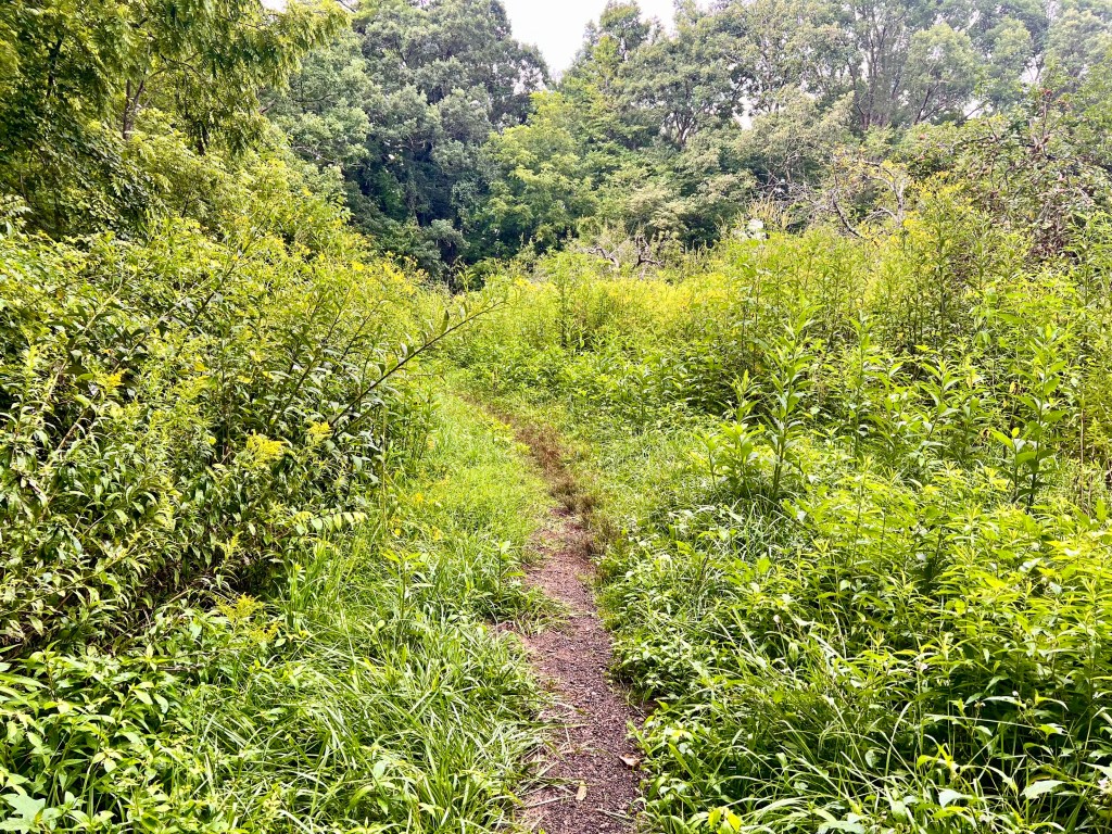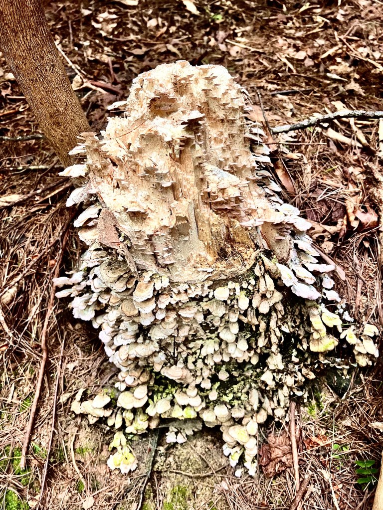 And it did. I walked slowly and a little wobbly, my back hurt and I wasn’t interested in anything I saw. I took no photographs. But even in my numb state I couldn’t help notice the profusion of life all around me. There were plants with a huge variety of symmetrical leaf shapes leaning into the narrow path. In the long slow process of evolution, probably from one original reproducing form of life which then branched out to all plant life and animal life and fungal life and virus life, all of this connected life was around me in profusion. There was one kind of tree competing with another kind of tree but probably with some kind of symbiotic connection. Hundreds fo kinds of plants, each with their distinctive leaves and flowers and seeds which had all developed long ago from the same source and branched out were here. And of course so were birds and insects and a white fungus that smeared on the ground. Even in my numb state this profusion and variety of life seemed fantastic and unexplainable.