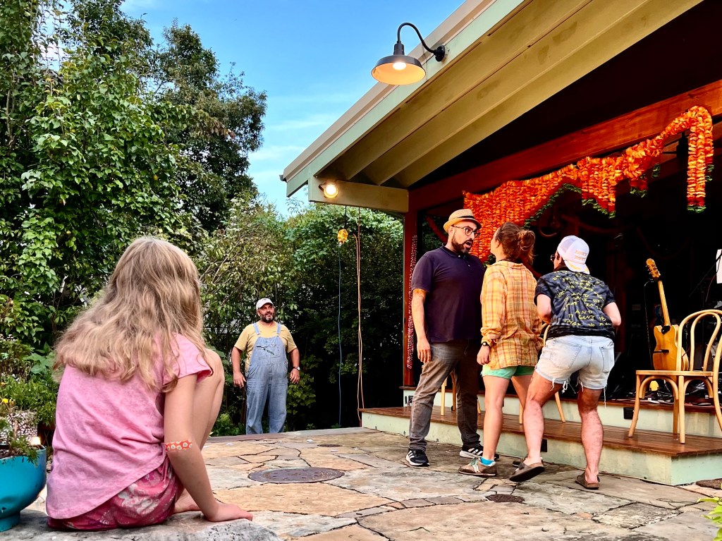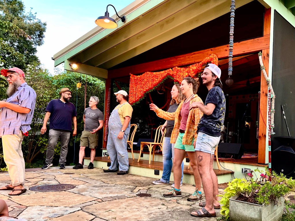 My photographs are not very good and I didn’t take very many of them, but on Saturday evening I went for the second time to the home of Paul Dixon and Jude Stuecker to an evening if Improv, improvisations. Their home in West Asheville is surrounded by a jungle of plant life and is adorned with all kinds of colorful metal figures made by Paul. On the back of their house Paul has built a covered stage facing into the back yard with an above the ground swimming pool to one side. Fifty or sixty people, neighbors and performers bring folding chairs placed to face the stage. Off to the side their two children, Lucy and Sylvia, served Korean Hot Dogs with ten or so Korean condiments made by Paul and offered drinks for a $10 donation. A neighborhood band warms up the evening and performs between acts.