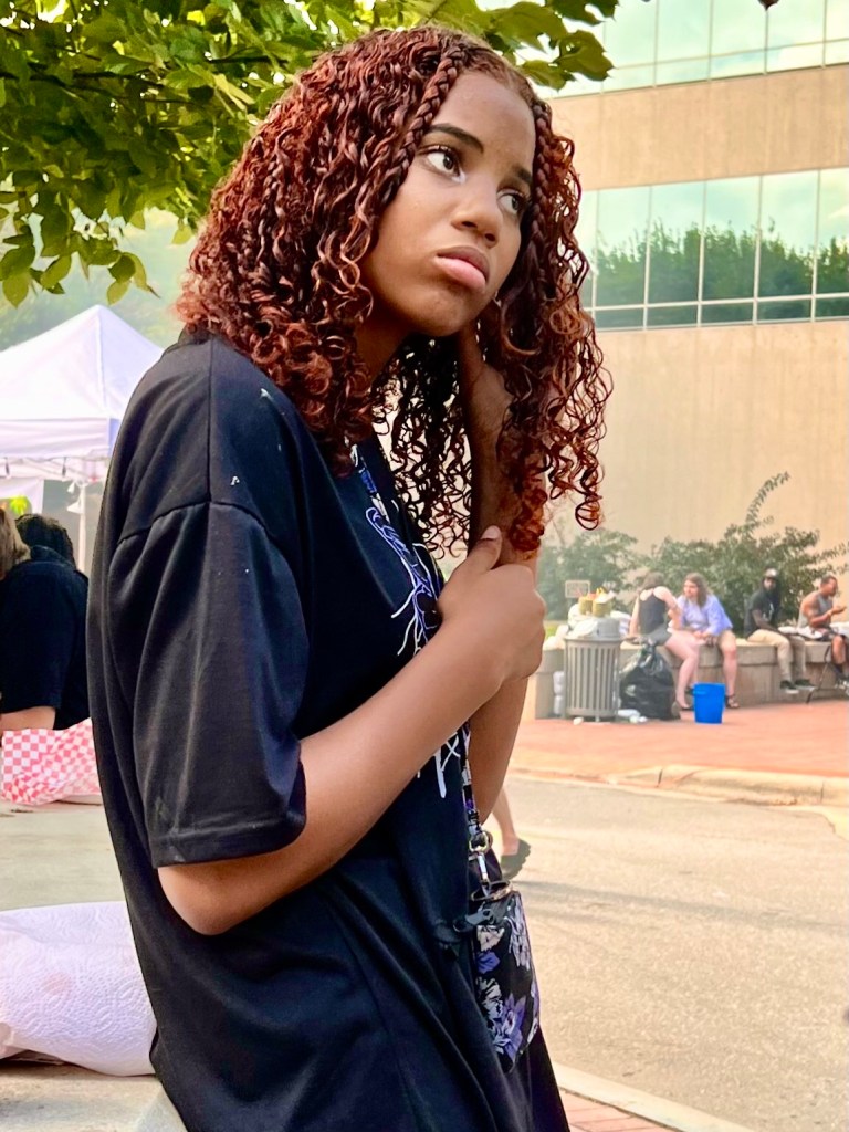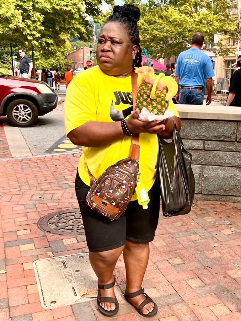 When I came out of the Asheville Art Museum (actually on Saturday not Thursday) and stepped into Pack Plaza I encountered a throng of my fellow Americans and they didn’t look anything like me. Their hair was dyed or wrapped differently, their skin was a different color, their clothes were brighter, the fried Caribean food they were eating from food trucks was spicier, their music was far from the Scotch Irish country music of Shindig on the Green the previous Saturday.