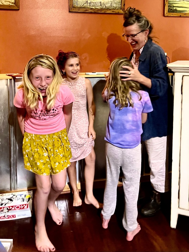 I took photographs which all turned out fuzzy. But the high point of the entertainment for the evening was three daughters who were having a terrific time making prank calls with outrageous requests to restaurants and other place. Susie joined them and I have a few photographs of their fun.