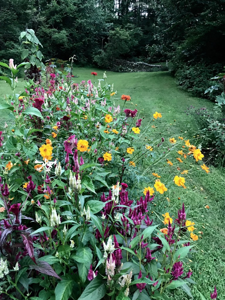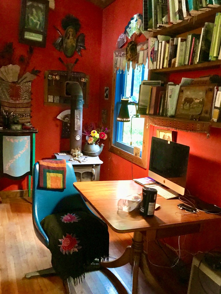 There was an 8×15 foot cabin with a small loft up a ladder and a porch looking out over a meadow to a stream with an outhouse up the hill in the woods. There was also a leaning, about to collapse, barn and an a house in bad shape and a building that Todd could use as a shop. Over the years Susie has made a number of vegetable and flower beds with enriched soil and planted flowers everywhere. Todd built what was supposed to be bath house and laundry shed to which they added a big porch and is now Susie’s writing place with a futon for guests. Their water flows from a spring up the hill and they have electricity with a hot water heater and an outdoor enclosed shower under a tree. Todd also built a large storage shed. They have been living here for 22 years and enjoy the simple life canning enormous quantities of tomatoes and beans, heating their little cabin with a wood stove and after the arrival of Internet using their computer as a television. In the summer they sit on the porch but in winter have only this one small room with a kitchen at one end and a table and a small couch. It is cozy.
