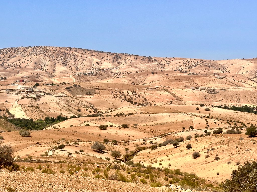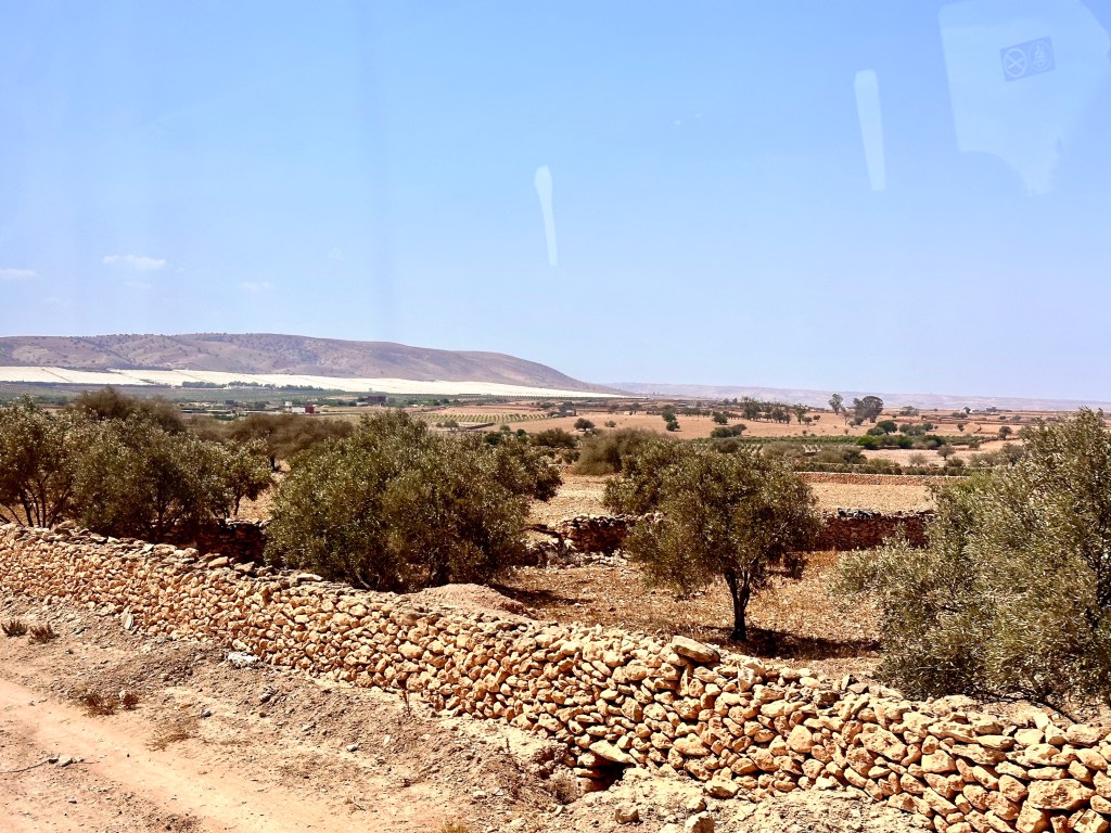 The woman sitting beside me with the window seat with the curtain pulled to avoid the sun was suddenly gone. I got the window seat and a great view for the rest of the trip. I don’t know what I expected but made the mistake of buy in my mind comparing Morocco to the USA or India. What disturbed me in my dazed condition was that there seemed to be plastic bags and bottles in every vacant lot. The land was barren and the fallow fields, probably waiting for the rainy season were full of rocks. The only thing planted and growing was olive trees. There were a number of horse drawn carts but none seemed to be transporting anything. Morocco looked like a very bleak place. There were rock walls everywhere, probably to dispose of some of the rocks, and every substantial building, factory or private house had a huge concrete wall around it. Some plots had concrete walls without anything inside, as if marking out their territory to keep everyone out. It seemed very odd.