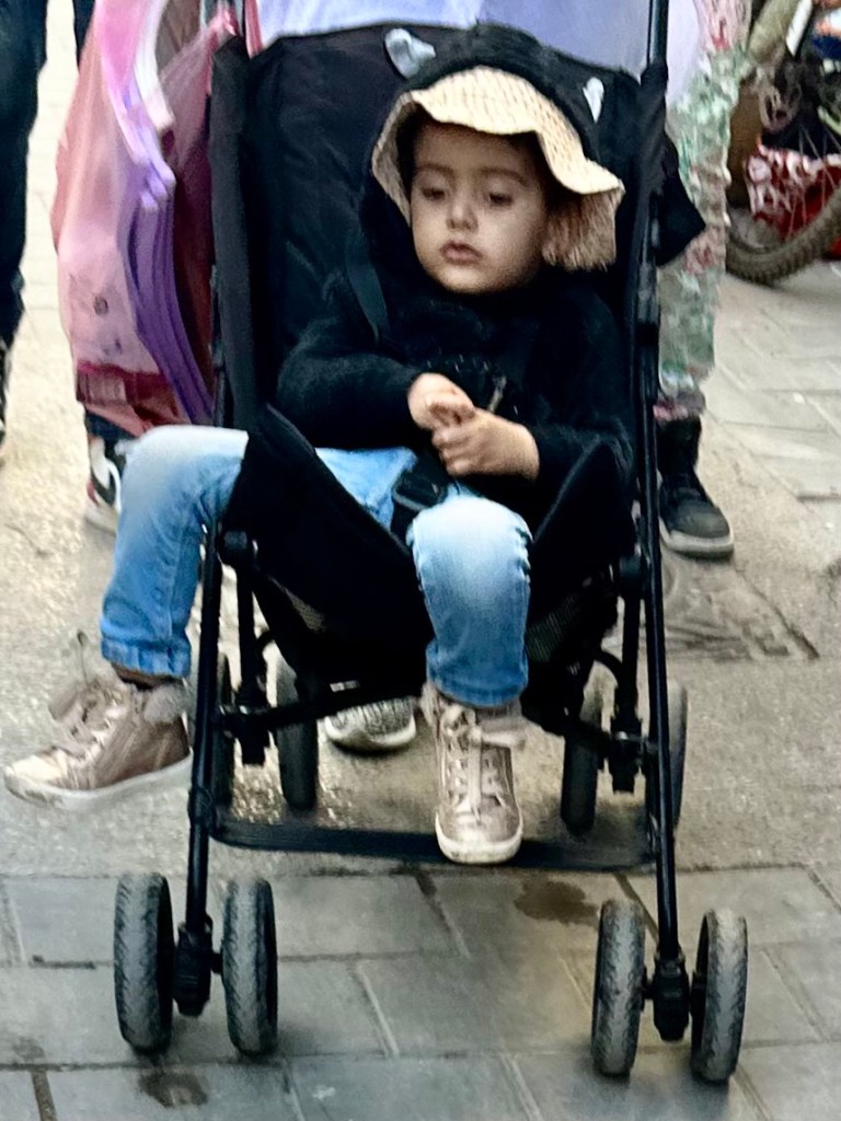 The square is general bedlam. Parents come to sit and eat soup and bread while their children race around the square. In front of me boys are kicking a soccer ball against a wooden gate as a goal with people strolling through the middle of the game, hardly paying attention to the balls whizzing by and thudding against the door. Kids on roller skates snake through the strolling crowd along with electric scooters and bicycles and sellers of balloons and cigarette vendors, as families push strollers across the square. Across the square comes amplified music as a band plays and a male singer sings in Arabic.