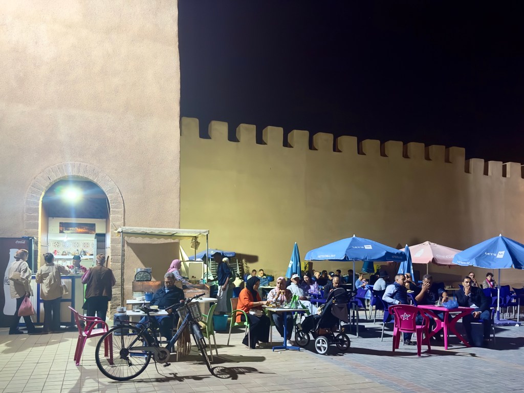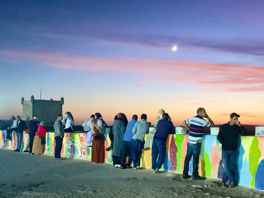 I feel comfortable walking down the narrow streets rimmed with colorful shops, unnoticed among the tourists. But I feel even more comfortable sitting in a central square at a table in an outdoor cafe that serves bowls of bean soup and a moist flatbread that I have still to learn the name of. On Sunday afternoons as the sun is setting the large square between the walls of the Medina, the fort with narrow lanes where I am staying, and the sea wall looking out across the Atlantic to Myrtle Beach, out of sight across the ocean, fills up with people out for a stroll on a Sunday afternoon.