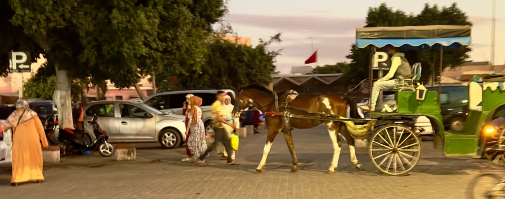 But the overwhelming experience in Taroudant is the streets. As we were circling the city school let out and students on bicycles, like a flock of birds, wheeled into the street and surrounded us, in front and behind and on all sides, riding inches apart as they laughed and chattered. We drove very slowly. But later on as were led by the owner of Airbnb to the main square we noticed that every kind of vehicle from motorcycles to elegant horse drawn carriages to hundreds of bicyclists and people walking filled the streets, with the bicyclists and motor cycles zigzagging in and out at full speed with the slower cars nosing a long, the horse carriages weaving through and the heavy carts pulled along by men like islands in a stream with the traffic flowing around them. Nobody ran into anyone but everything missed everything else by a foot or two.