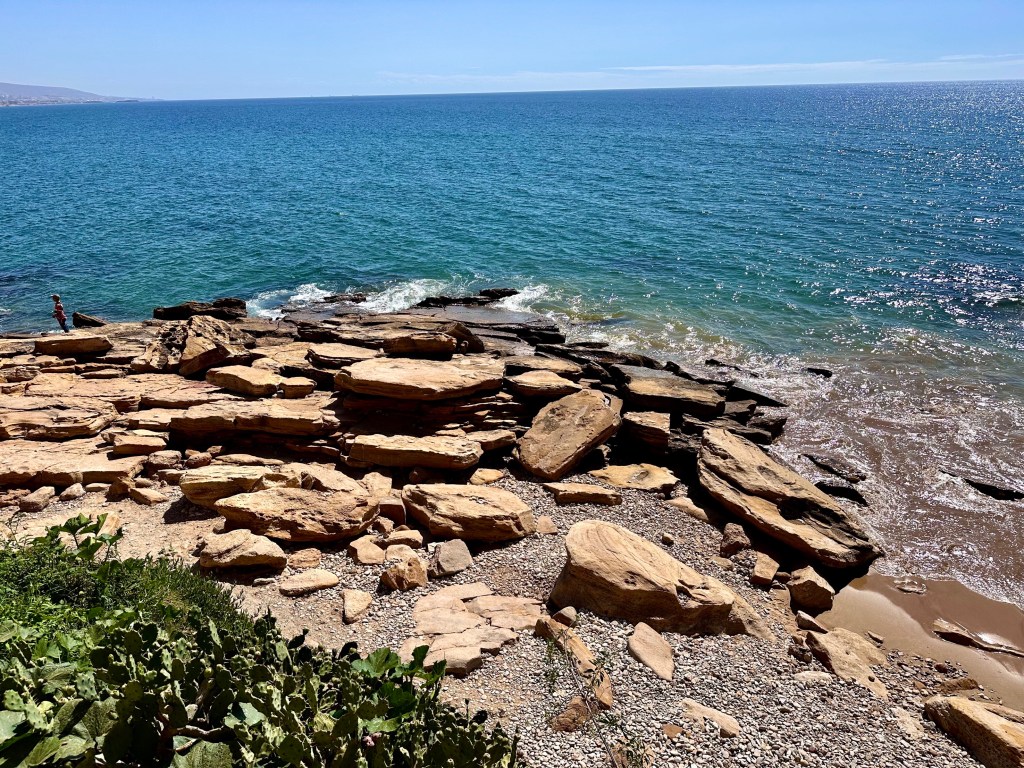 We stopped once to look down on surfers gathered at a cove and then again to eat at a seaside town, Taghazout, a westerner’s surfing town, where we evaded the street sellers and walked down to the water and found Panorama, a restaurant with the waves crashing on the brown rocks below.